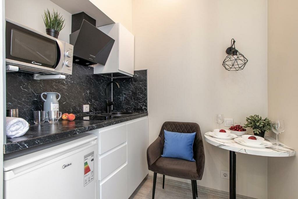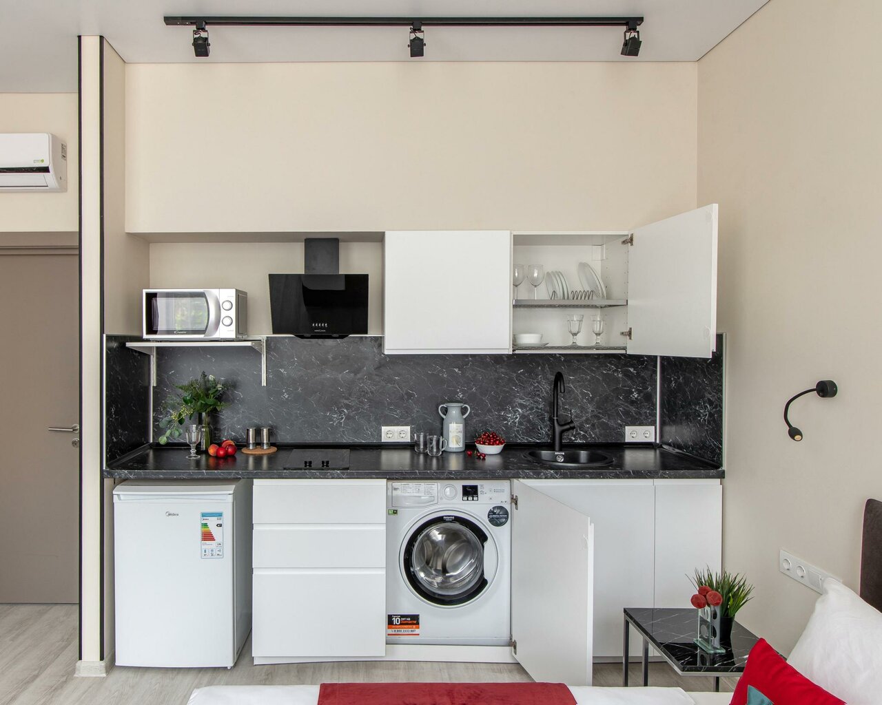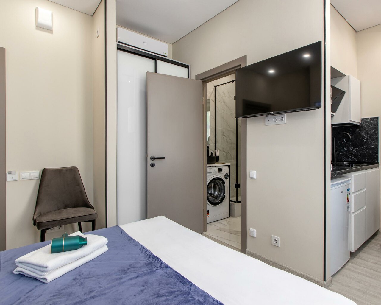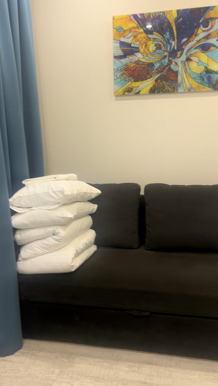 Очень уютно, комфортно. Есть посуда, микроволновка, сейф, халаты, туалетный набор (шампунь, гель, мыло, ватные палочки, зубная щетка, паста, тапочки). Питьевая вода, чай, кофе, сахар. Телевизор с выходом в интернет. Соседей не слышно. Взяли в аренду зонтик. Столовая, магазин, КБ за углом. Очень стильная студия. Мы в восторге. Находится в центре, легко добраться до любой точки. Рекомендуем