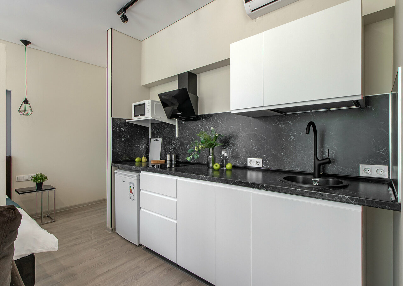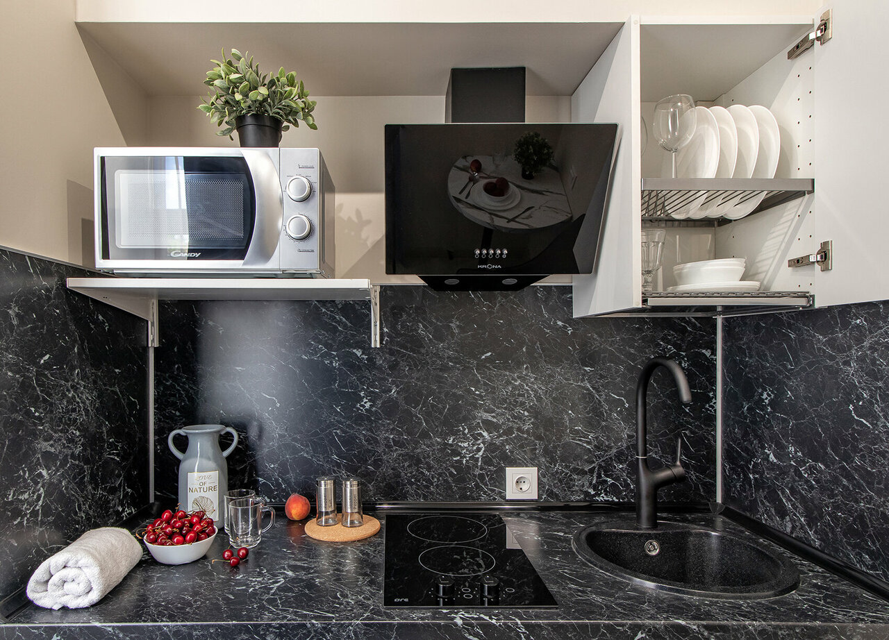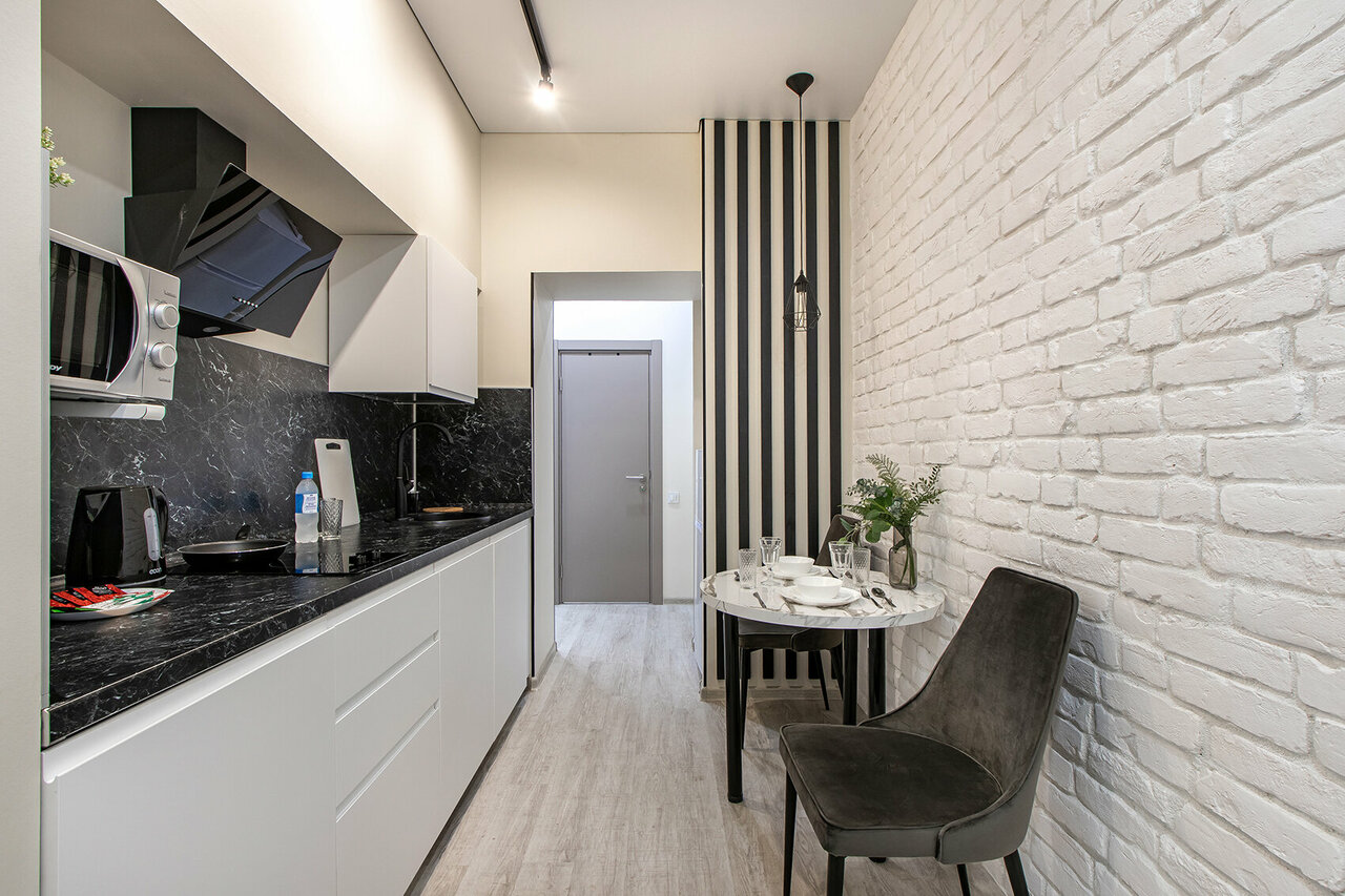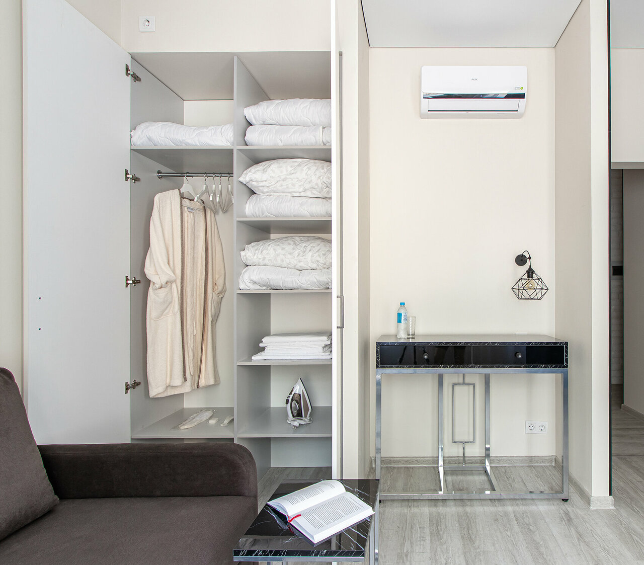 Очень уютно, комфортно. Есть посуда, микроволновка, сейф, халаты, туалетный набор (шампунь, гель, мыло, ватные палочки, зубная щетка, паста, тапочки). Питьевая вода, чай, кофе, сахар. Телевизор с выходом в интернет. Соседей не слышно. Взяли в аренду зонтик. Столовая, магазин, КБ за углом. Очень стильная студия. Мы в восторге. Находится в центре, легко добраться до любой точки. Рекомендуем