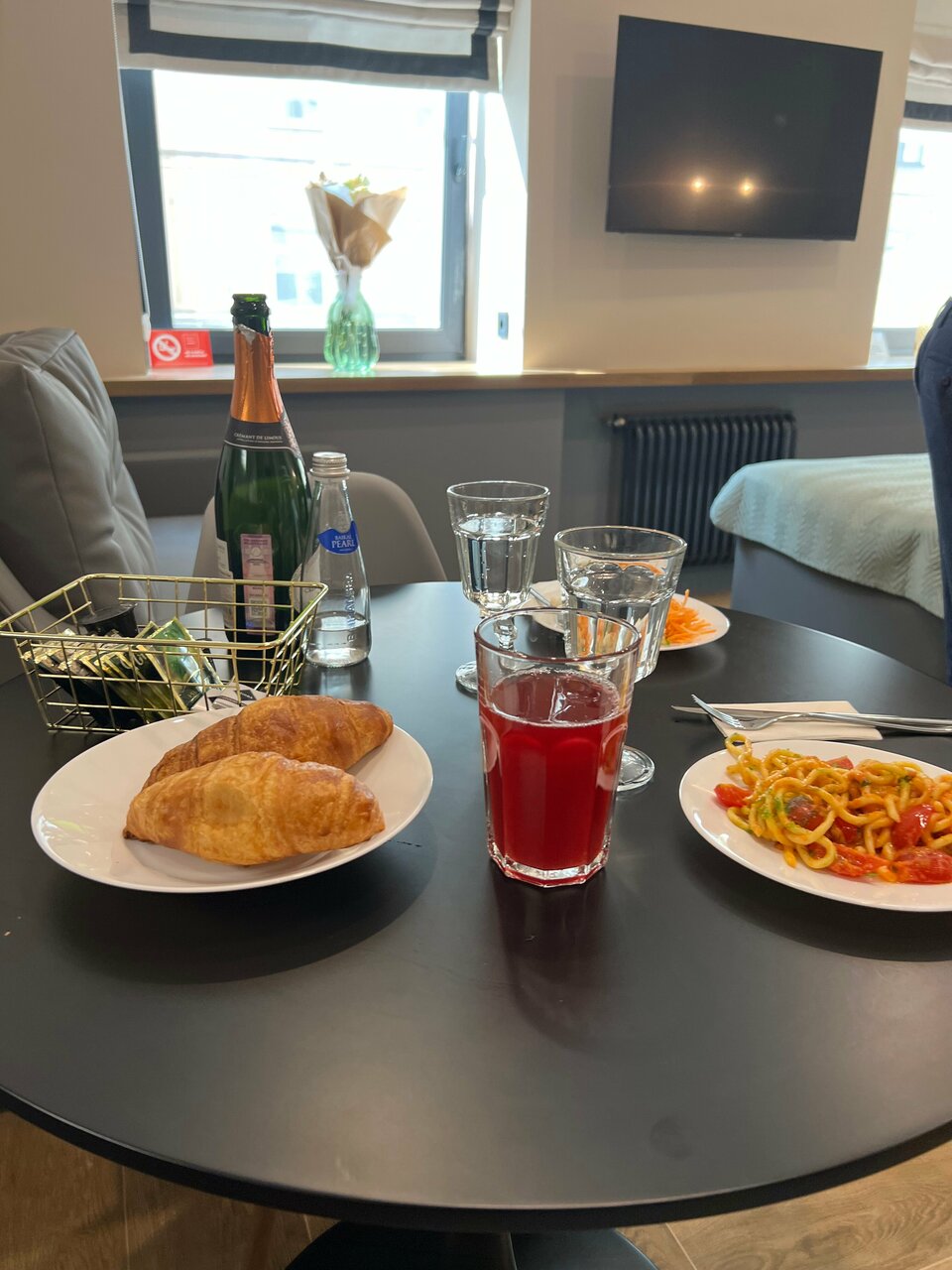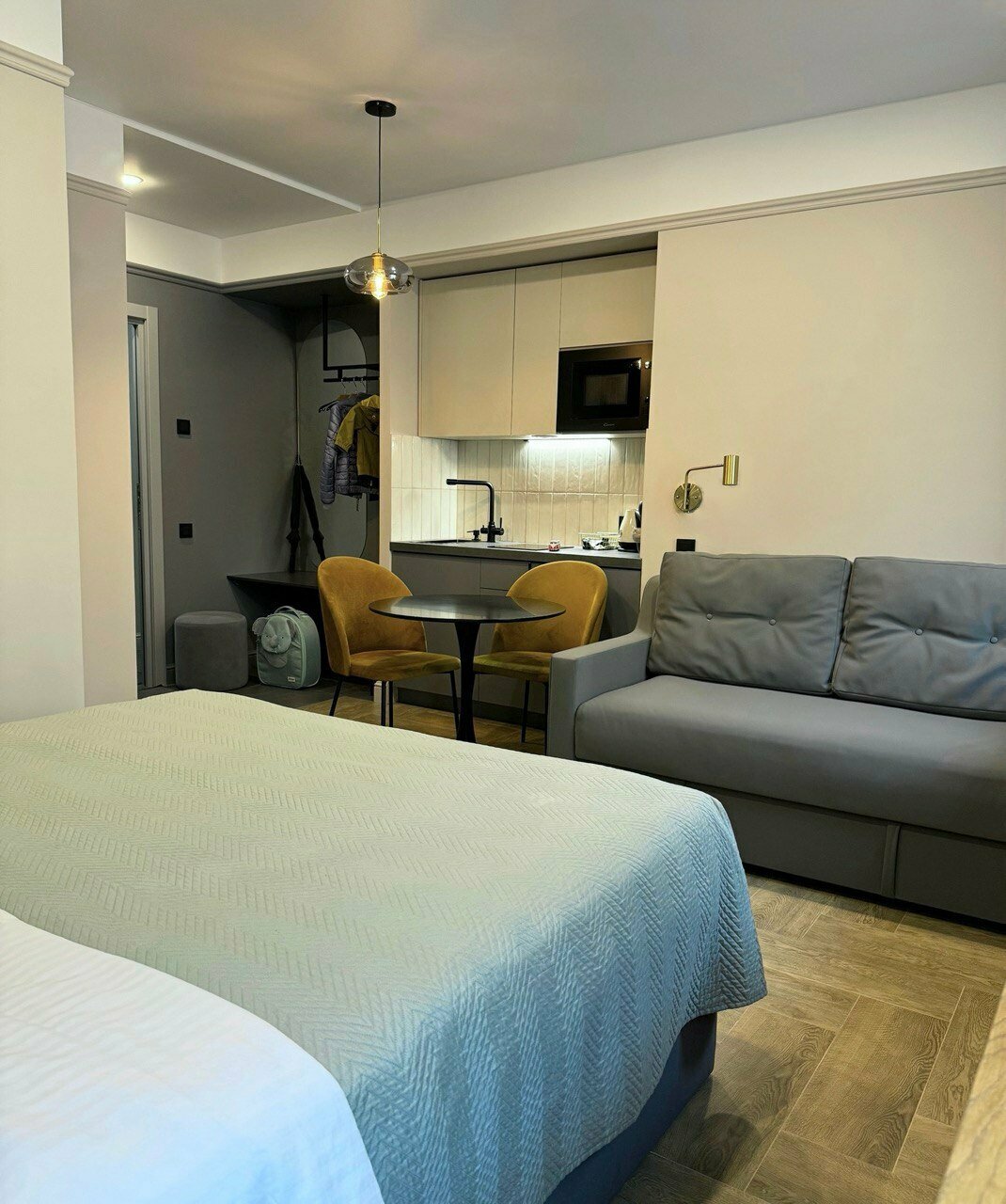 Апартаменты идеальны по соотношению цена/качество. Плюсы: -удобное расположение, и пешком до центра удобно и рядом остановка автобуса -бесплатные камеры хранения до заезда и после выезда -свежий ремонт, приятный интерьер, качественная сантехника -чистота -хорошего качества шампунь и гель для душа, есть одноразовые тапочки, зубной набор -кофемашина с капсулами -звукоизоляция хорошая (ну или соседи были очень тихие) -удобная и оперативная связь через мессенджер -кондиционер Минусы: -подушки очень низкие, надо минимум еще одну на человека -на двоих хотелось бы все-таки 2 одеяла Минусы написала только с целью конструктивной критики, вцелом, остались очень довольны, приедем еще, спасибо)