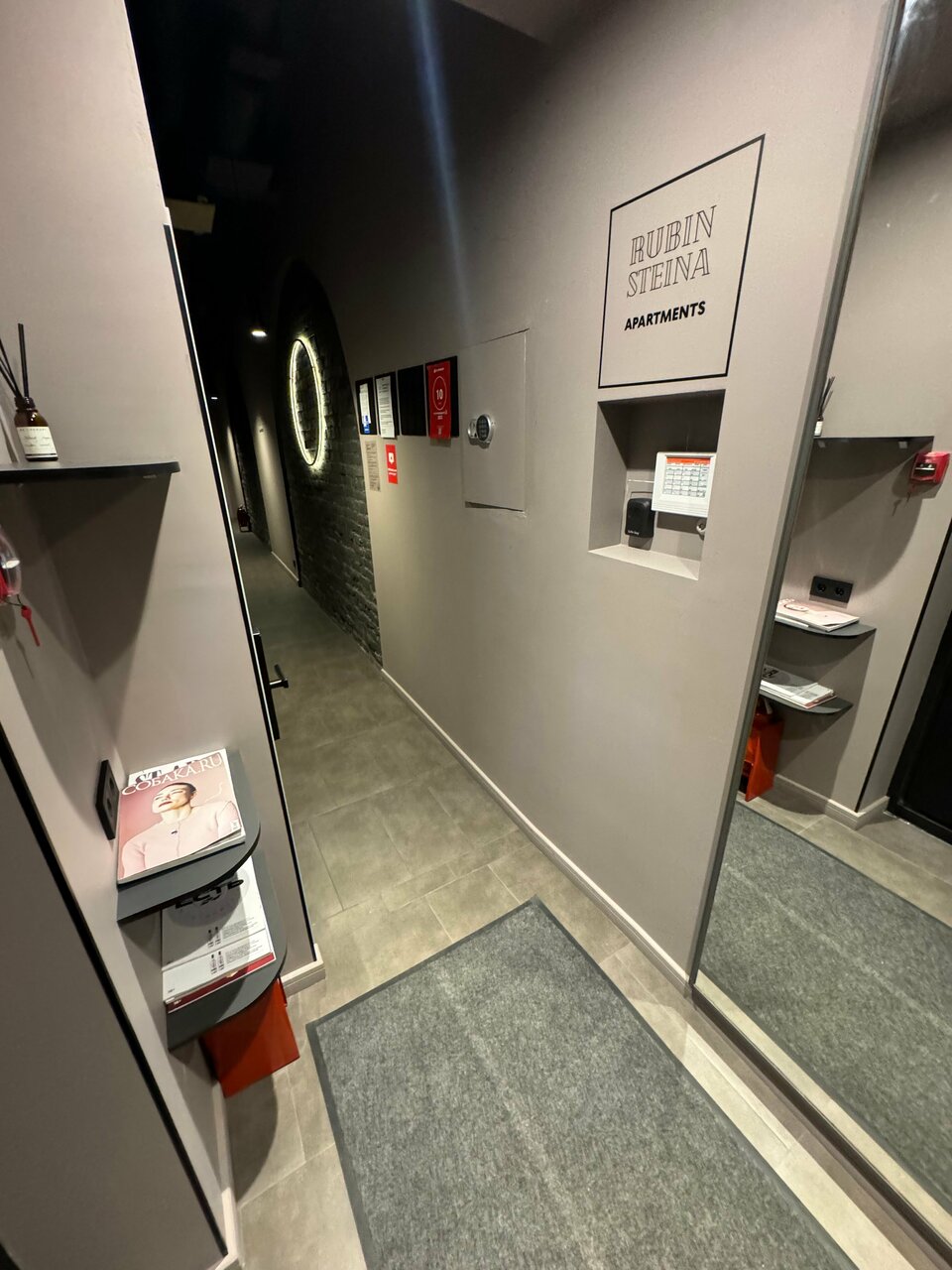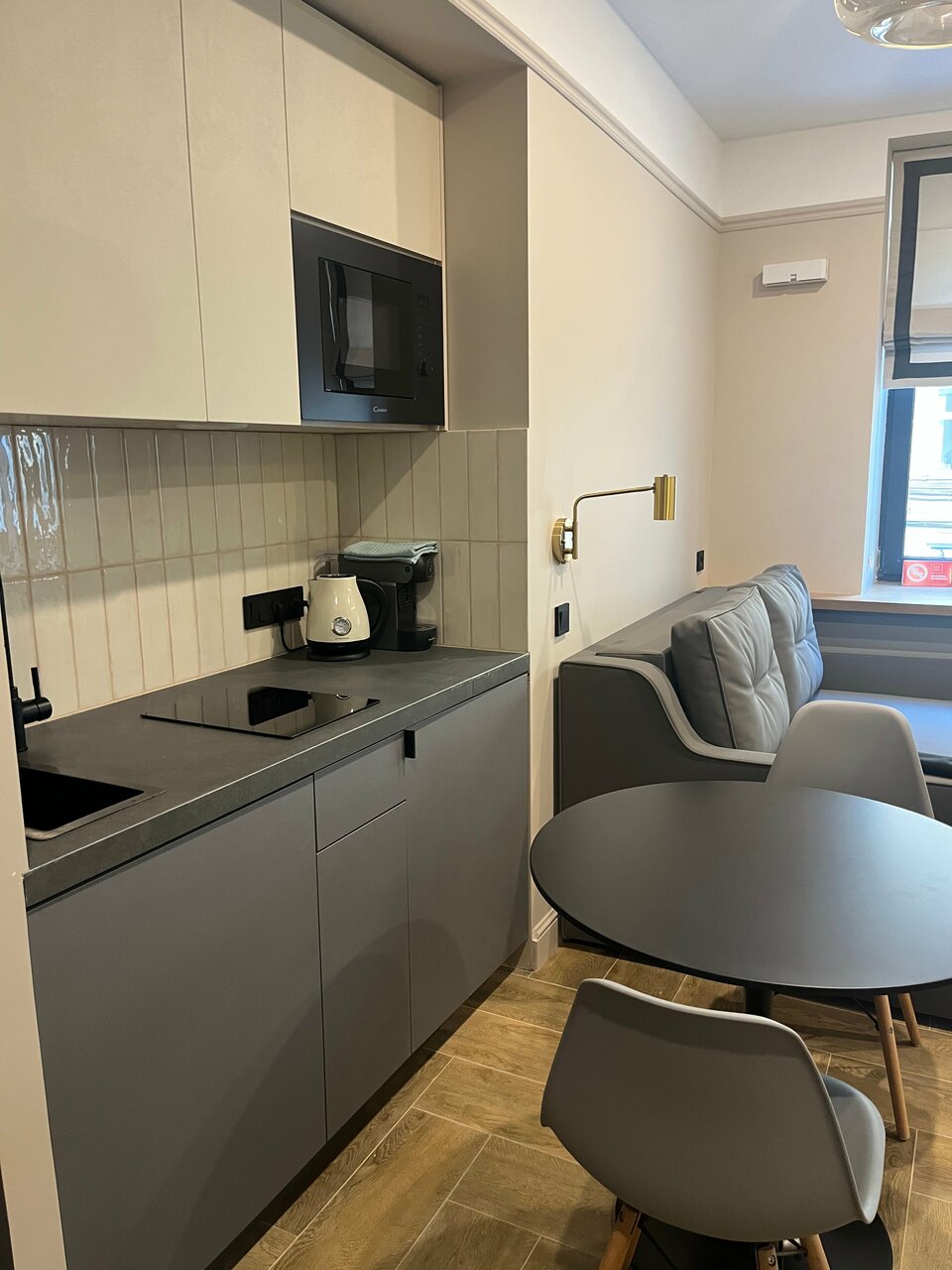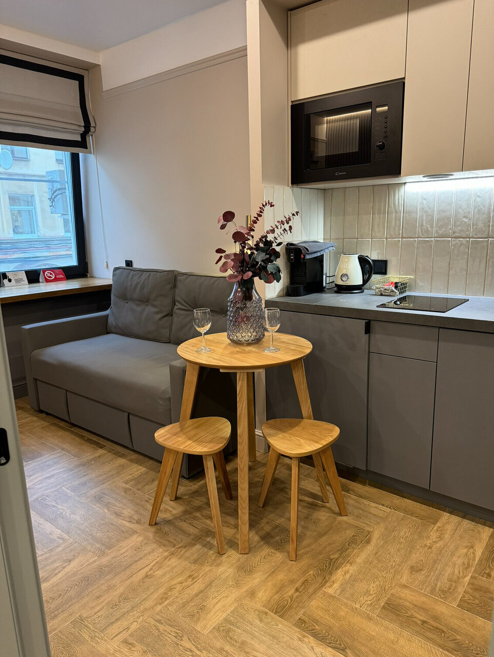 В очередной раз отдыхали в одних из Апартаментов Рубинштейна. В этот раз на Невском, 82. Впечатления только положительные. При относительной компактности все очень эргономично. Дизайн и оснащение комфортны до мелочей. Для меня даже факт наличия длинной прочной ложки для обуви большое удобство. В наличии хороший зонт, что очень практично для нашей Северной столицы. Наличие современной стиральной машины с современным средством для стирки, капсулы для кофемашины, чай, стационарный фильтр с новыми фильтрующими элементами, гладильная доска и т. д. Очень нравится расположение в абсолютном историческом центре. Доступ через систему электронных замков в любое время заезда очень удобен. Тихий, чистый двор, что не всегда отмечается в Питере. Изолированная спальня с удобной кроватью также подкупает. Телевизоры с широкии онлайн контентом. Уже забронировали новую поездку сюда же. Отдельное спасибо за оперативность и приветливость онлайн администратору!