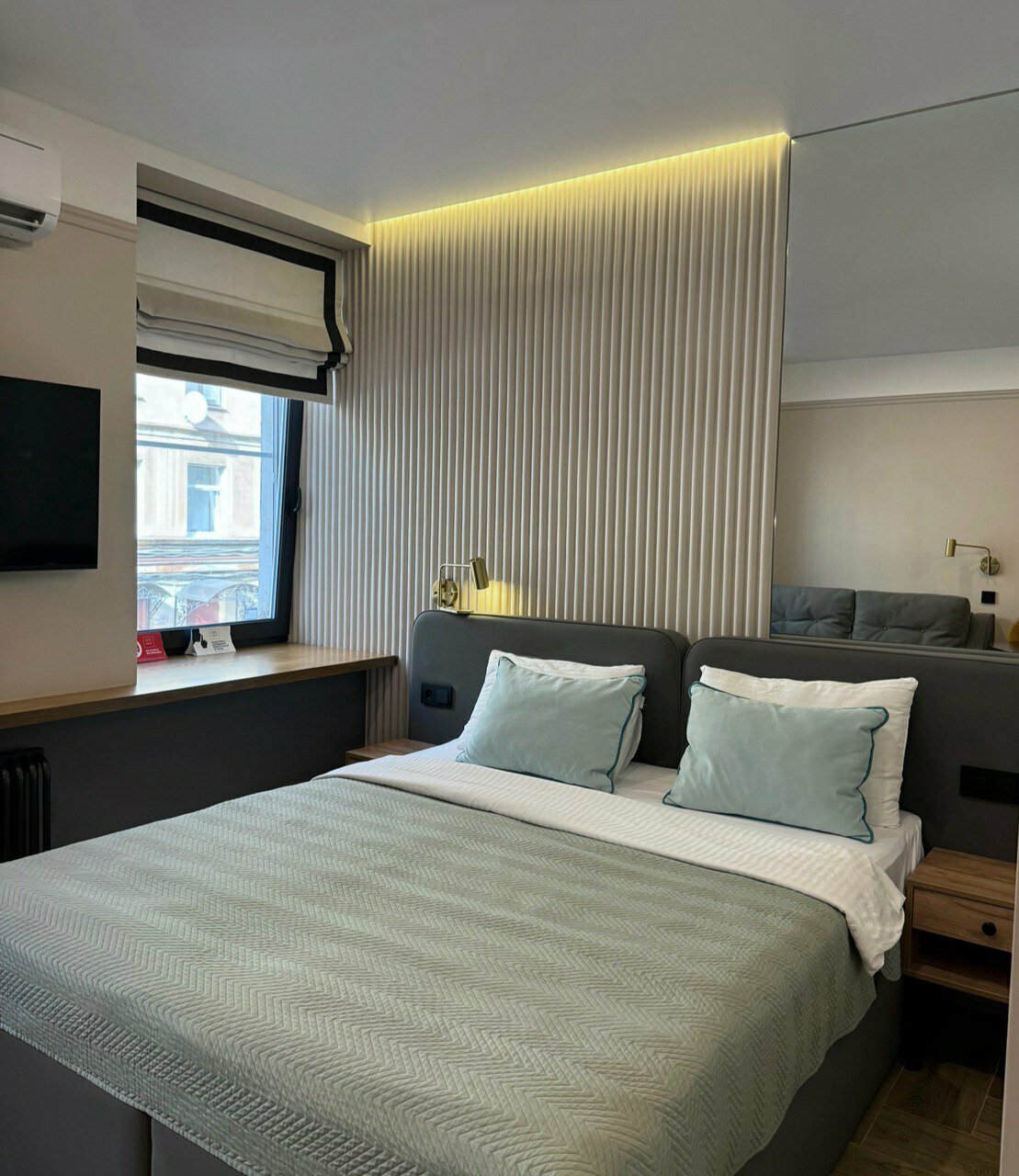 Минусы: Жёсткий матрас Плюсы: Очень красивый номер, есть расходники в виде кофе чая сахара, шампуней даже зубных щеток. Очень радует наличие питьевого фильтра. Редко смотрим телевизор но даже пару раз воспользовались телевизор с подпиской и ютубом. Удобное расположение, буквально в центре Питербурга. Цена повыше чем у других аналогов, но мы не пожалели не копейки, обязательно вернёмся летом т.к не успели все посмотреть))