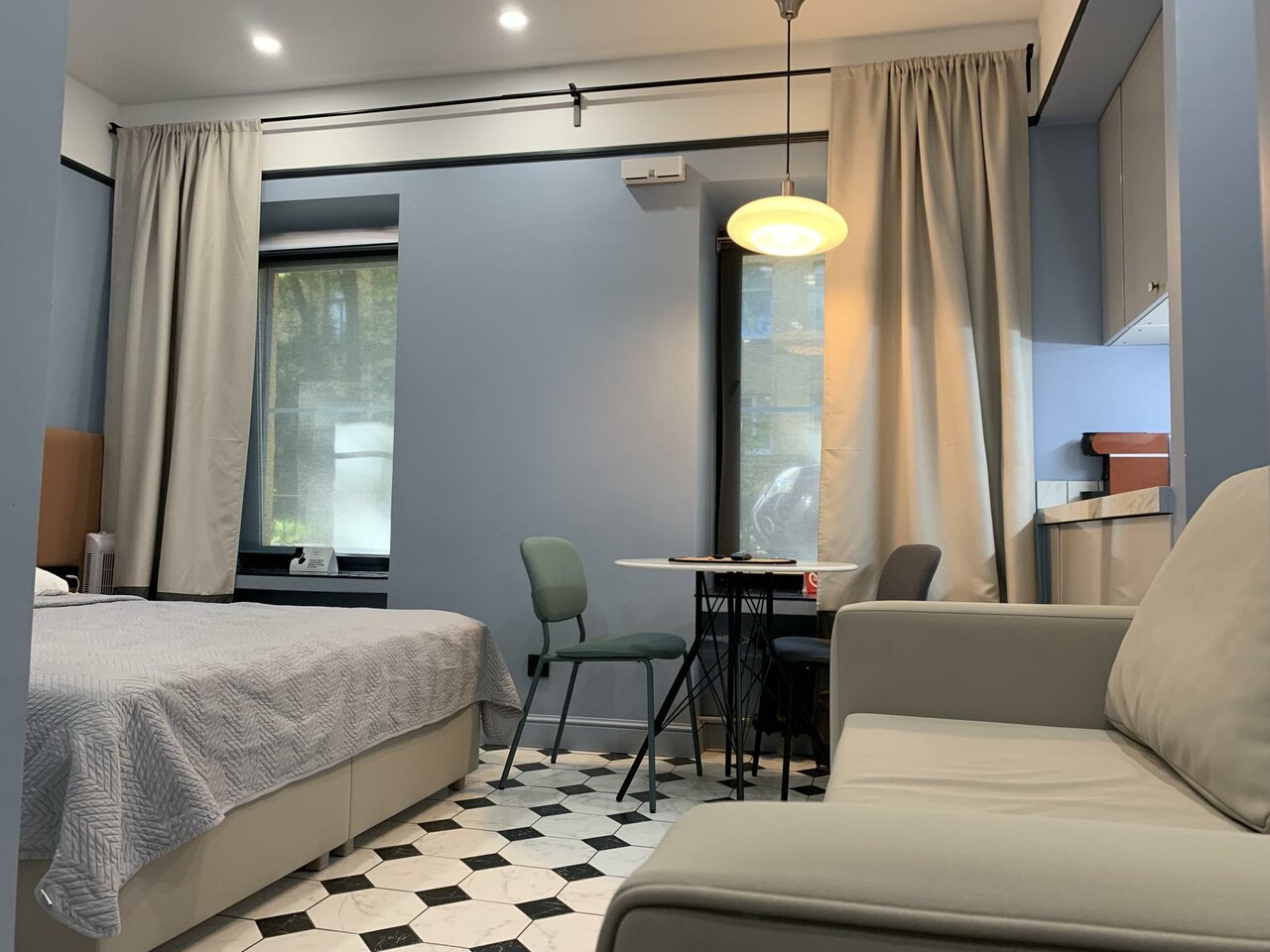 Останавливались на 5 ночей, впервые в таком формате, когда не видим ни кого из обслуживающего персонала, сначала непривычно, но все понравилось :очень чисто, как будто до нас никто не жил, все необходимое есть, техника новая, все отлично работает, администратор всегда на связи, ответит на все вопросы и поможет в случае необходимости. Чего не хватило-столика для завтрака или хотя бы круглый разнос на банкетку, что бы можно было перекусить. Есть столик, но он упирается в стену и поесть за ним не комфортно. Остальное все отлично. Спасибо большое!!!