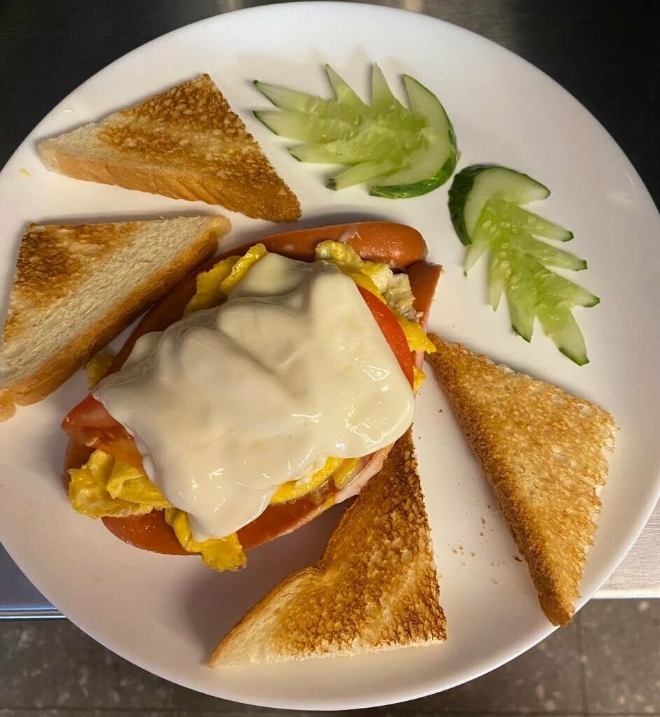 Еда неплохая,в номере все по минимуму,шампунь есть,кондиционера и зубной пасты нет,вода только в день заселения,халат на сайте заявлен,по факту-нет.Также в услугах на сайте вызов такси,администратор заявила,что это они не делают.