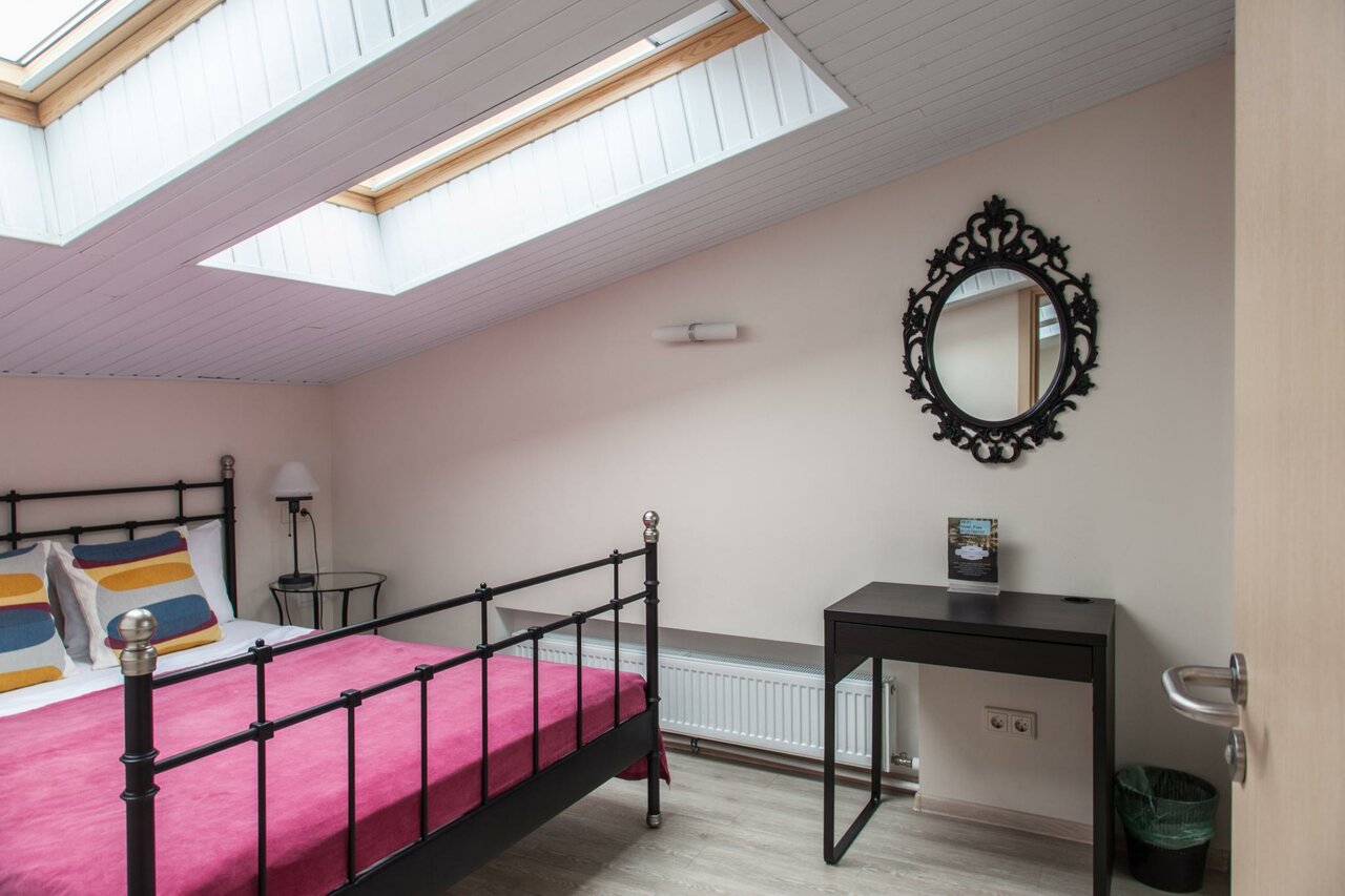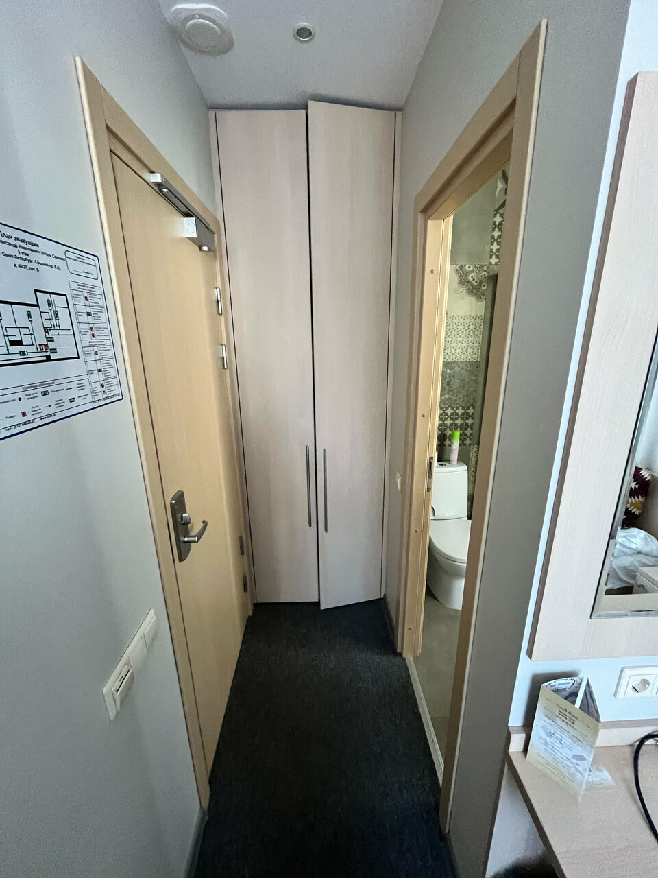Очень просторный номер. Прикольное овальное окошко (мы взяли номер на мансарде). В номере есть все необходимое. И даже огнетушитель