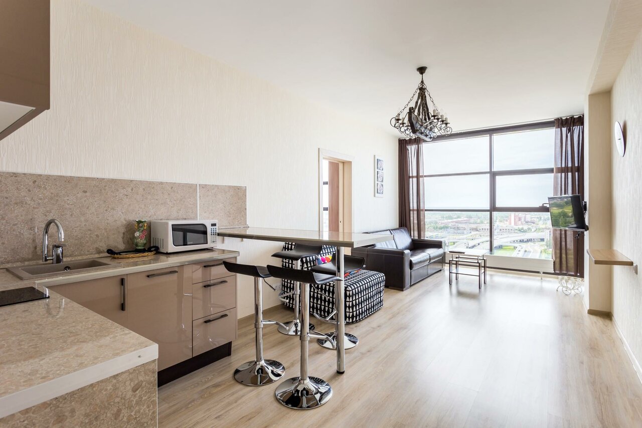 Апартаменты категории Люкс с панорамным видом. В номере есть кухня с духовым шкафом, холодильником, плитой и чайником. Ванная комната оборудована душевой кабиной и бойлером.