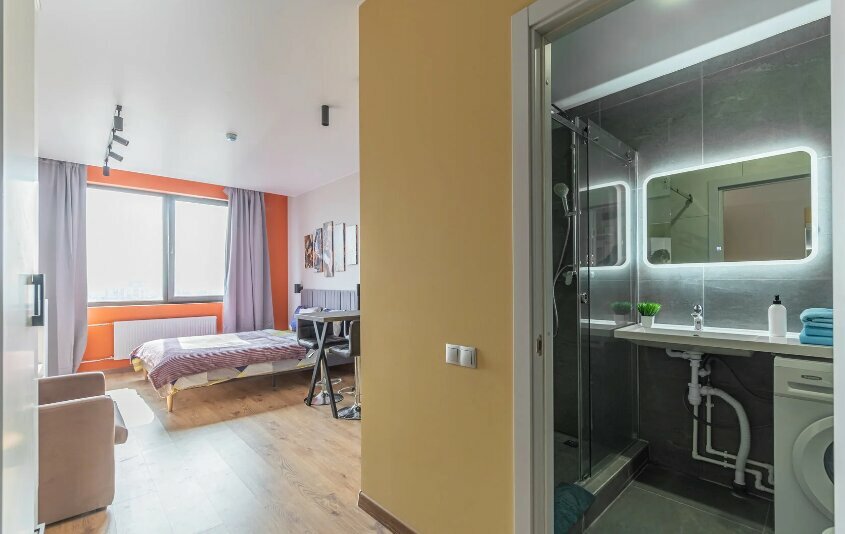Очень удобные студии полностью оборудованы для комфортного проживания. Есть все кухня, посуда, чай, кофе, утюг, стиральная машина, сушилка. До метро Автово пешком 7 минут. Всем рекомендую