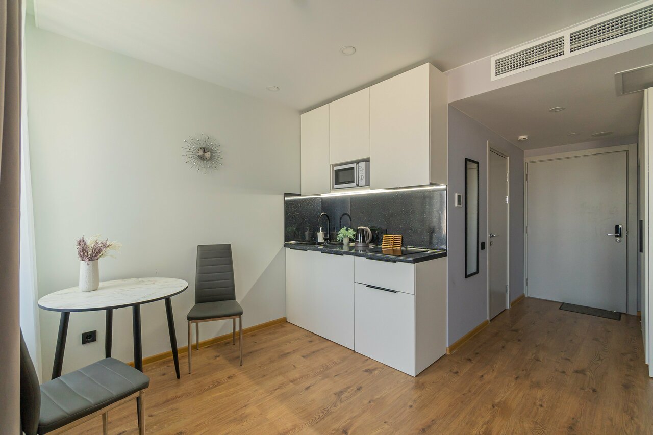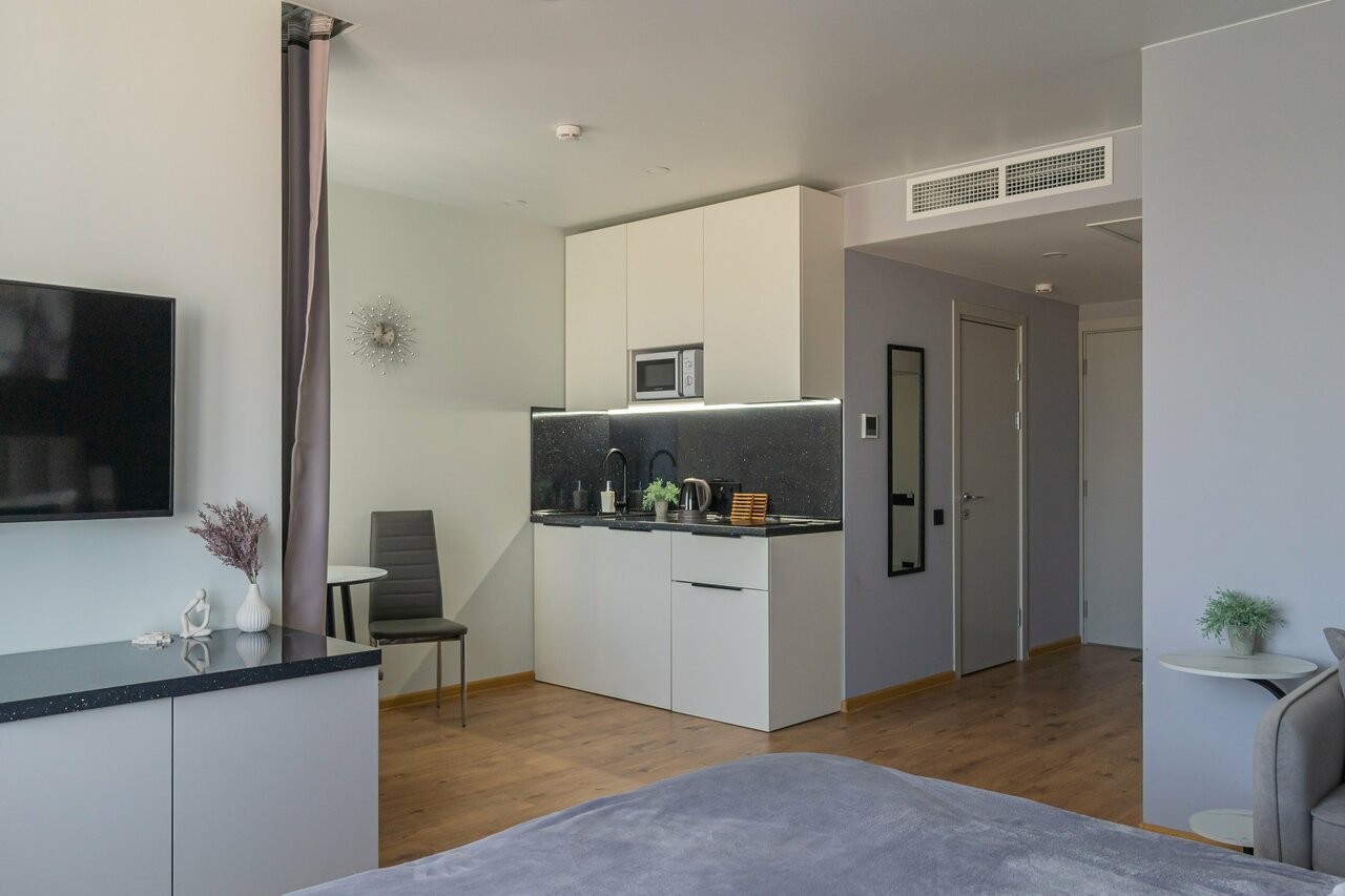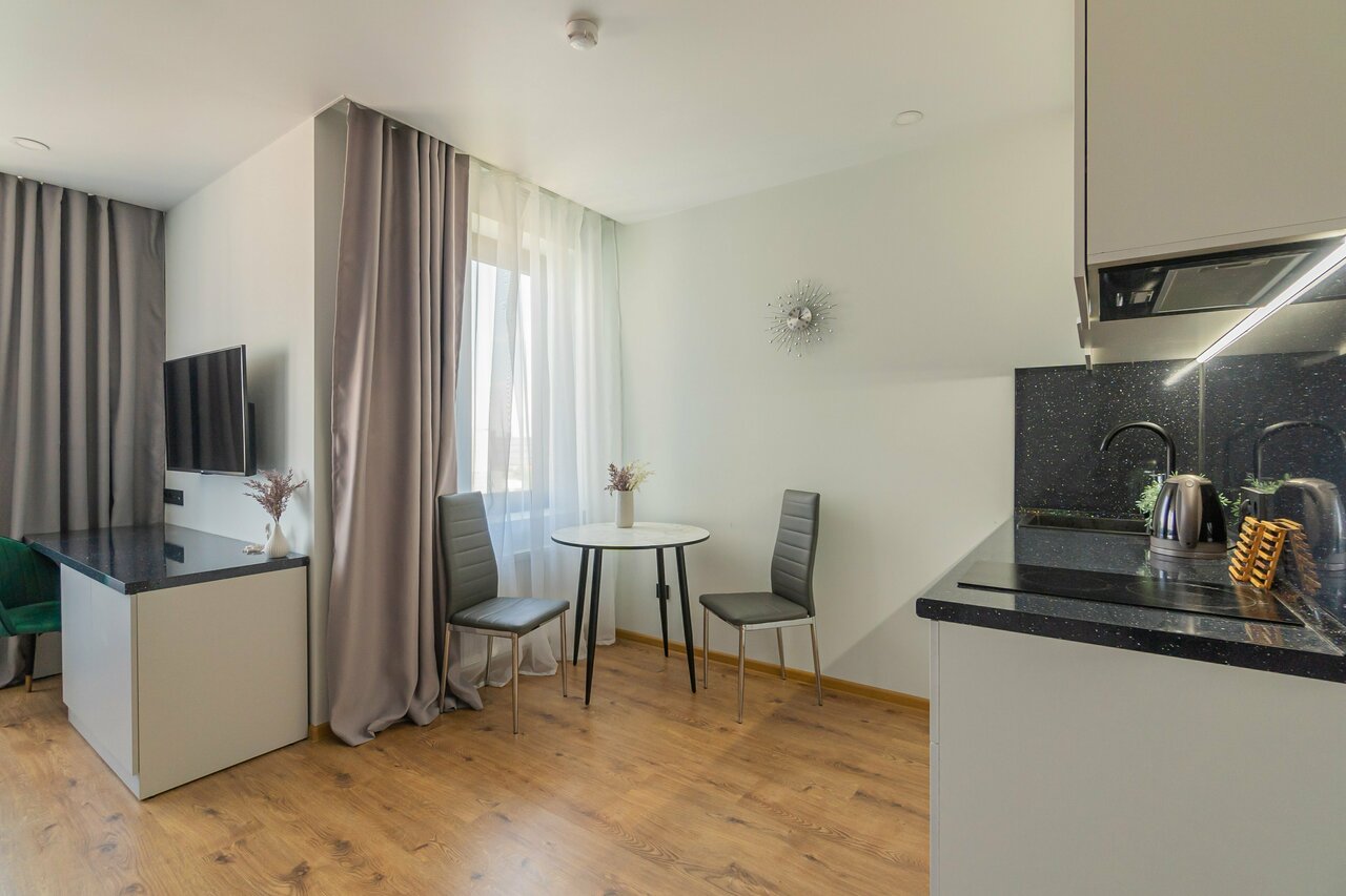 Очень понравился апартамент номер новый комфортный Отличная планировка состоит из 2- х зон кухня и спальня Чисто уютно В номере есть все необходимое удобная локация До метро 5-7 минут там же автобусы в любое направление мы вообще ходили пешком На 1 этаже отличный ресторанчик кофейня магнит На 2 этаже парикмахерская Рискнули подстричься Мастер турок очень остались довольны всем рекомендую цена качество соответствует
