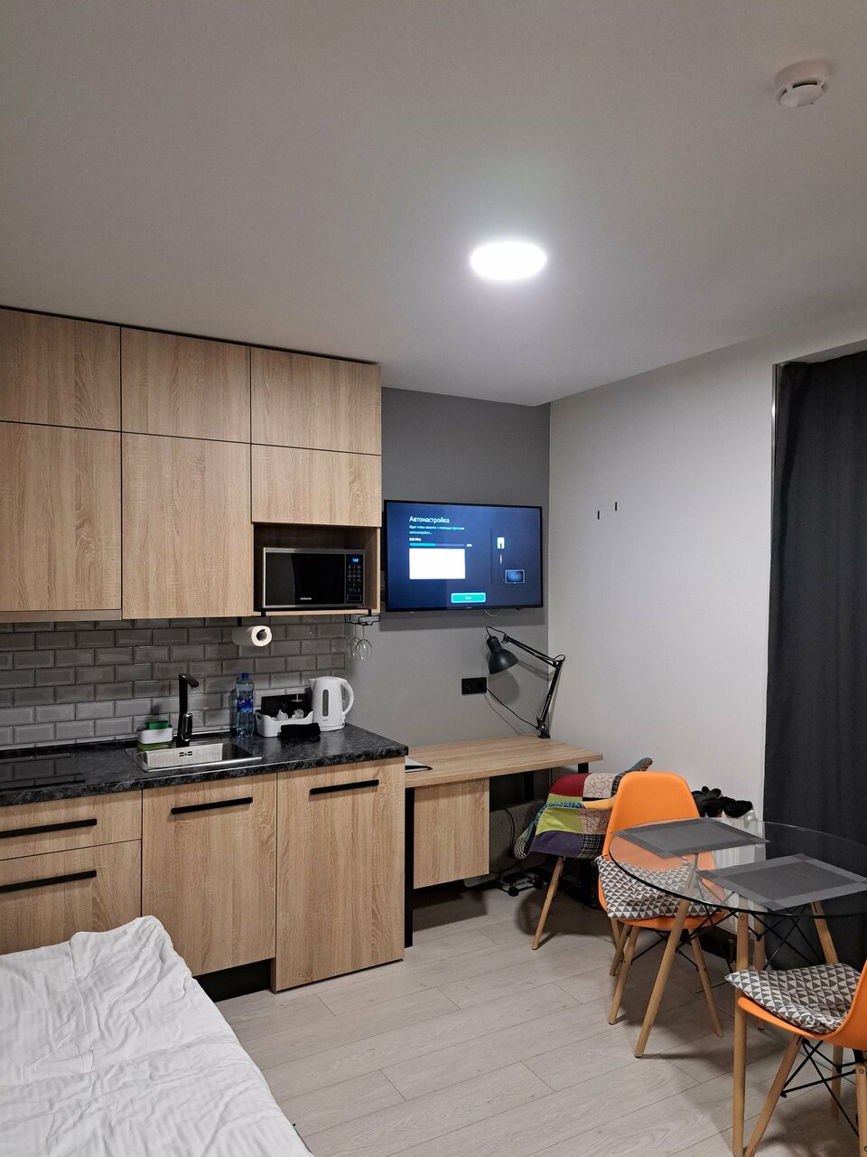 Отличное место, тихо спокойно и чисто. В номере есть все вплоть до ниток и иголок. Но если будете пользоваться стиральной машинкой берите с собой капсулы для стирки. Есть сушилка ,утюг , посуда необходимая для готовки. Холодильник. Внизу на 1 этаже есть кофе в магазине Зелинский ,а так же соседняя дверь от апарт отеля есть магазин вкусвил. Всегда можно купит готовое и разогреть. Комнаты хорошо проветриваются , не сказала бы что холодно ,но тёплый пол не везде работает. Тапочки в номере есть одноразовые. Белье и полотенца чистые. Заселение прошло быстро . До остановки не далеко, есть платная парковка . На ужин есть куда сходить тоже рядом.