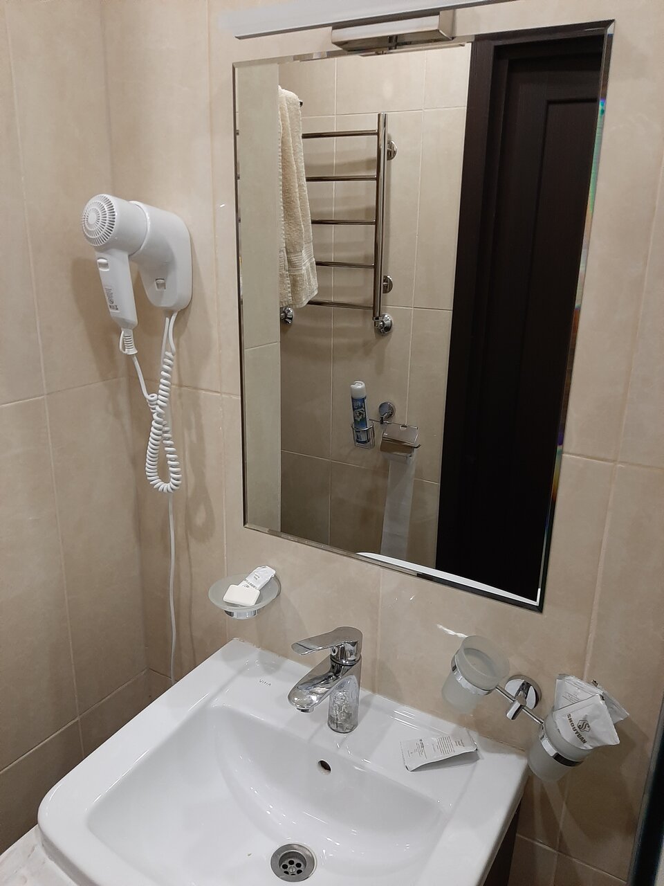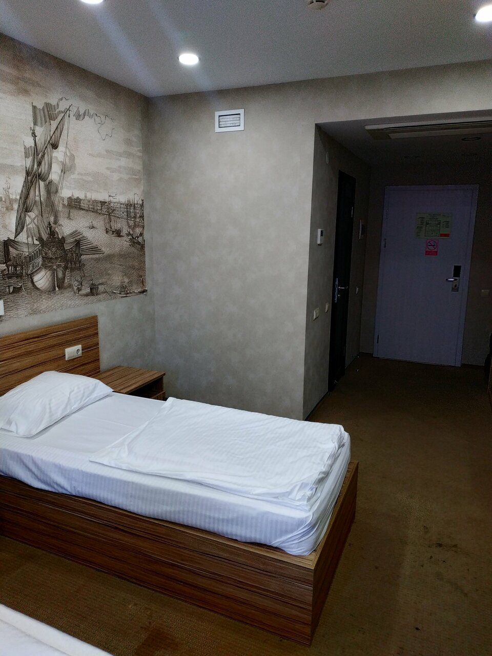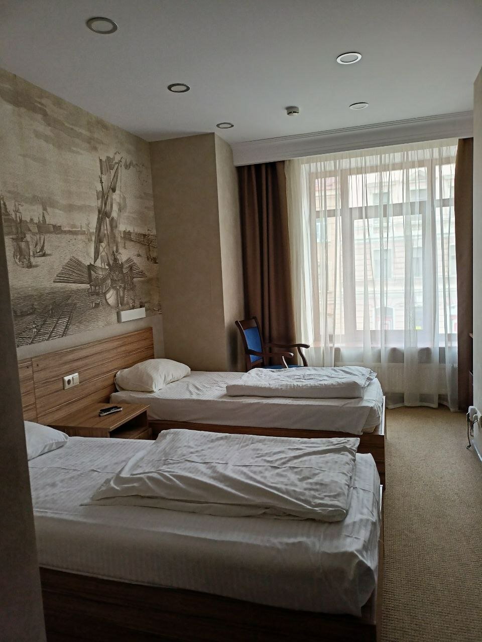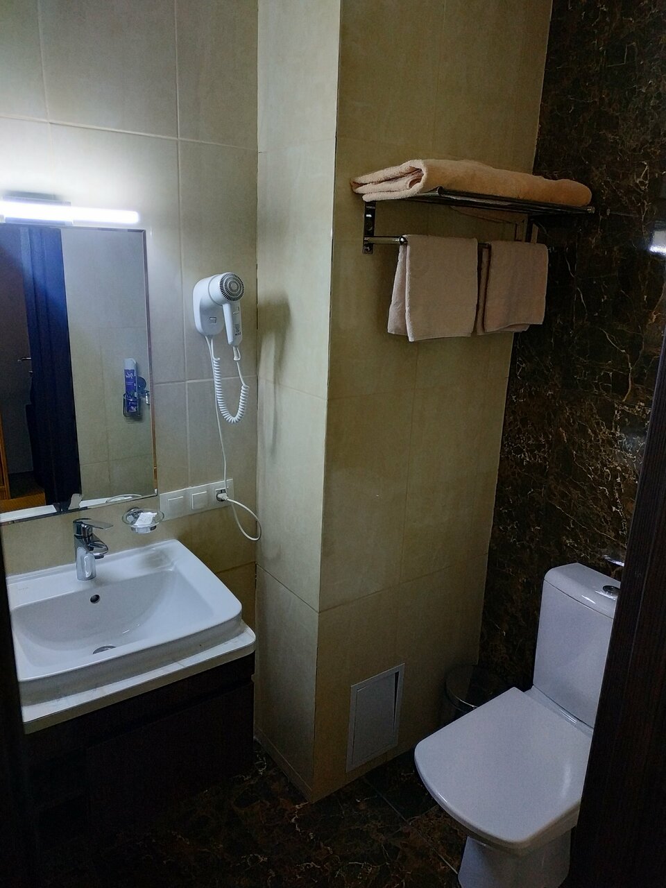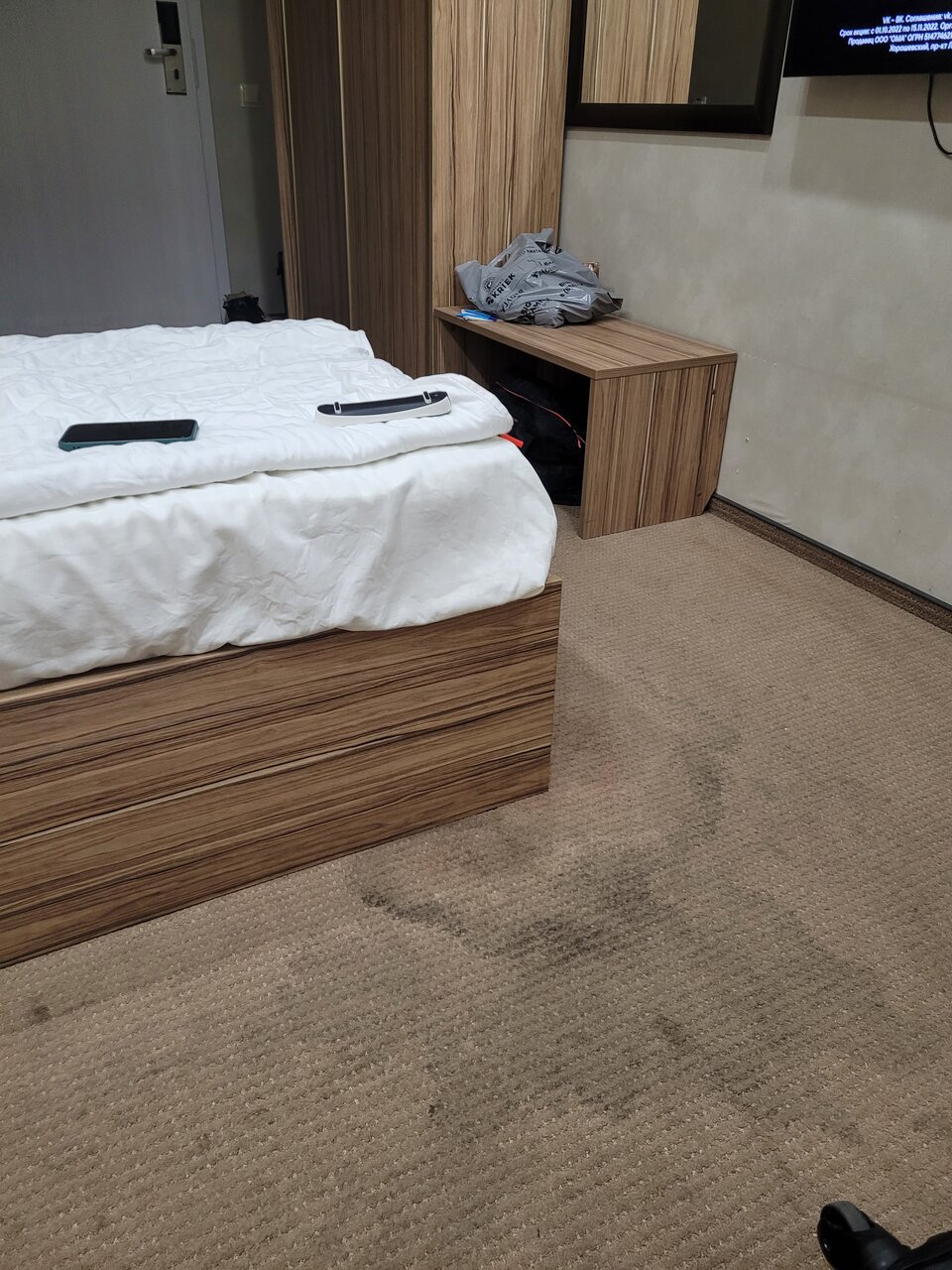 На фасаде отеля 4 *,но Чистота в номере оставляет желать лучшего. К санузлу вопросов нет- чисто, свежо , блестит. В комнате на полу ковровое покрытие светло-коричневого цвета, которое ни разу не видело качественной чистки. Все в пятнах и по периметру пылевые комочки. Полотенец в отеле 4* должно быть по 4 штуки на каждого постояльца, а приносили только по 3, хотя этого все же хватало вполне. Уборку делали регулярно с заменой белья и полотенец, здесь все в порядке. Кровати чистые, на матрасе защитный чехол. В номере нет ни чайника, ни холодильника, только кулер в общем холле. Светильников и розеток достаточно. Есть телевизор, с каким-то специфическим управлением/ показывает только Ютюб. Расположение удачное, напротив отеля остановка общественного транспорта- добраться в любую точку города не составит труда. В целом, жить можно. Если внимательней отнесутся к чистоте-гости будут довольны. По ощущениям сервис на четверку, но одну звезду снимаю за ковролин.