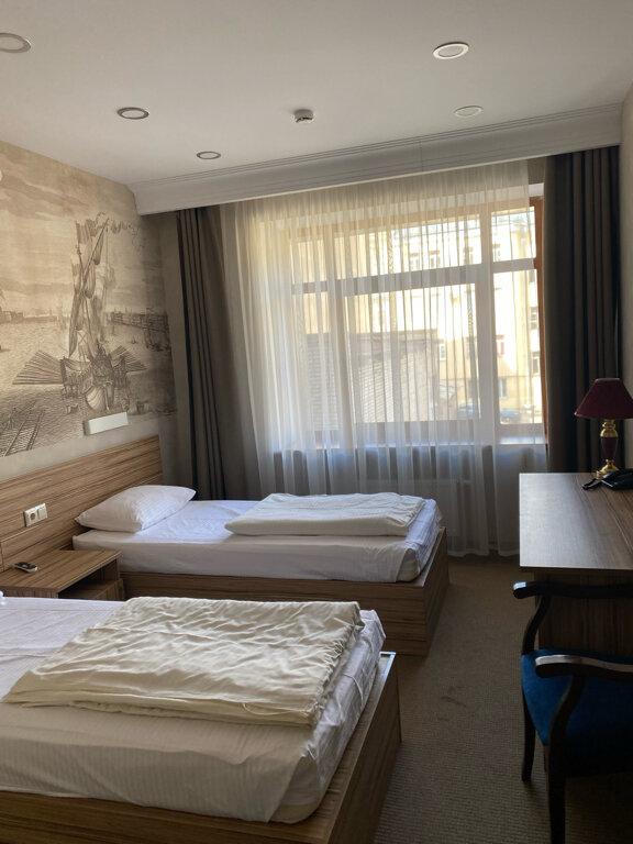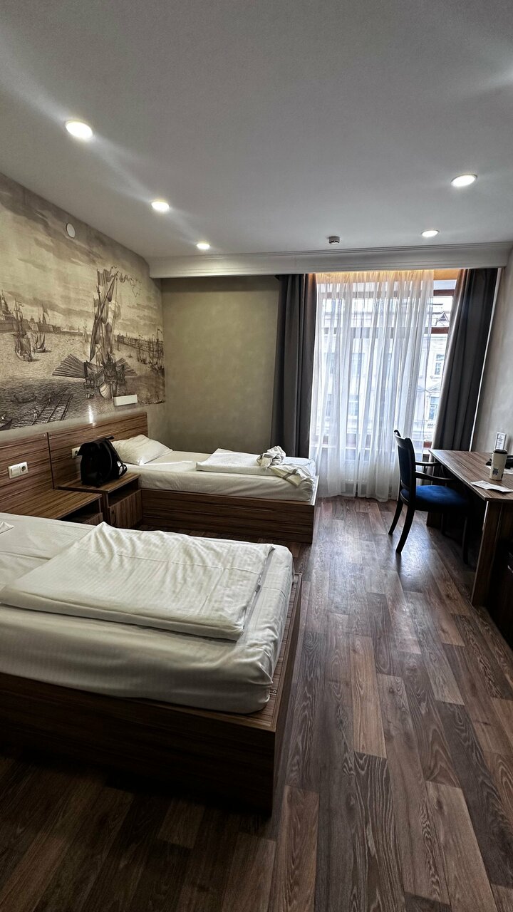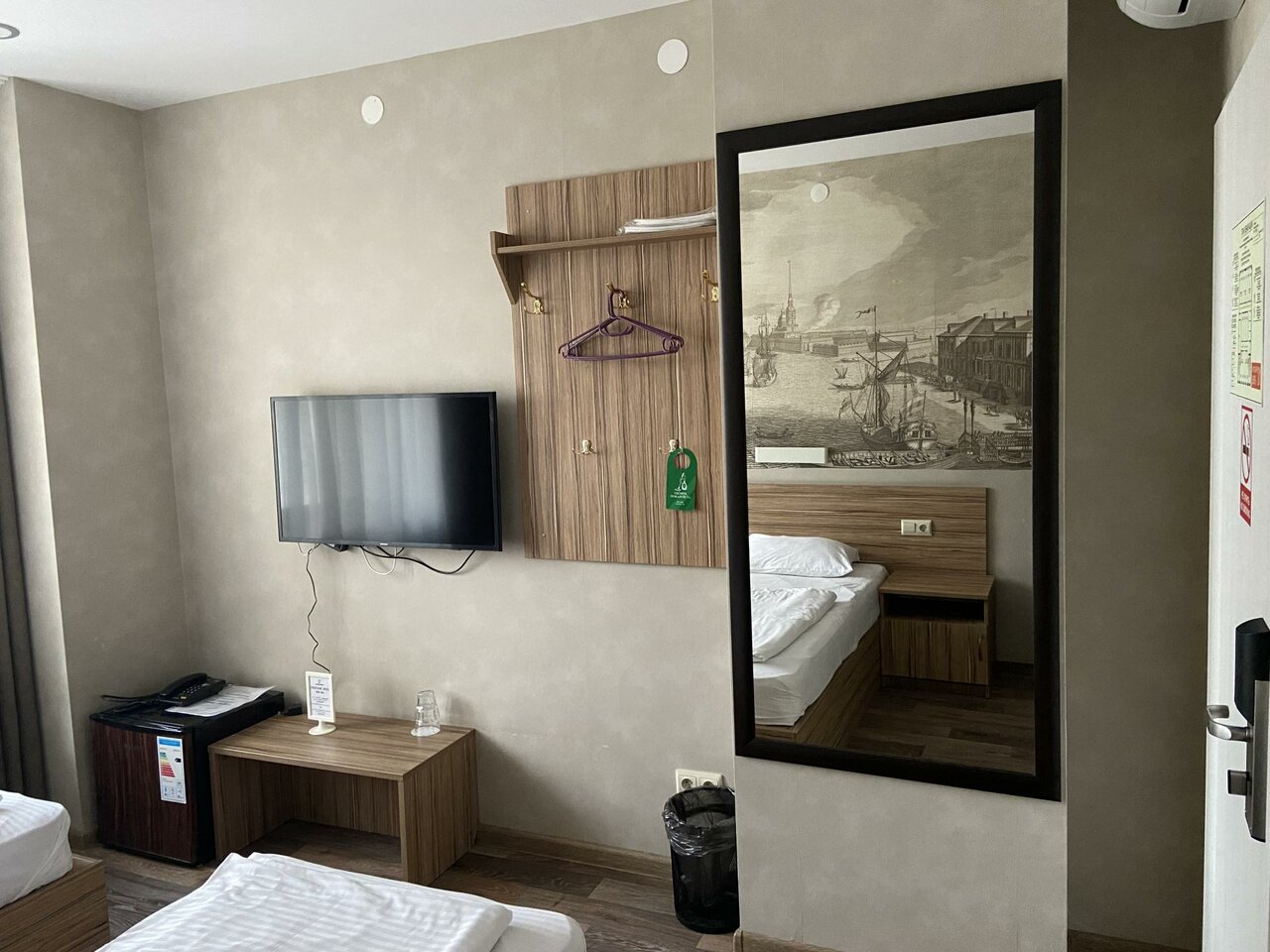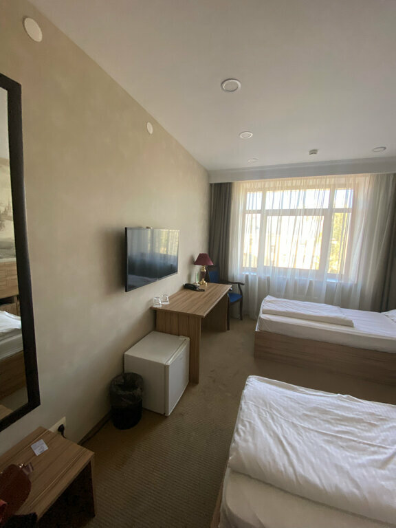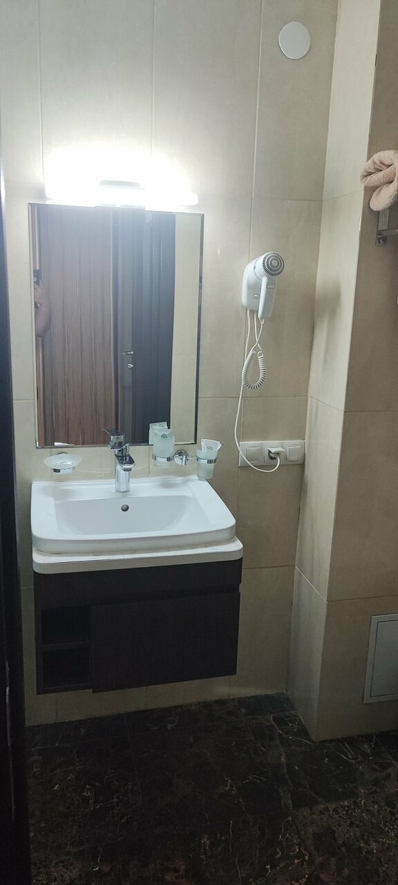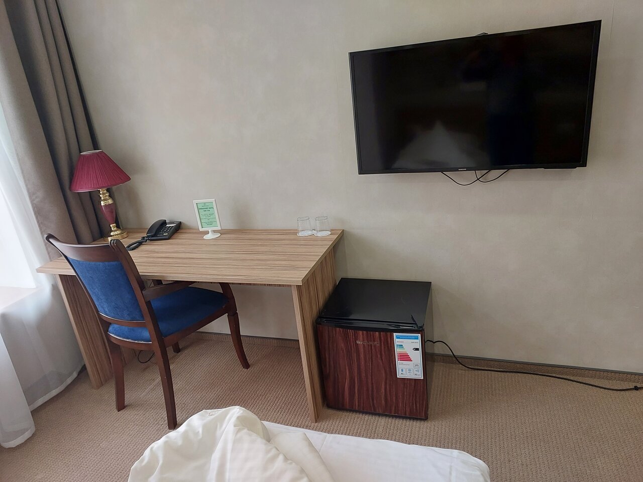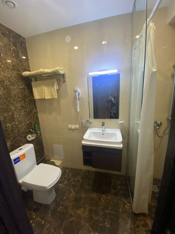 На фасаде отеля 4 *,но Чистота в номере оставляет желать лучшего. К санузлу вопросов нет- чисто, свежо , блестит. В комнате на полу ковровое покрытие светло-коричневого цвета, которое ни разу не видело качественной чистки. Все в пятнах и по периметру пылевые комочки. Полотенец в отеле 4* должно быть по 4 штуки на каждого постояльца, а приносили только по 3, хотя этого все же хватало вполне. Уборку делали регулярно с заменой белья и полотенец, здесь все в порядке. Кровати чистые, на матрасе защитный чехол. В номере нет ни чайника, ни холодильника, только кулер в общем холле. Светильников и розеток достаточно. Есть телевизор, с каким-то специфическим управлением/ показывает только Ютюб. Расположение удачное, напротив отеля остановка общественного транспорта- добраться в любую точку города не составит труда. В целом, жить можно. Если внимательней отнесутся к чистоте-гости будут довольны. По ощущениям сервис на четверку, но одну звезду снимаю за ковролин.