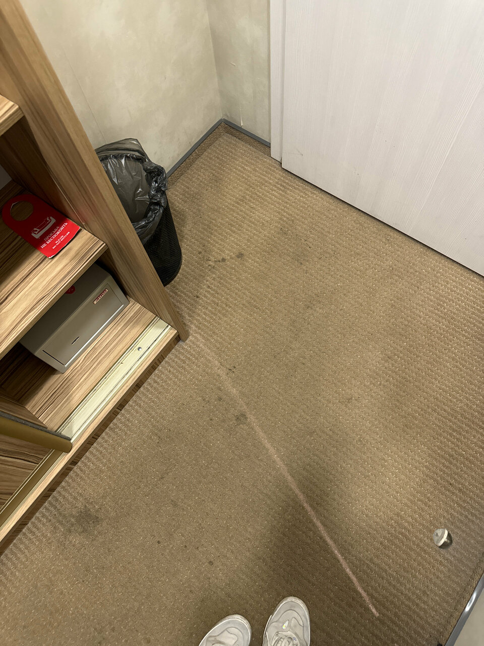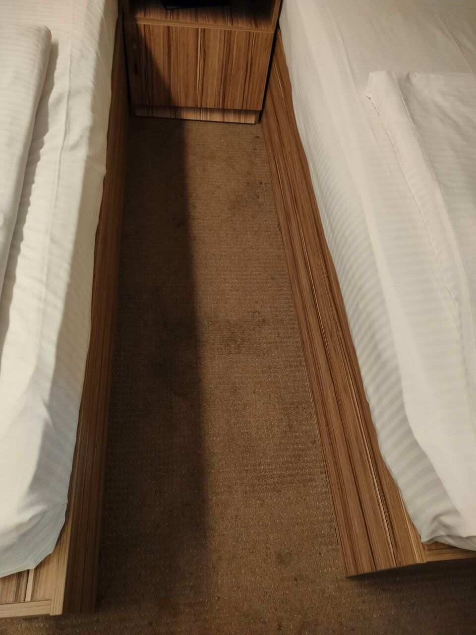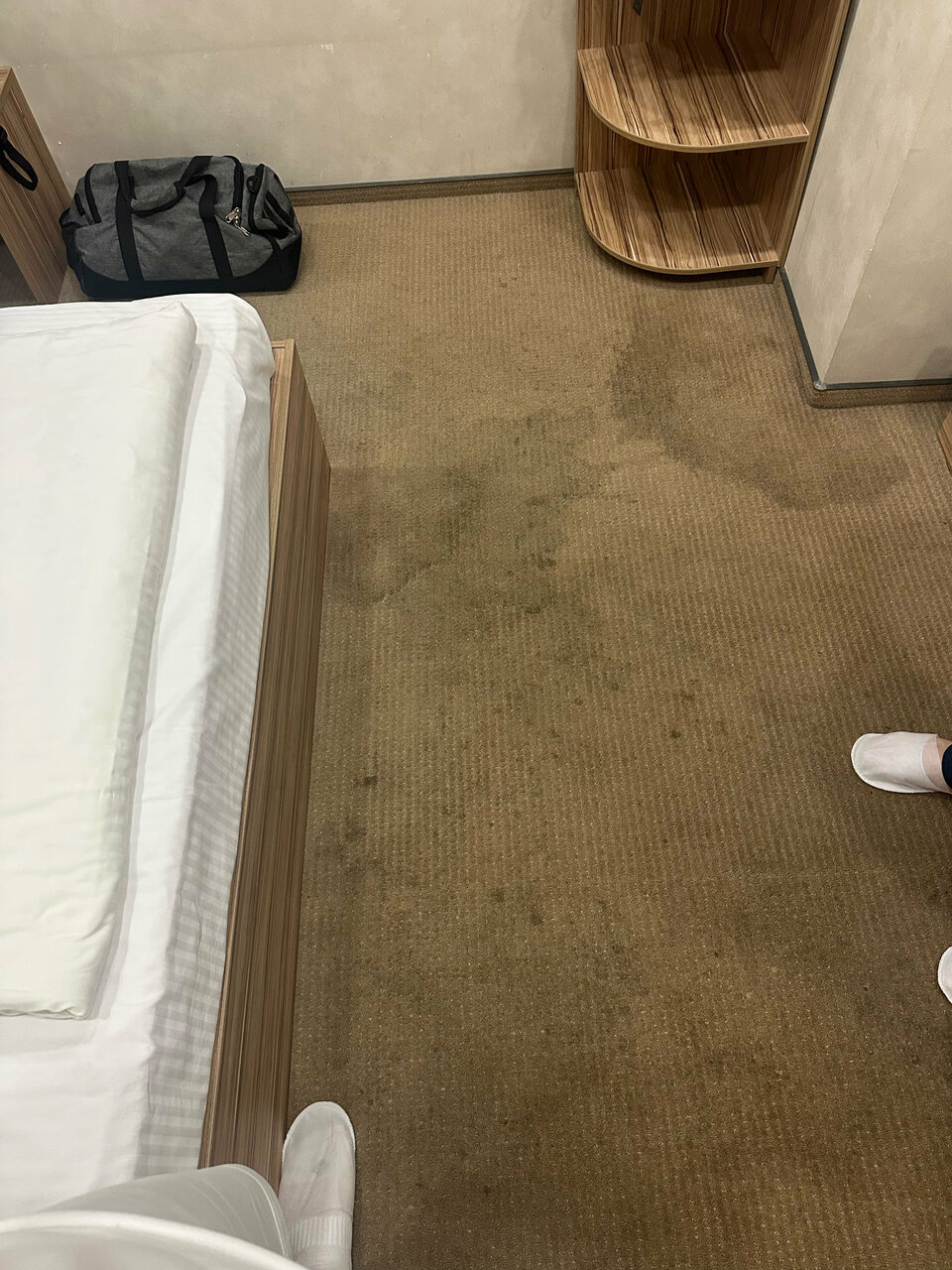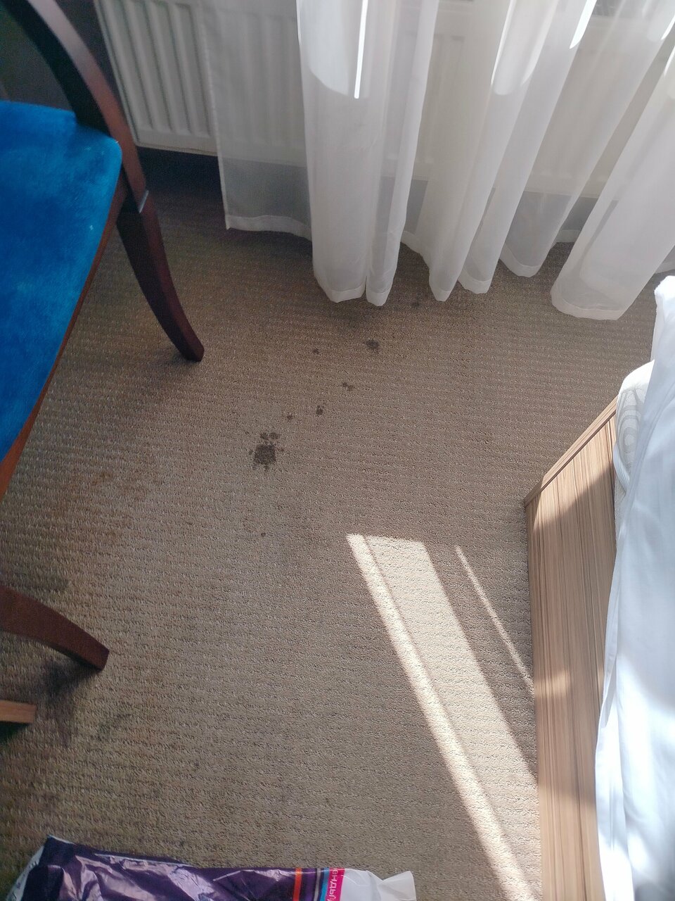 Сразу при заезде предупреждают, что ковролин везде в пятнах, его мыли, но отмыть не смогли. Уборка своеобразная. Поменяли только полотенца, а постель не убрали. Ресторан закрыт, завтраков никаких нет, только кофе автомат. Не 4 звёзды ни разу.