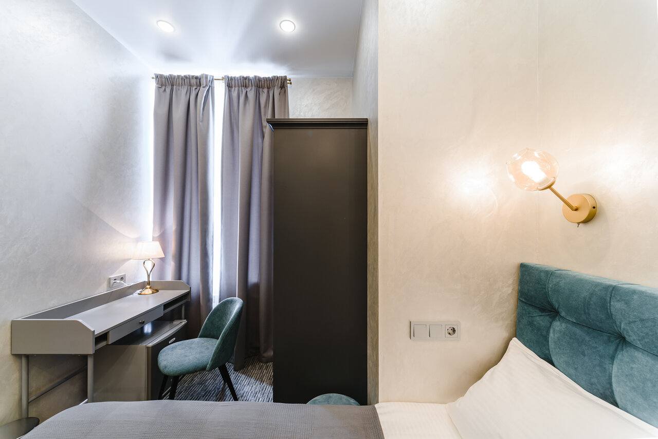 Кровать с мягким матрасом, прикроватное освещение с тумбочкой, шкаф с небольшим сейфом, письменный стол и удобное кресло, мини-холодильник, смарт-ТВ с подключенным Кинопоиском и личные удобства в номере. Номер без окна с кондиционером.
