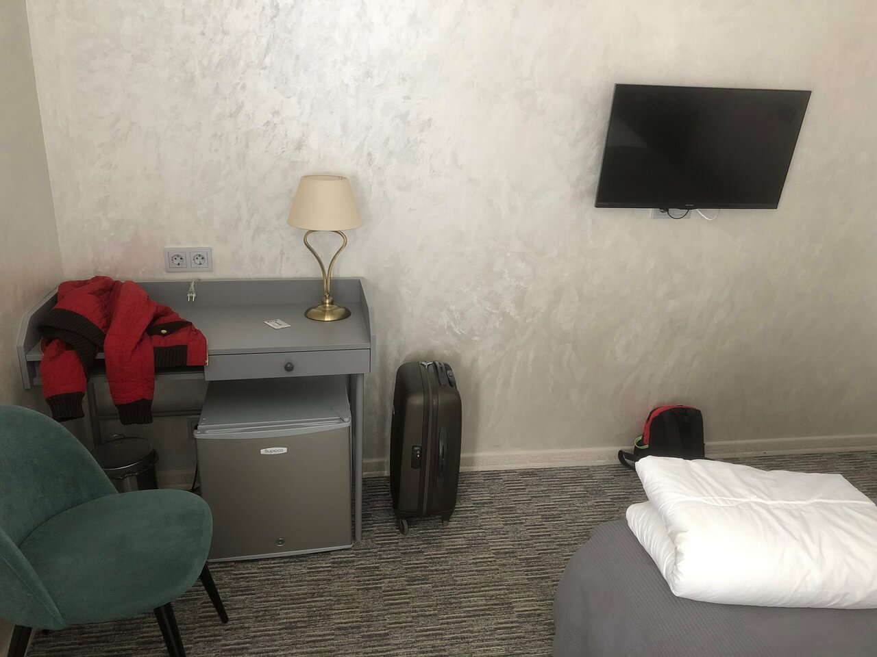 Уютный, чистый номер, идеальный для переночевать. Для длительного пребывания возможно покажется маленьким. В ванной комнате душевая кабинка, электрический полотенцесушитель и фен. Есть кондиционер, шкаф для одеждыи даже холодильник. Продуманное расположение розеток и выключателей. Мне понравилось цветовое оформление стен