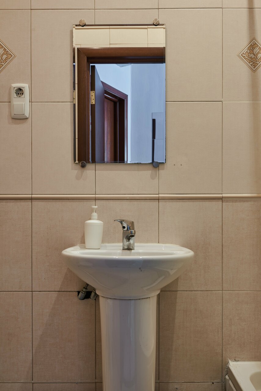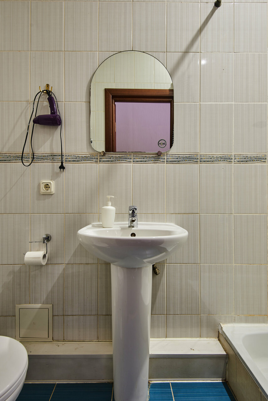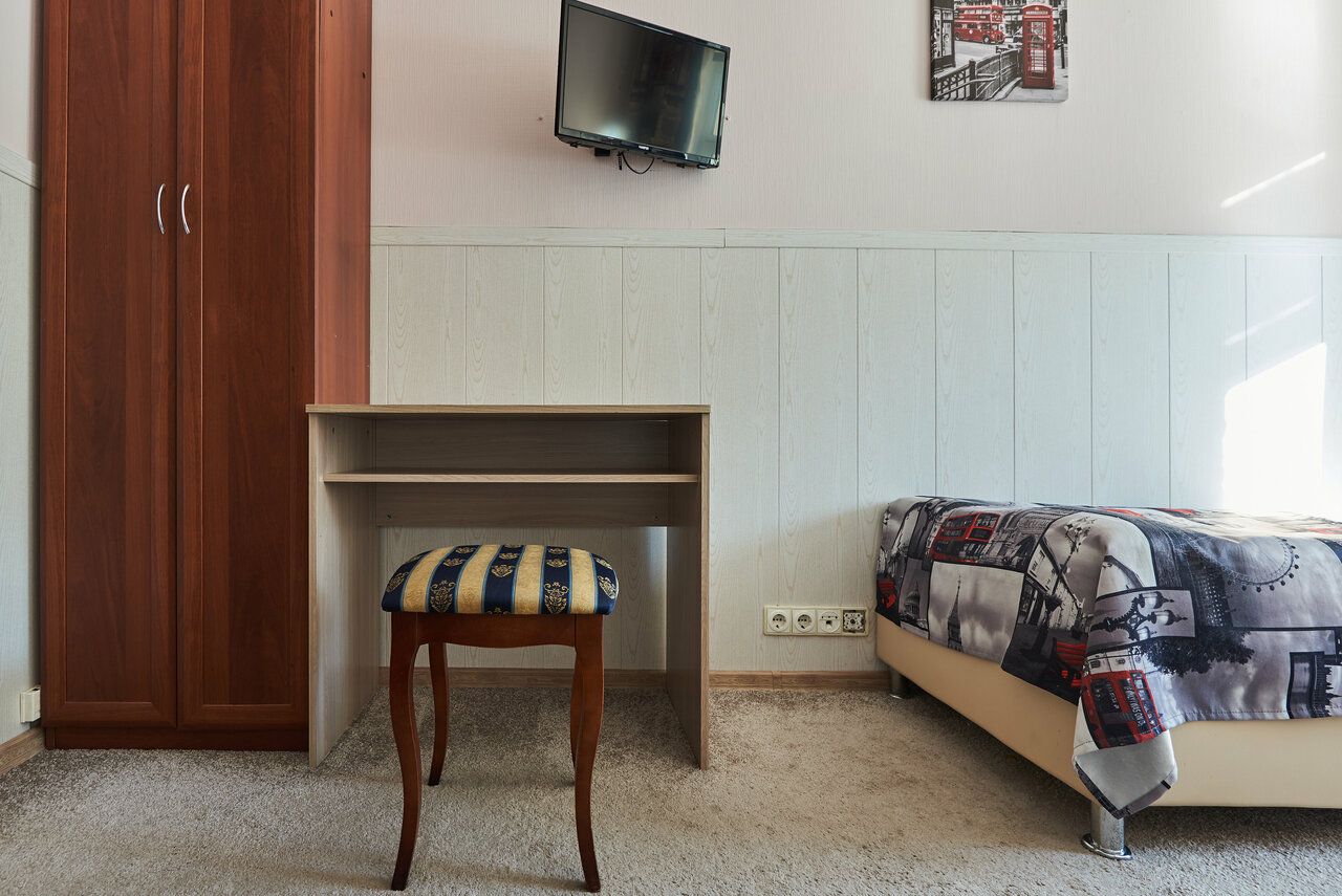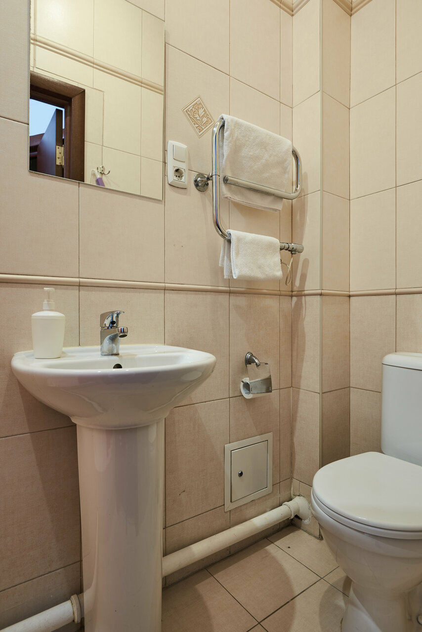 Номер мне достался в цокольном этаже, слышен не только шум от дороги(при закрытом окне), но и как разговаривают за стенкой(причём можно даже отчётливо разобрать слова). Душевая такая маленькая, просто супер-мини, раковина такая же, даже лицо с утра умыть неудобно. Унитазом пользоваться только сидя, т.к. сразу в районе головы висит бойлер. Холодильник маленький, чисто для тех, кто снимает номер на сутки, максимум несколько дней. Кухня на верхнем уровне. Цена на номер средняя, на пару дней снять можно, но я рассматривал на срок от месяца, поэтому и критерии оценки относительно этого.
