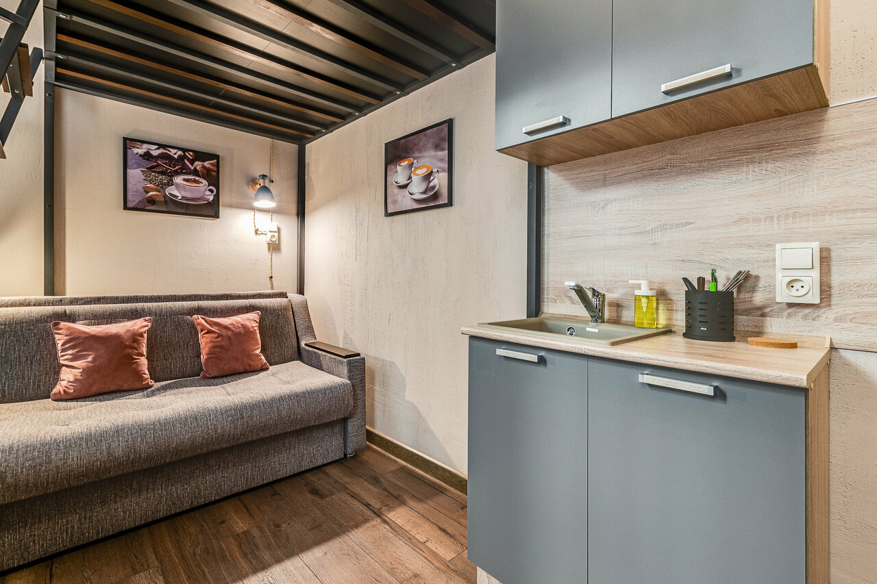 Отдыхали компанией друзей, вместились без проблем! Апартаменты просторные, есть двухуровневые, так что места хватает всем. Кухня-гостиная очень удобная, можно самим приготовить еду, что нам очень понравилось. До метро и вокзала буквально несколько минут, не нужно тратить время на дорогу.