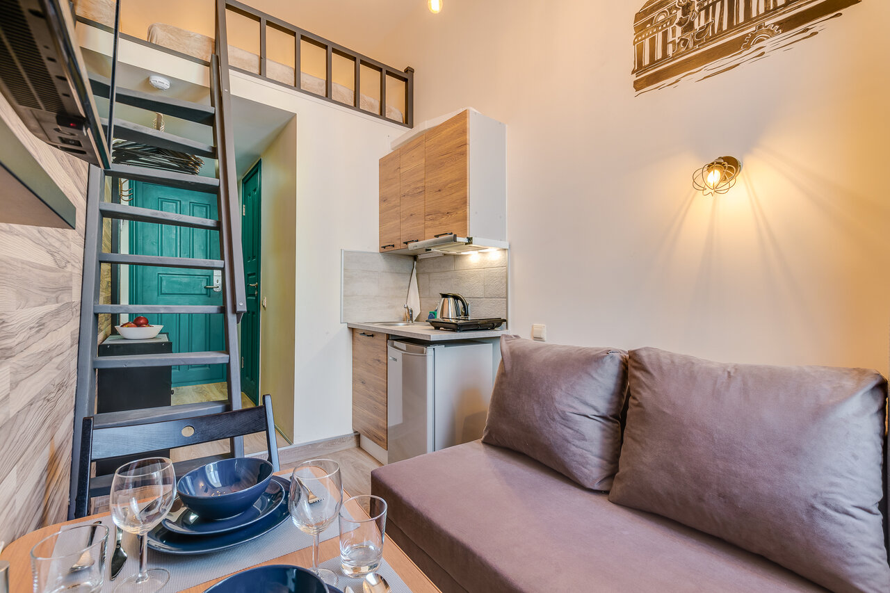 Останавливались в апартаментах на неделю. Очень уютное и стильное место! Двухуровневая студия — идеальный вариант для нас! Особенно понравилось, что можно самостоятельно готовить — кухня оснащена всем необходимым.