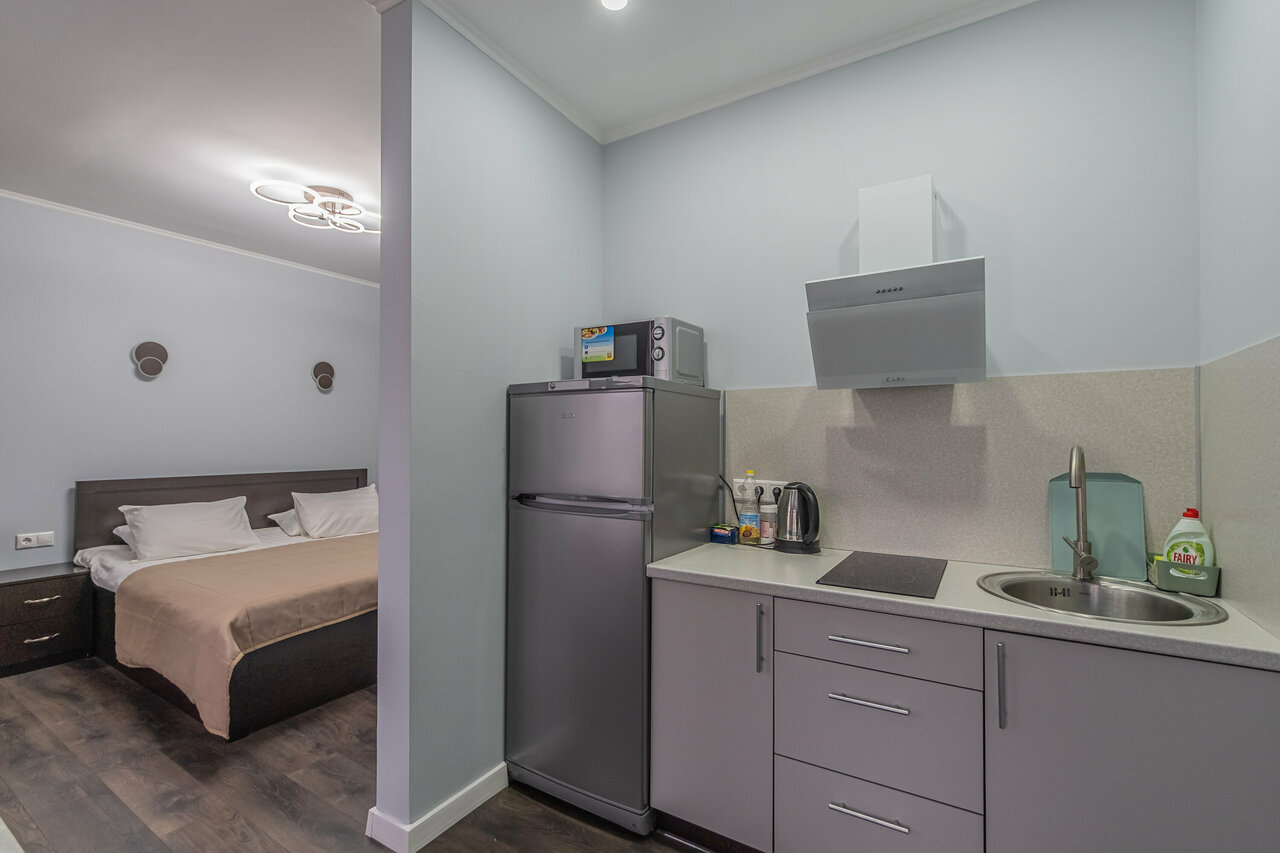 Новые студии с кухонной и гостиной зонами. На кухне есть плита, чайник, микроволновка, холодильник, вытяжка, посуда. В спальной зоне есть большая кровать, шкаф, телевизор, кондиционер, рабочий стол с зеркалом. Вид-внутренний двор. Бесплатный WI-FI