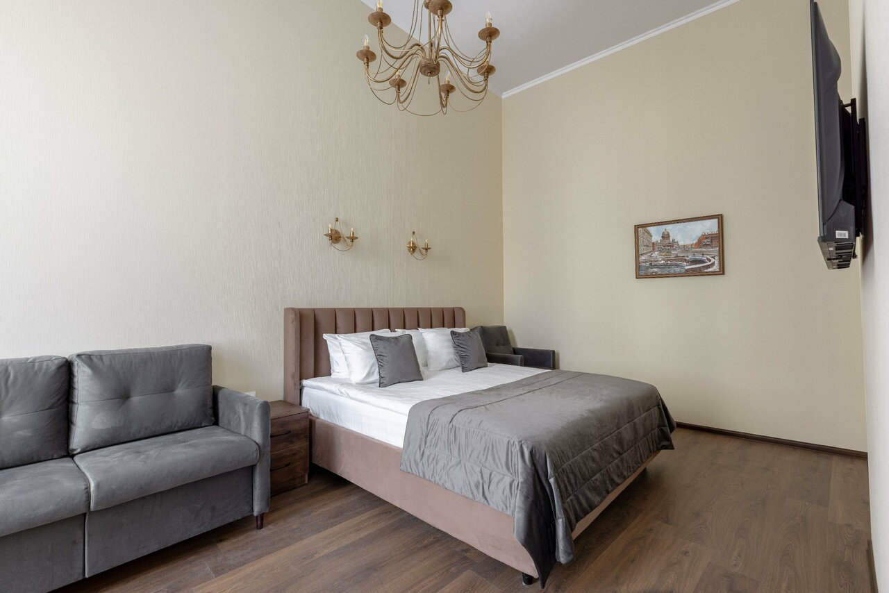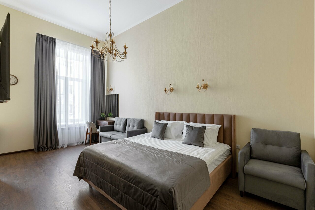 - Апартаменты в центре города с кроватью Кинг-сайз, диваном, креслом и видом. 4000₽