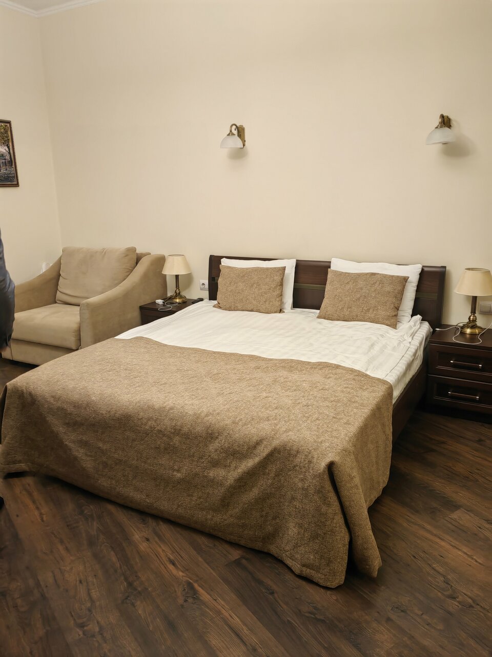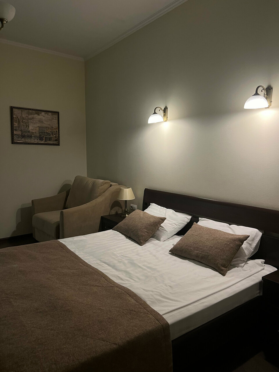 Мы забронировали номер в гостинице Соната на Владимирской площади улучшенный номер класса комфорт с кроватью ‘King-size’. Когда мы приехали нас заселили в обычный номер на двоих, объяснив это тем, что на сайте букинг была какая-то ошибка и в то время данный номер уже был не доступен. Отдых был заметно подпорчен и впечатления о данном месте тоже.