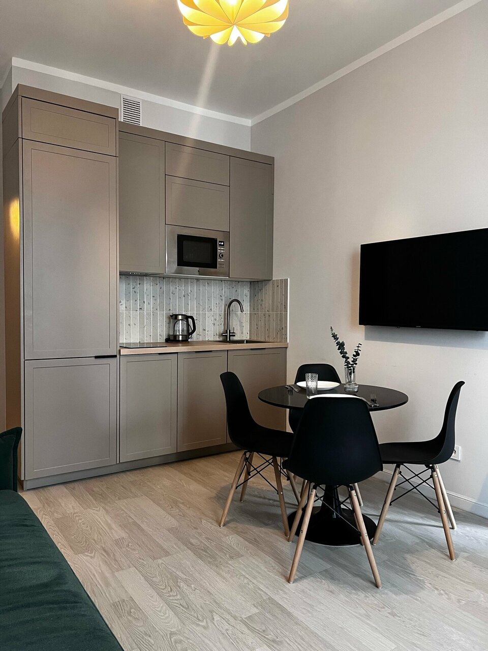 - Хорошая оснащённость (кухонная техника, посуда, ТВ).