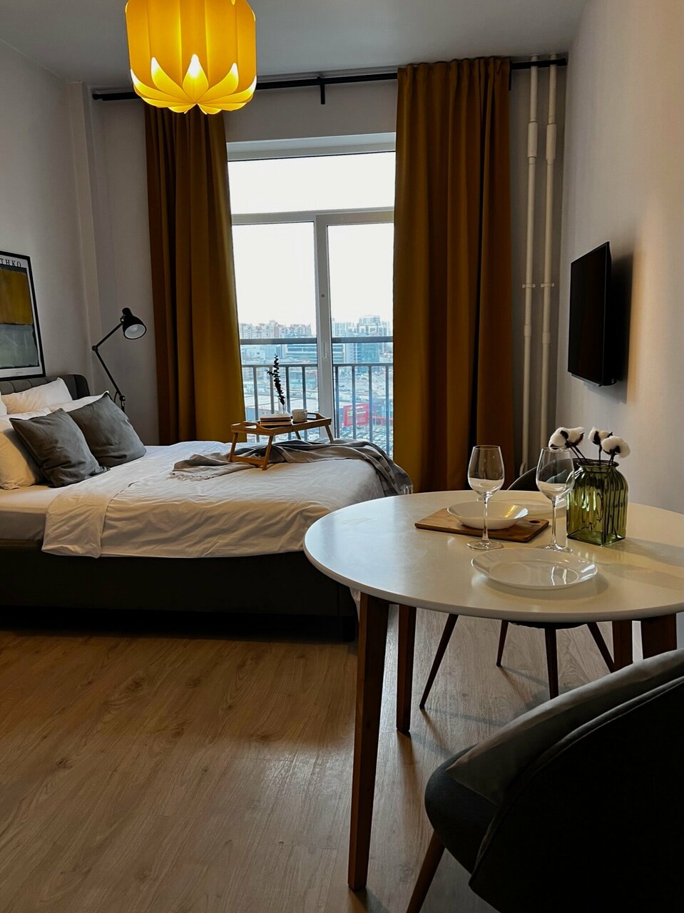 Апартаменты рекомендую. В номере чисто. Бель на двоих. В квартире студии: двухспальная кровать, чайник, микроволновка, холодильник, посуда, эл. плита, телевизор, стол и стулья. Улицу не слышно. Оплата удалнно через перевод на Сбер, Вадим все расскажет.