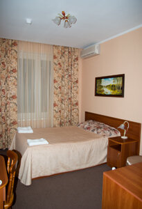 Предлагает недорогие номера (от 3000 ₽/ночь) с Wi-Fi, телевизором, холодильником, микроволновкой и кухонным уголком. Доступны услуги: парковка, трансфер, химчистка, прачечная, консьерж-сервис и проживание с животными. В номерах — чай/кофе, фен, халаты, тапочки.