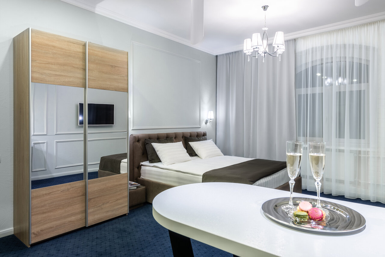 - Полная комплектация номера (посуда, гладильные принадлежности, гигиенические наборы).