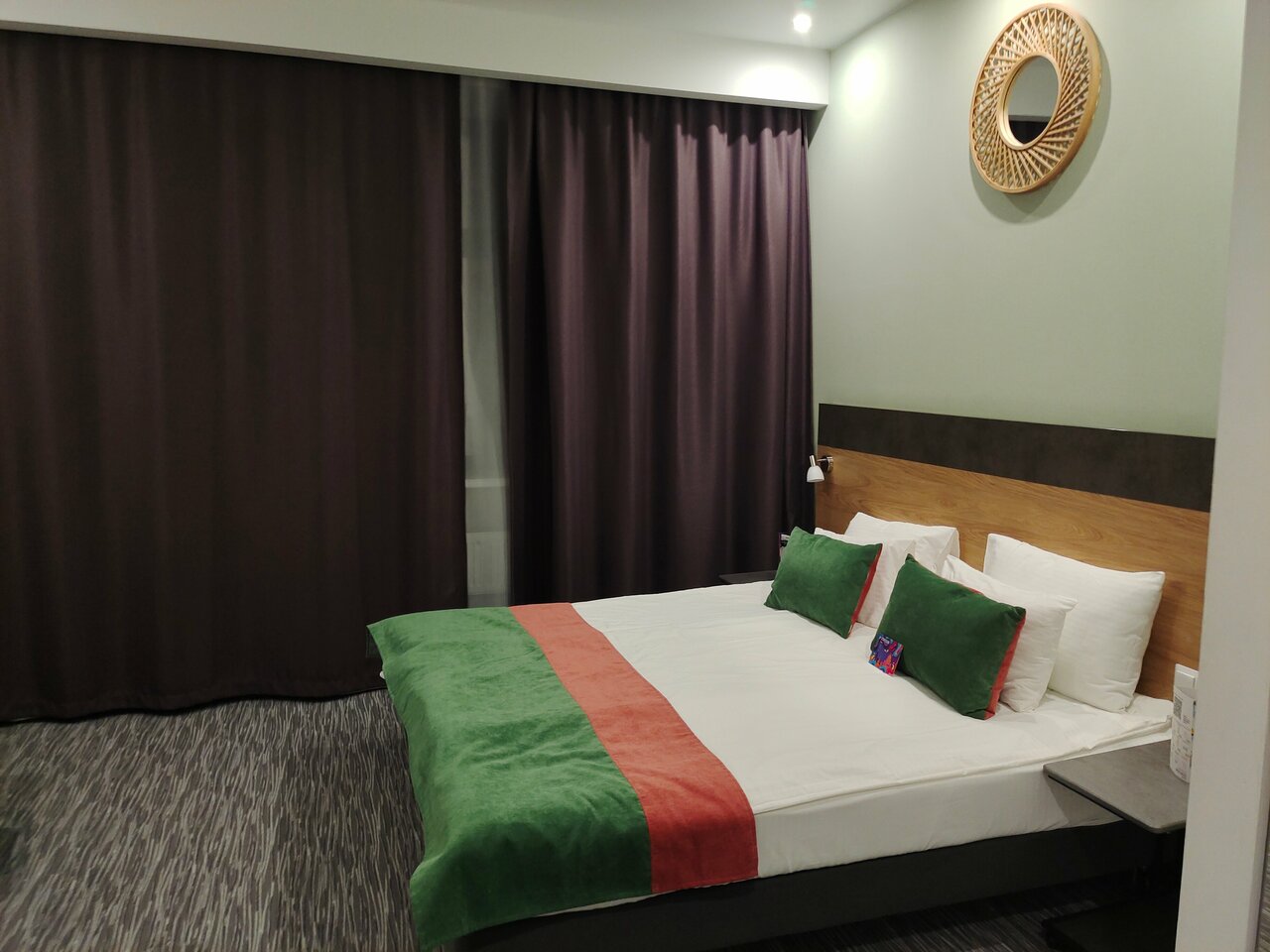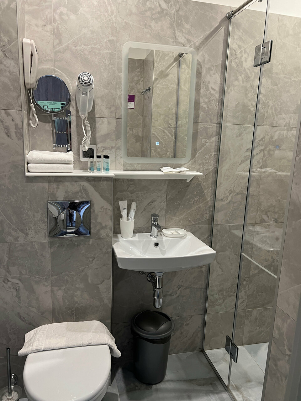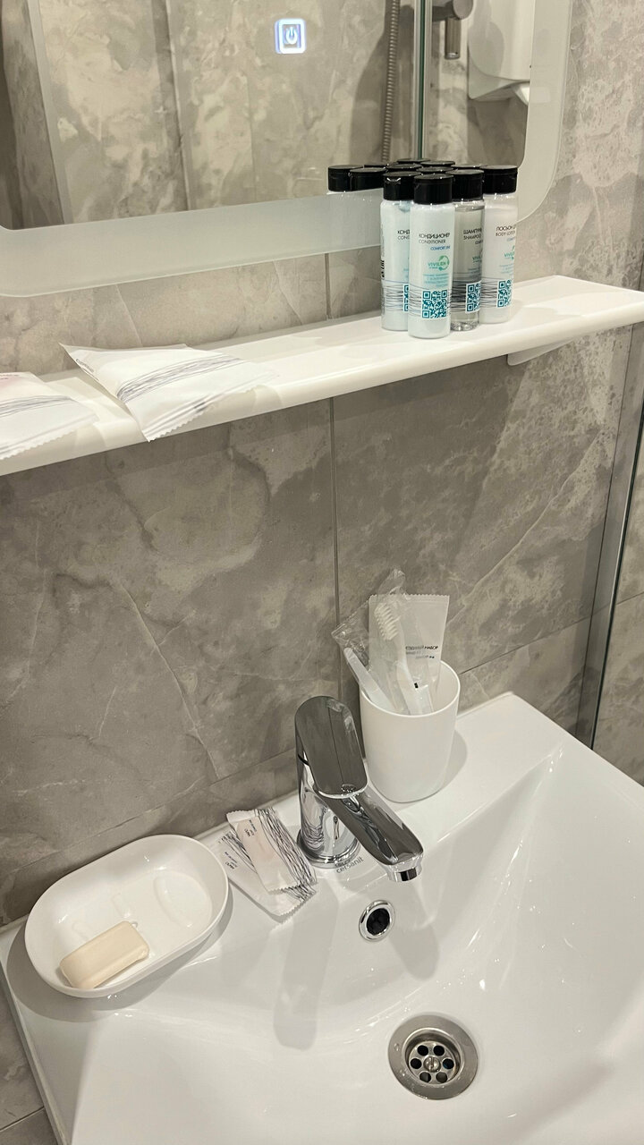 Отличный отель с хорошим расположением. Рядом метро, кафе, магазины. Номера светлые, аккуратные. В номере есть всё необходимое — ТВ,холодильник, чайник и чайные принадлежности, вода, халаты, тапочки. В ванной комнате есть мыло и другие средства гигиены. Завтрак шведский стол достаточно разнообразен. Всё вкусно. Персонал вежливый. Есть лифт, туалетные комнаты около рецепшн. Чай, кофе можно попить в любое время на цокольном этаже где проходят завтраки. Рекомендуем для посещения.
