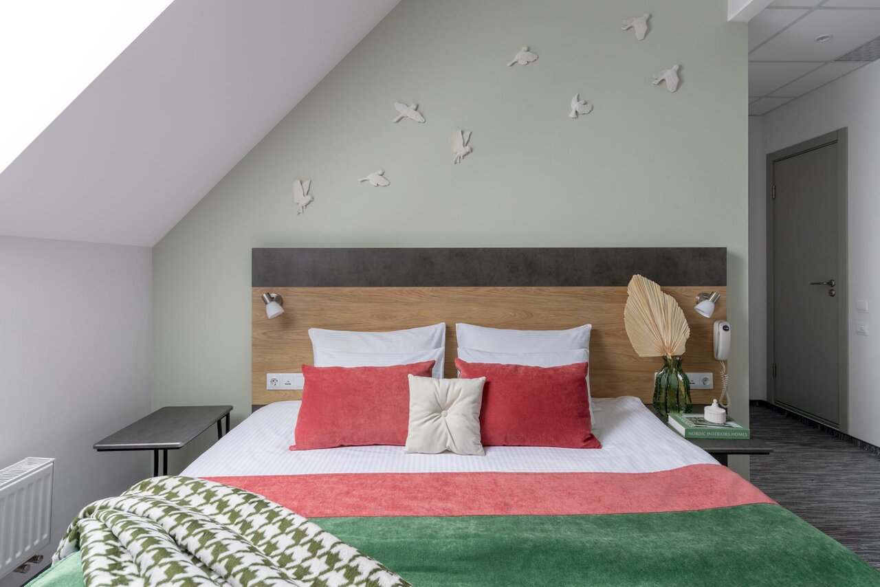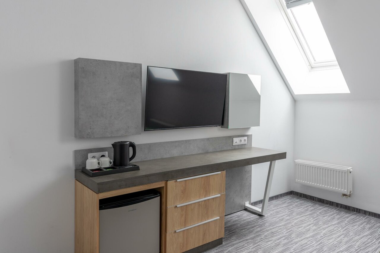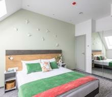 Модерн с мансардными окнами - светлый, комфортный, стильный и просторный номер площадью 22 кв. м., расположенный на мансардном этаже отеля. Здесь с удобством могут разместиться от одного до трех гостей.