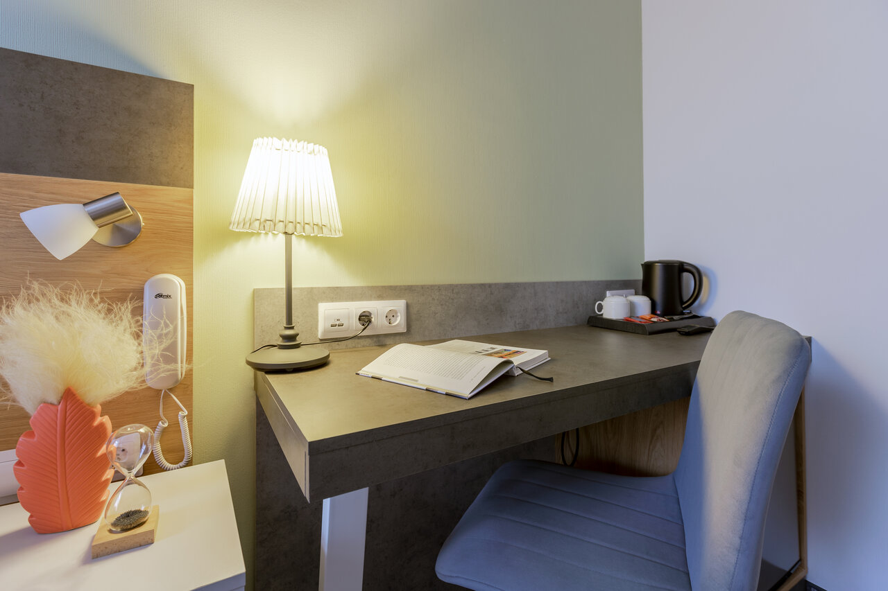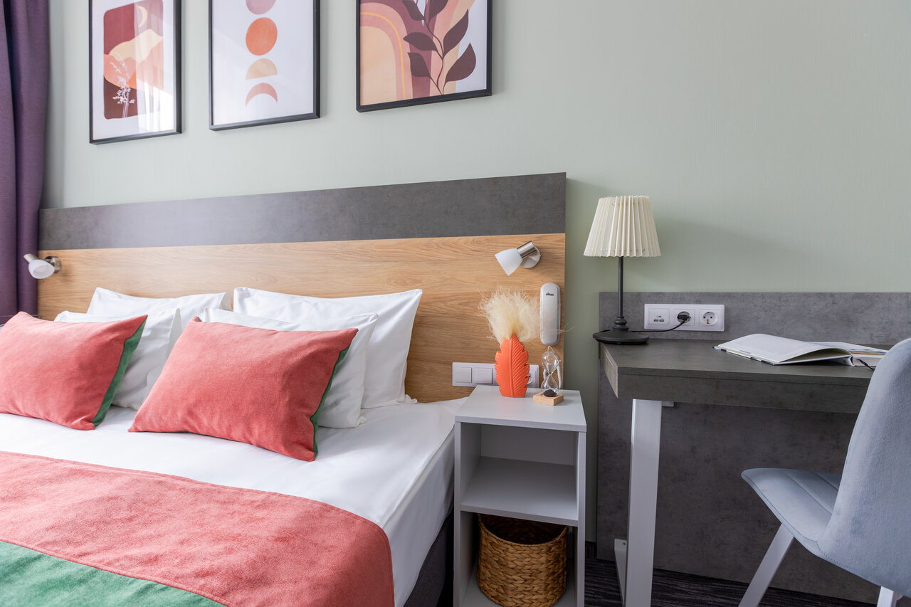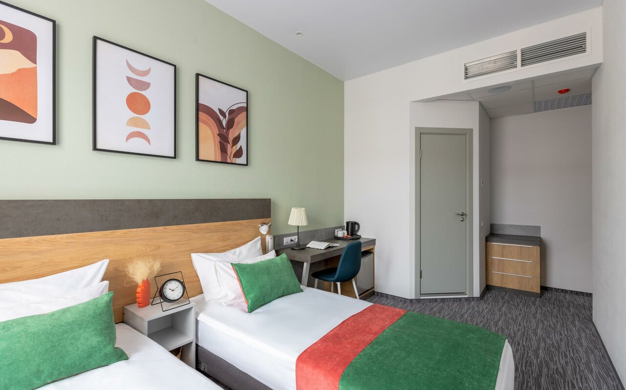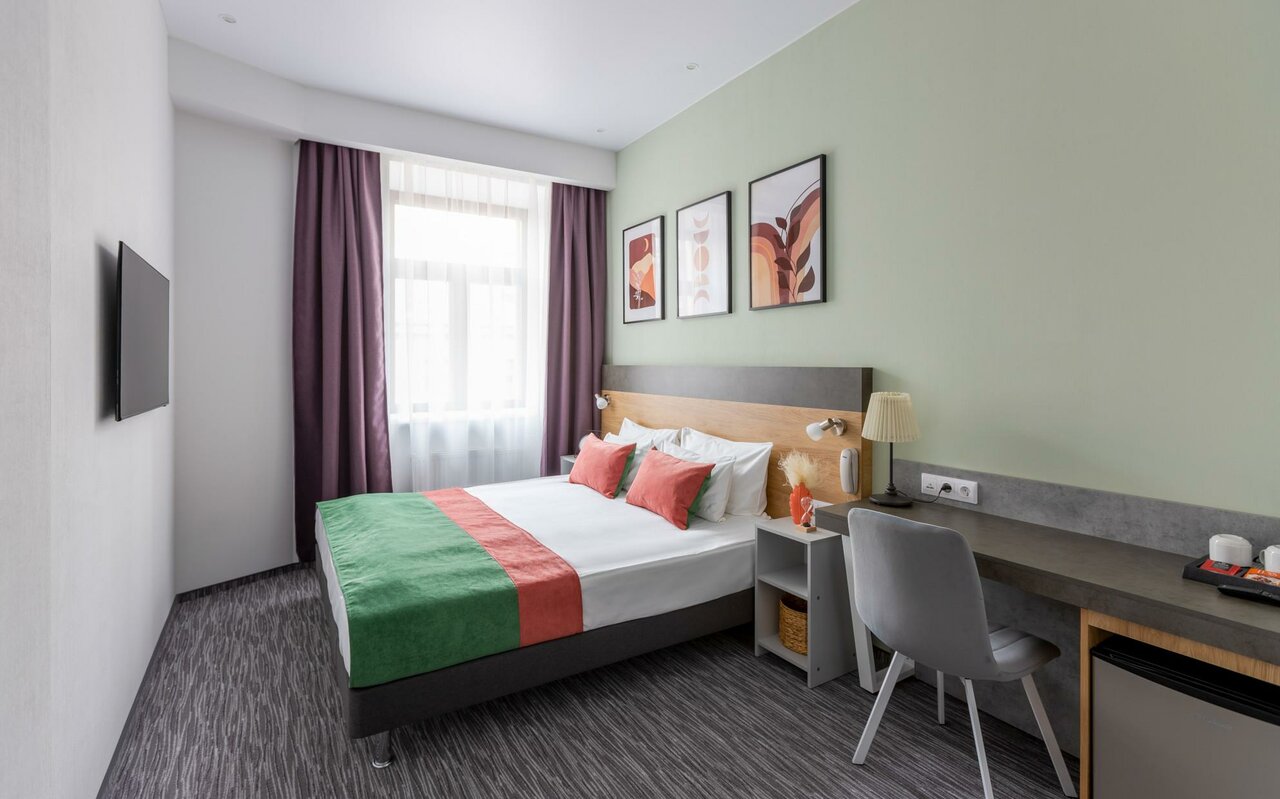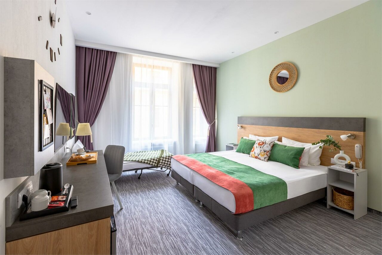 Просторный и стильный однокомнатный номер Модерн площадью 23 кв. м. с видом на город или во внутренний двор отеля предназначен для одного, двух или трёх гостей.