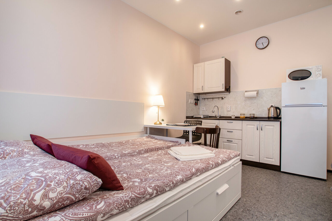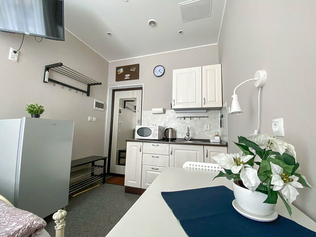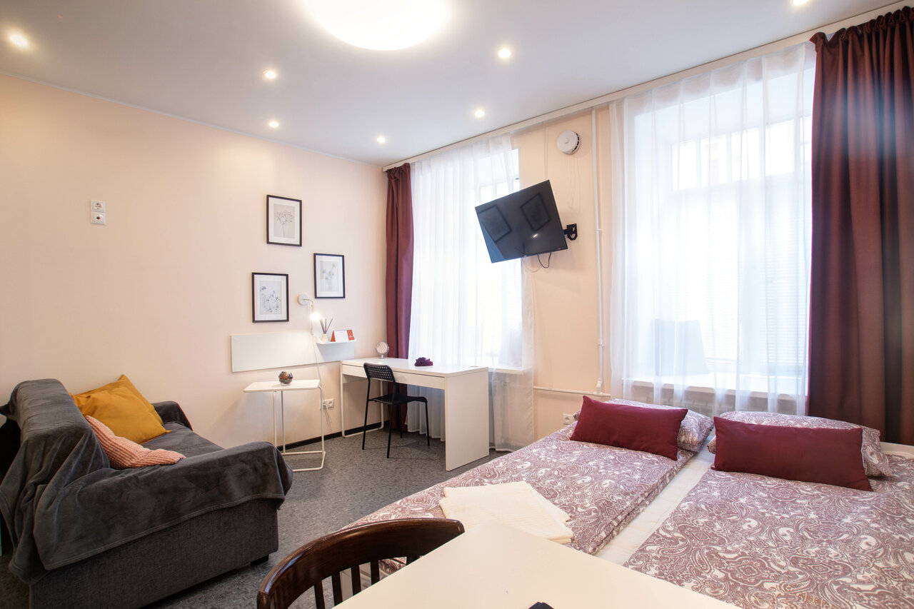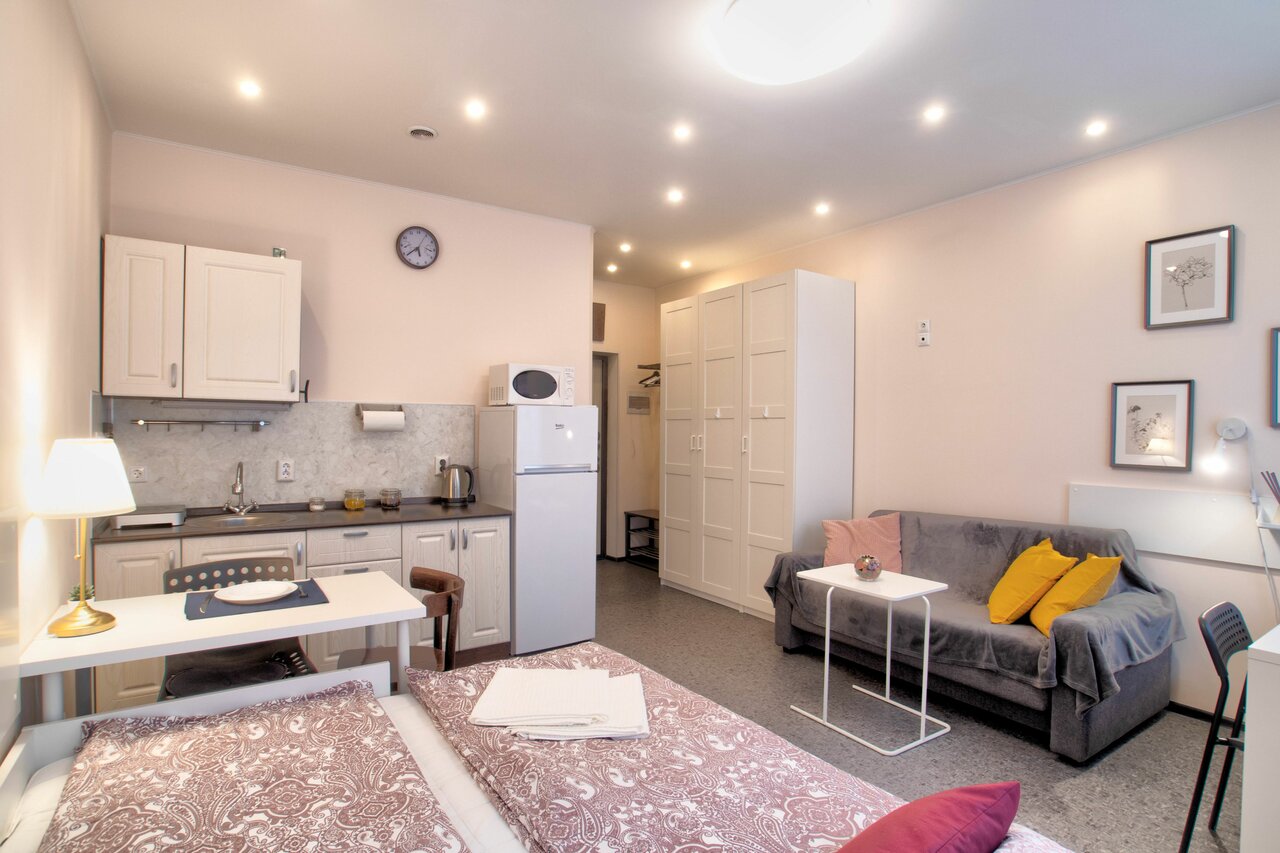 Отличные студии! Прекрасное месторасположение, 15 минут до центра пешком. В студии есть все необходимое для недельного проживания (чай, посуда, банные принадлежности, полотенца, утюг, сушилка, фен, сушилка для обуви, мини холодильник, даже ролик для чистки одежды).Чисто, уютно, окна на тихий двор, рядом множество кафе и магазинов. Так же станция метро в 5 минутах ходьбы. Для туриста идеальное место для остановки!