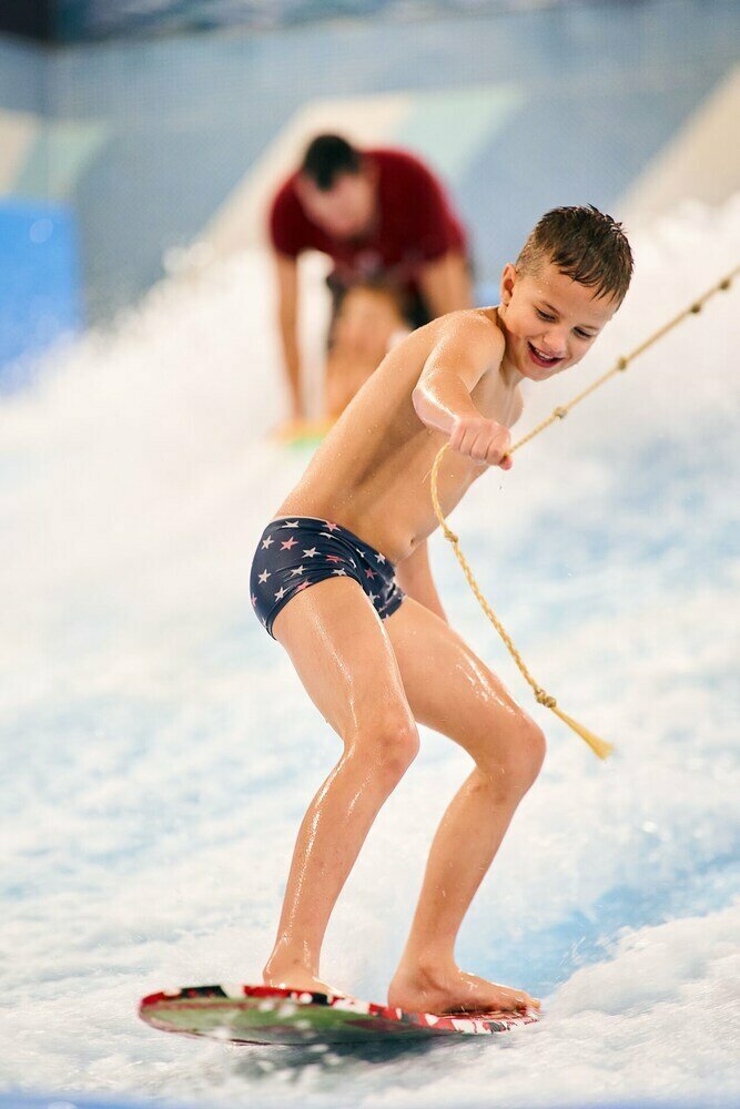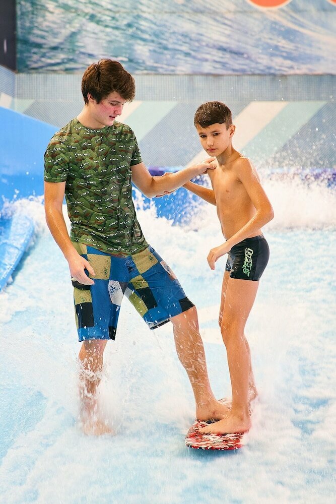 Искусственная волна сильно впечатляет. В кафе можно перекусить и смотреть как твоё чадо там крутится на волне Всё это удовольствие не дешевое.