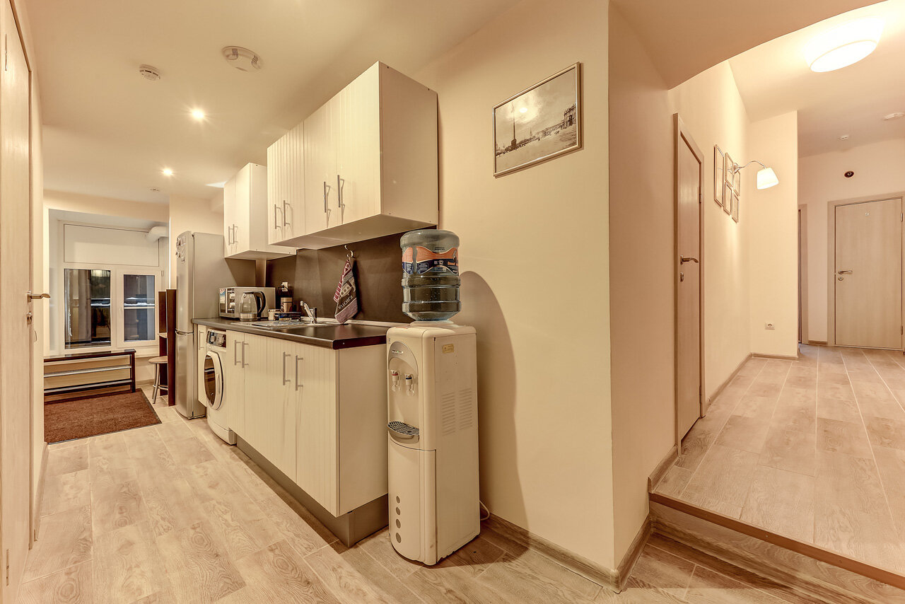 - Оснащённая кухня (кулер, холодильник, микроволновка, посуда).