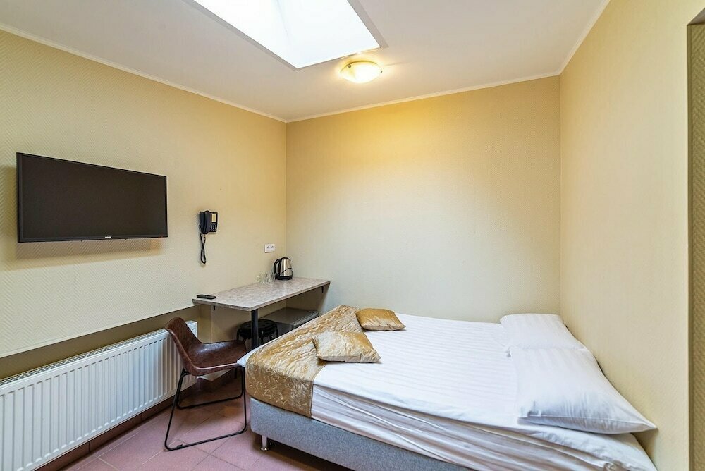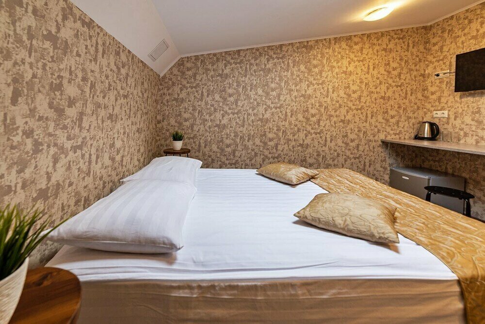 Тип номера брали — Стандарт двухместный Минусы: - лестницы с резким подъемом вверх; - номера в основном с мансардными окнами из-за чего высота комнаты сужается и чувствуешь себя в чулане; - неуютно, сделано на скорую руку, даже нарядного покрывала не было на кровати; - кровать маленькая, точно не для высоких людей. Нет изголовья. Просто матрас на 4х ножках. Постельное белье чистое. Нет розетки рядом или прикроватного столика, куда можно было бы положить телефон; - ремонт на скорую руку сделан: раковина колотая, розетки отваливаются; - душно в номерах (окно не открыть т.к. летят комары и шум с улицы) - вентилятор, если его включить, с пола напором воздуха гоняет пыль, которая сбивается в хлопья и как снежинки кружится по номеру; - торчит гвоздь в стене. Плюсы: - вежливые девочки на ресепшене, но помочь со сменой номера не смогли, только предложили доплатить за улучшенный номер; - вокзал в 5ти минутах.