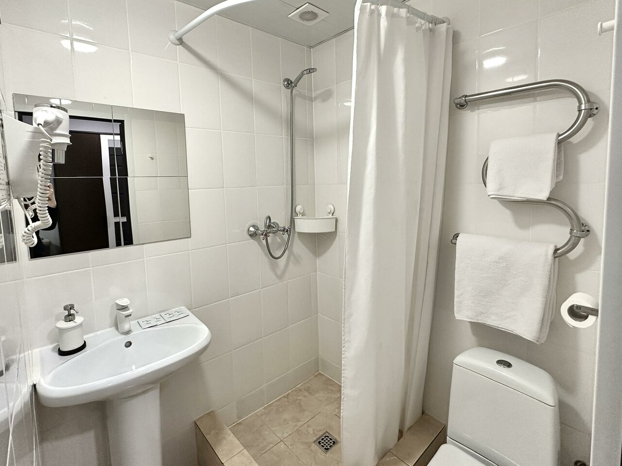 Номера очень маленькие, на первых этажах в 104-102 номерах весь день как будто в пепельнице находишься потому что курят на улице под лестницей круглосуточно Таблички не курить не увидела, персонал не реагирует на замечания В душевых грибок и вообще это похоже больше не на душевую , а на мойку для ног, жуть Три крючка в номере, вещи не куда разобрать Холодильник под столом гудит все время, фен микроскопический, брови таким только сушить) Завтраки не вкусные в боксах выдают(