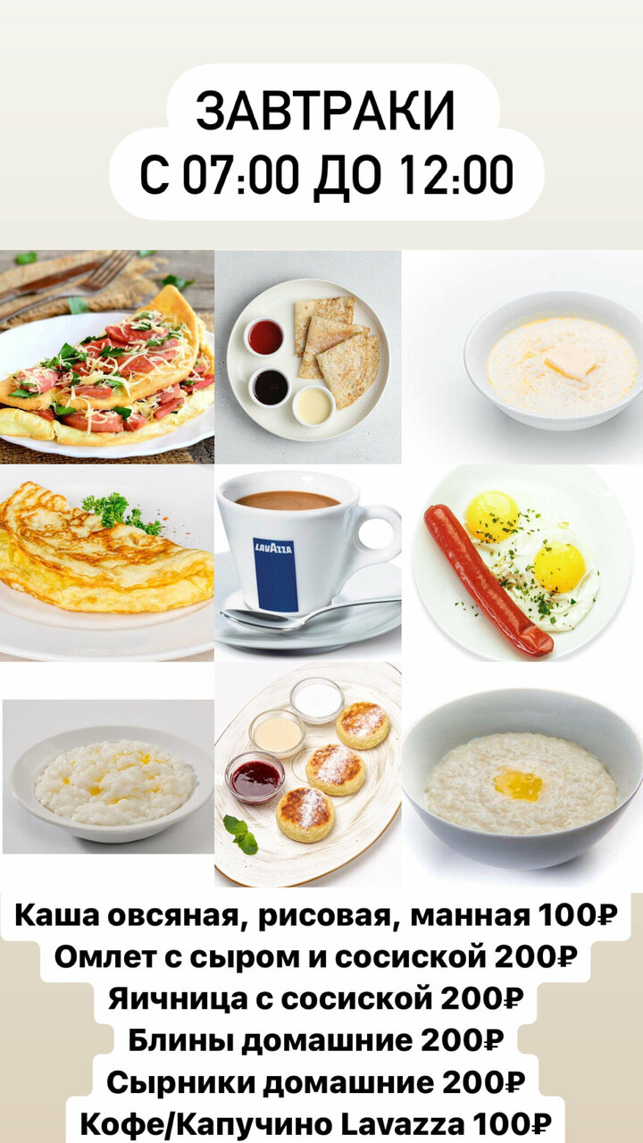 Завтраки домашнее с 07:00 до 12:00Каша овсяная, рисовая, манная - 100 рублейОмлет с сыром и сосиской - 250 рублейЯичница сыром и сосиской - 250 рублейБлины домашние 3шт - 250 рублей (входит джем/сметана/сгущенка)Сырники домашние 3шт - 250 рубле