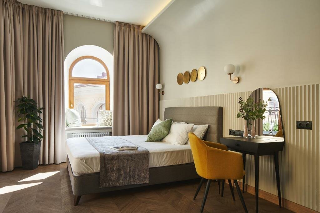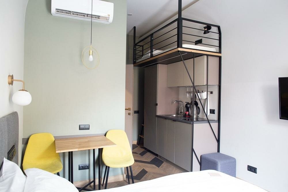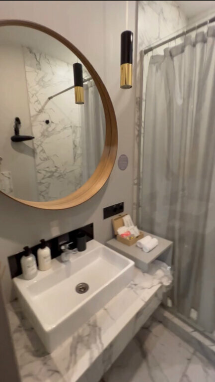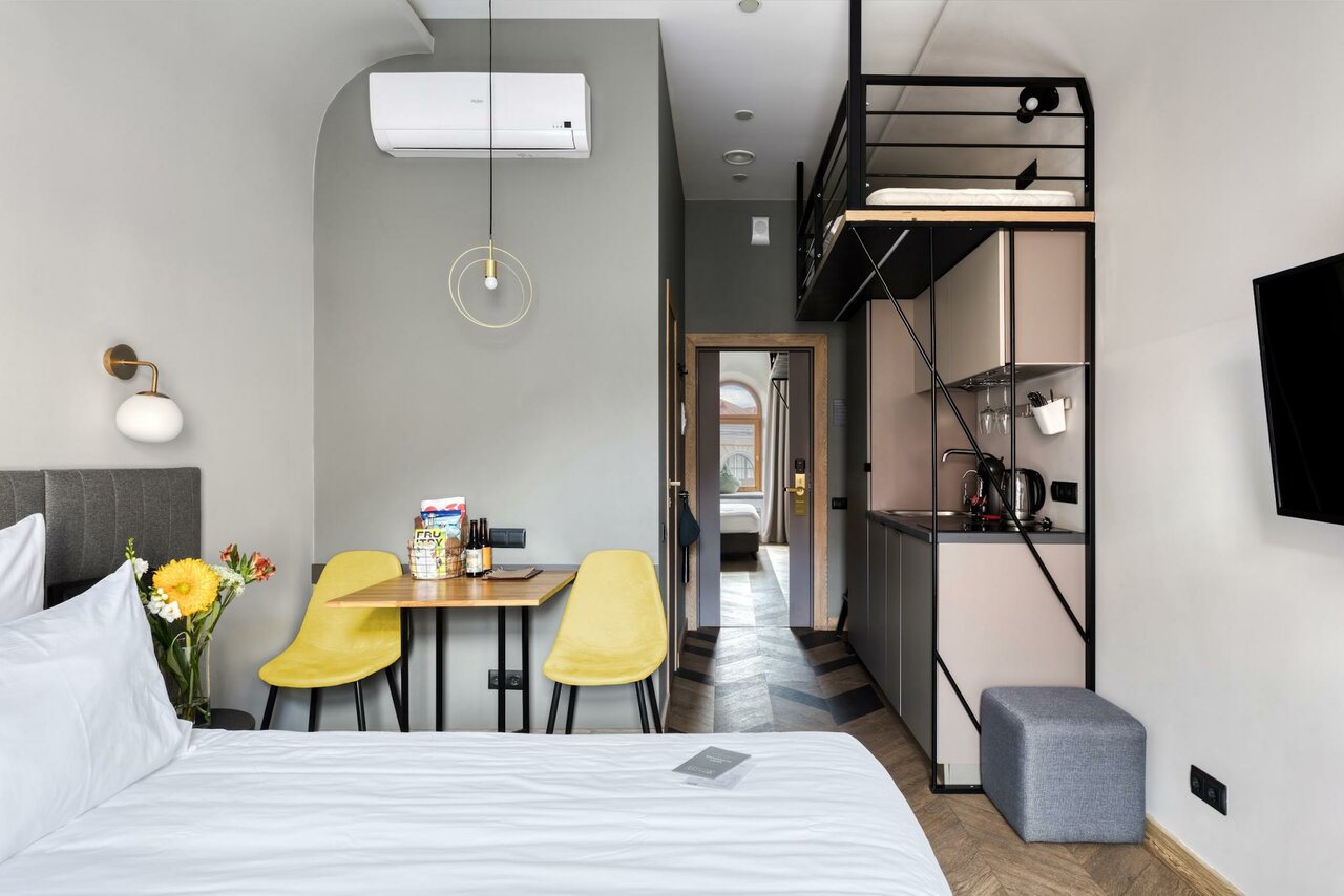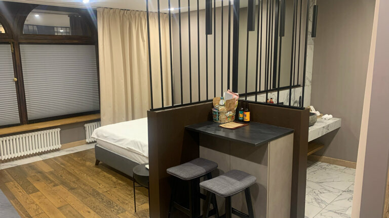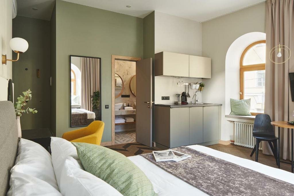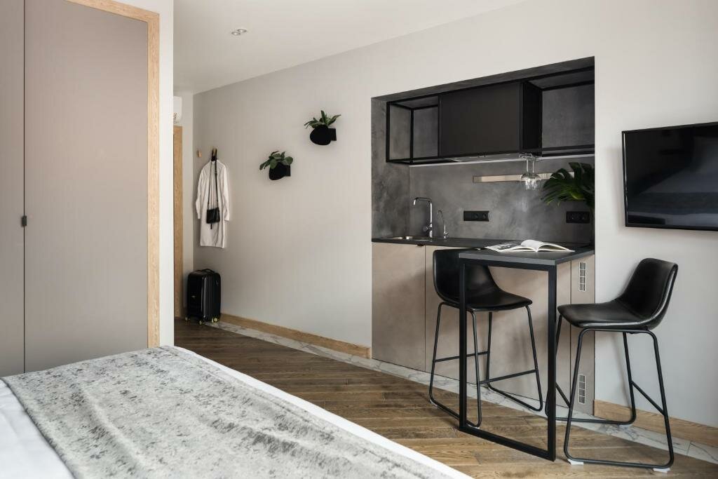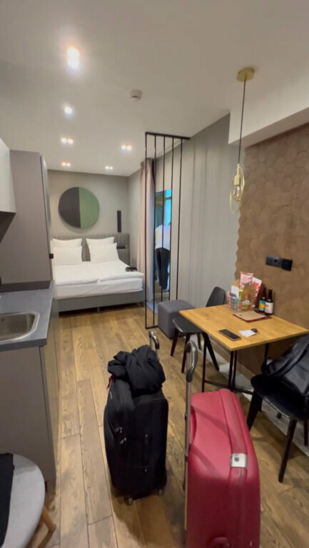 Классный отель, очень удобная локация. В номере есть все необходимое. В том числе небольшая Кухня — стоит фильтр — очень удобно. Кровать большая, удобная, подушки удобные. Интерьер очень стильный. Рекомендую.