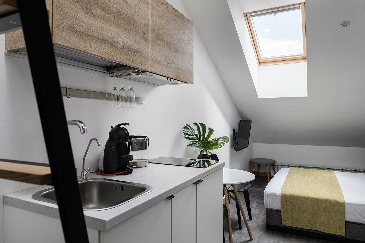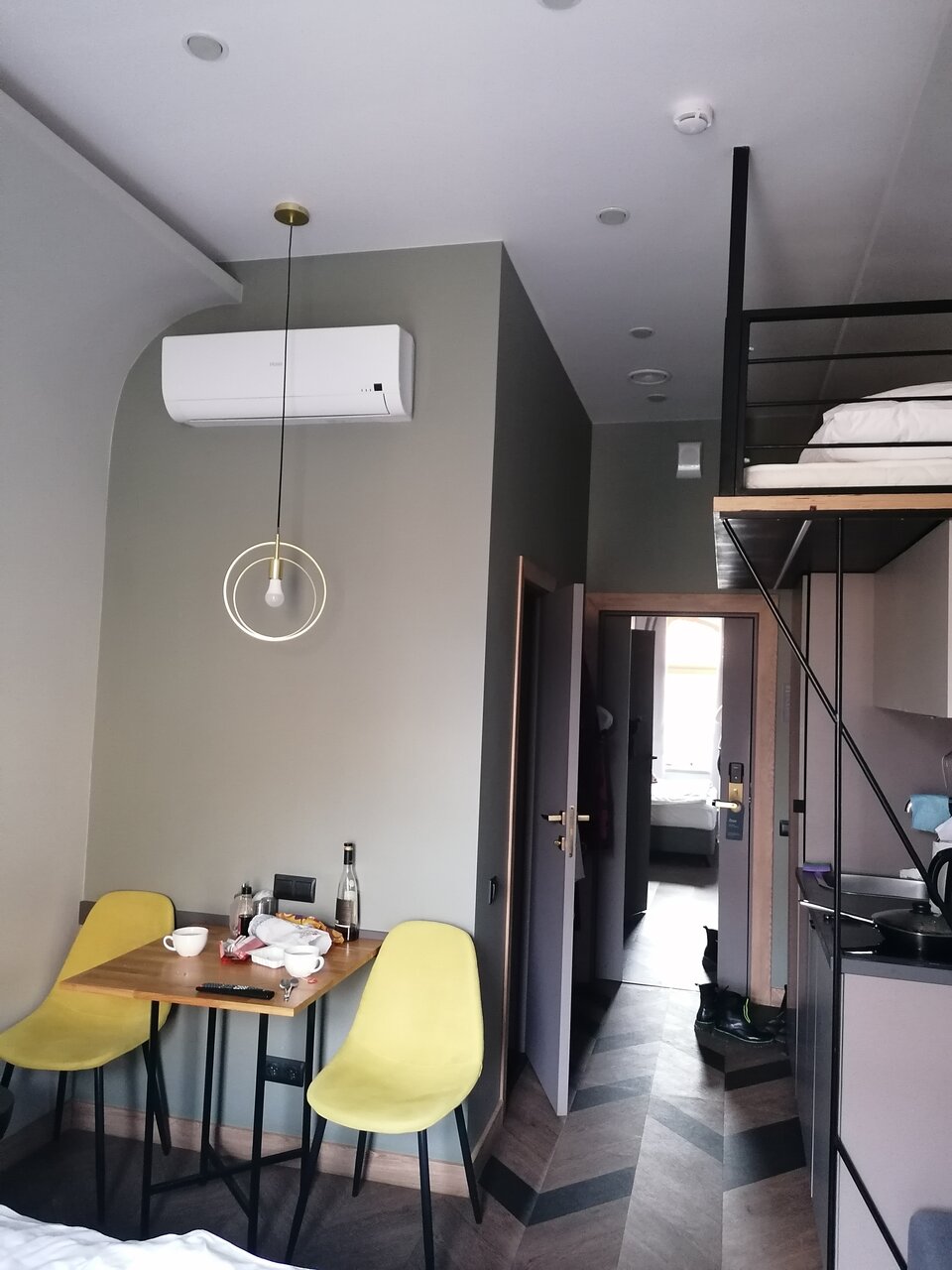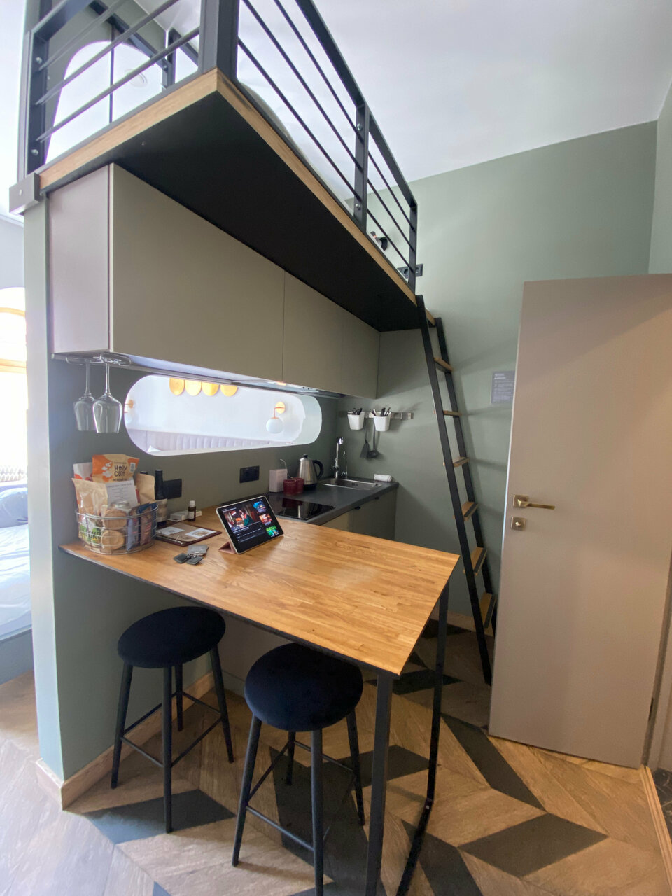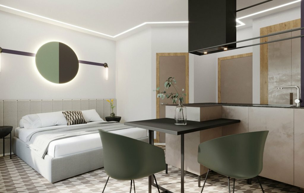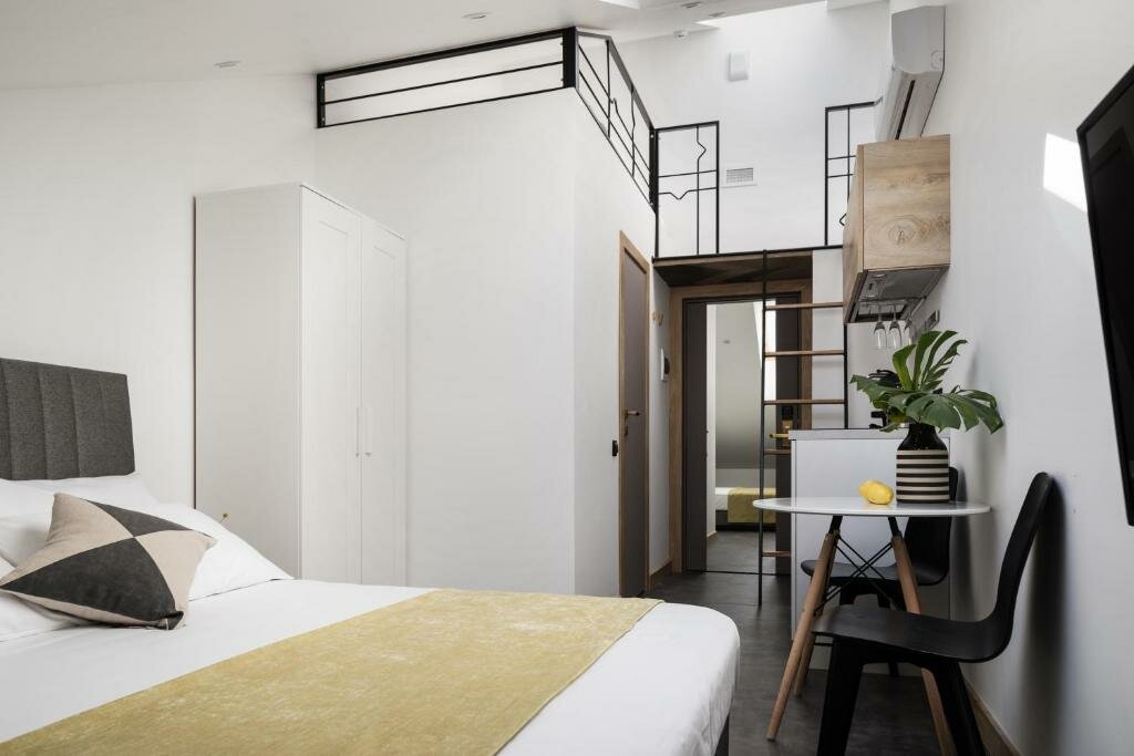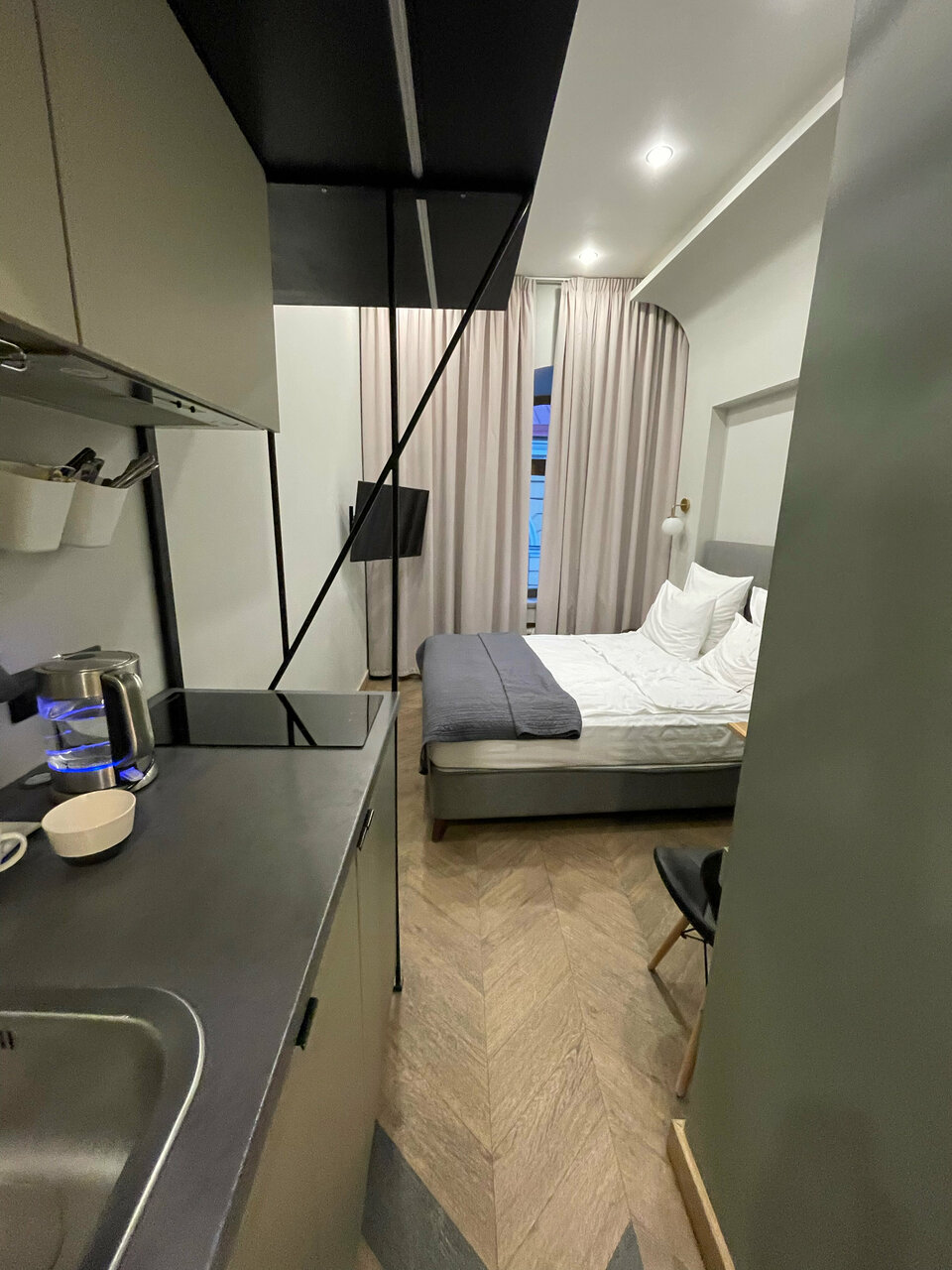 Классный отель, очень удобная локация. В номере есть все необходимое. В том числе небольшая Кухня — стоит фильтр — очень удобно. Кровать большая, удобная, подушки удобные. Интерьер очень стильный. Рекомендую.