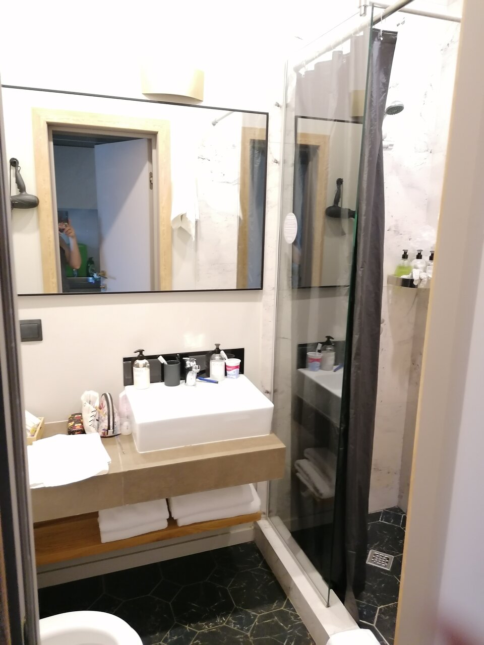Из плюсов — цена, идеальное местоположение и хорошее наполнение номера: зубные щетки, ролик для одежды, халат, тапочки, чистое постельное белье Все остальное мне не понравилось. Во-первых, на ресепшене ужасно пахнет едой. Оказалась, что под отелем находится пищевой цех. Во-вторых, в коридоре постоянно стояло ведро с грязной водой и шваброй [утром, днем, вечером — всегда]. Почему не унести его в оборудованную комнату? Сам номер уставший, в ванной облазит и желтеет стена. И слышимость просто ужас. Только заселились, захожу в ванную подкраситься, муж в жилой зоне: будь здорова!, но я не чихала, — это был кто-то в соседней комнате.
