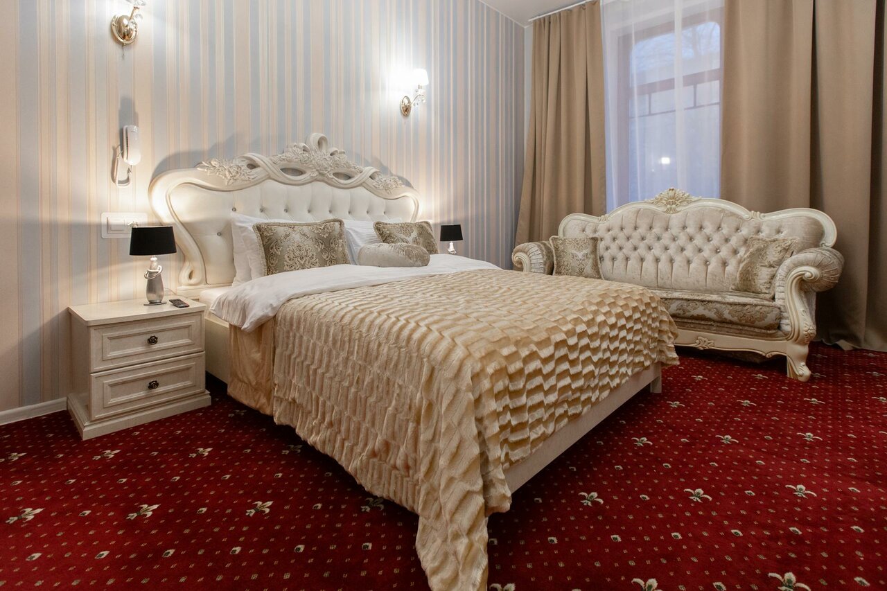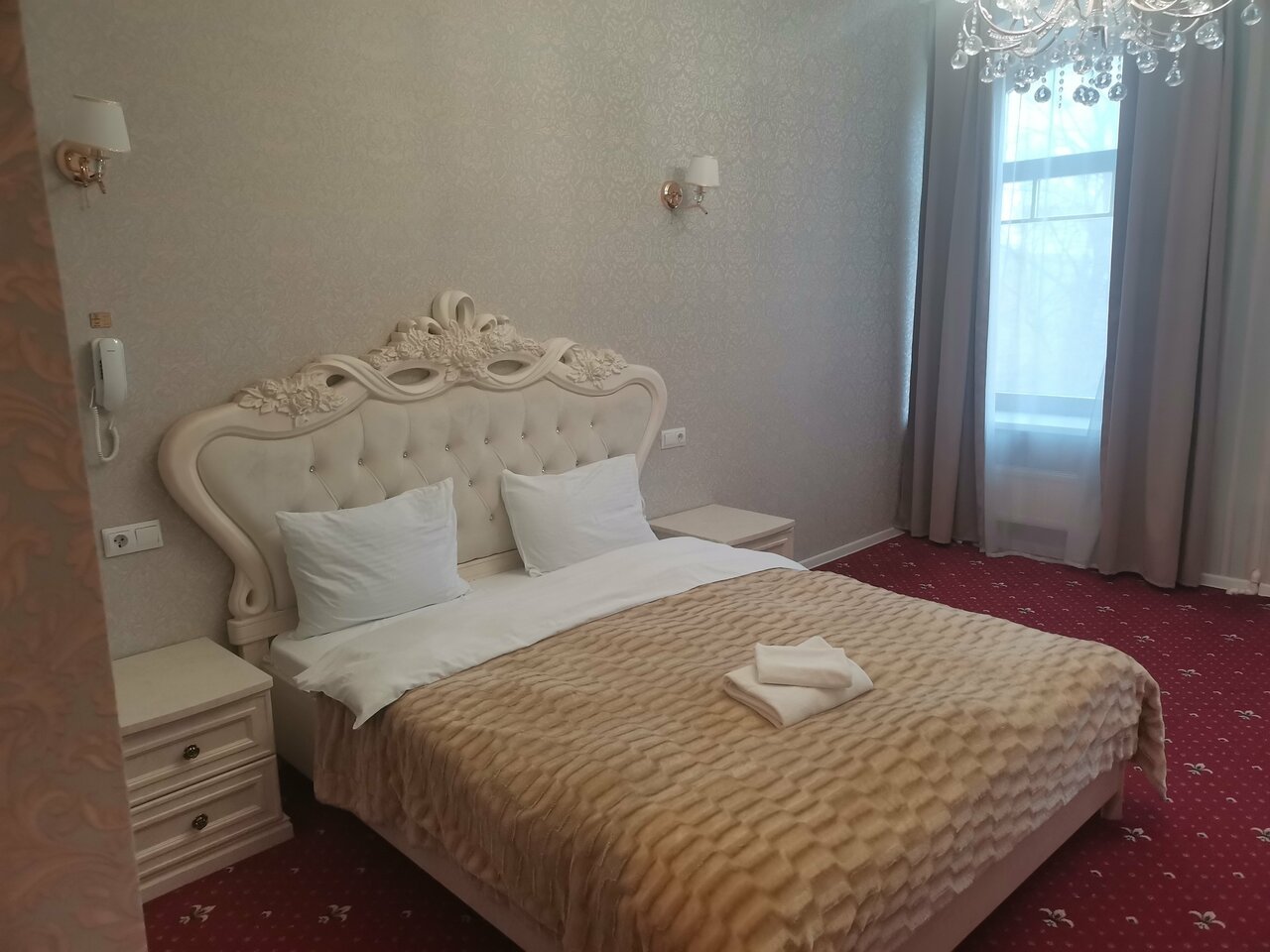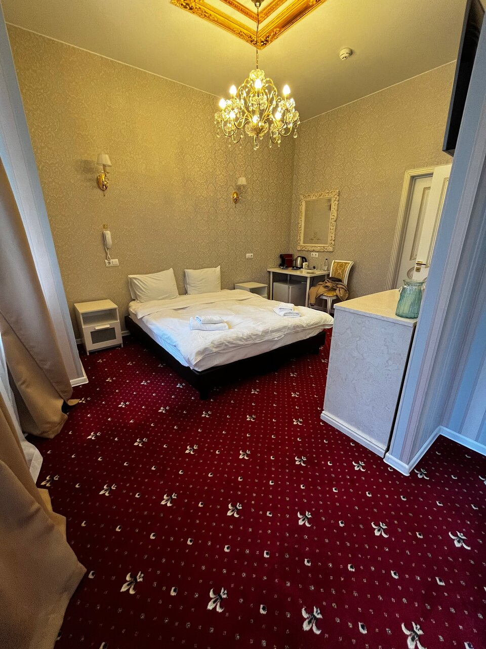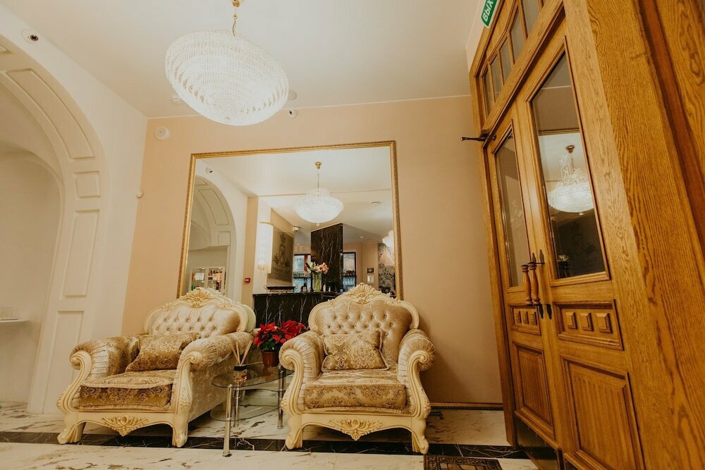 Отель неплохой, в центре города, парковка для машины, удобная. Сам отель сделан стильно, вензеля, люстры, мебель, всё на уровне, но есть одно ‘но’, стены, слышимость отличная, как соседи в соседнем номере говорят, как будто рядом сидят за столом.
