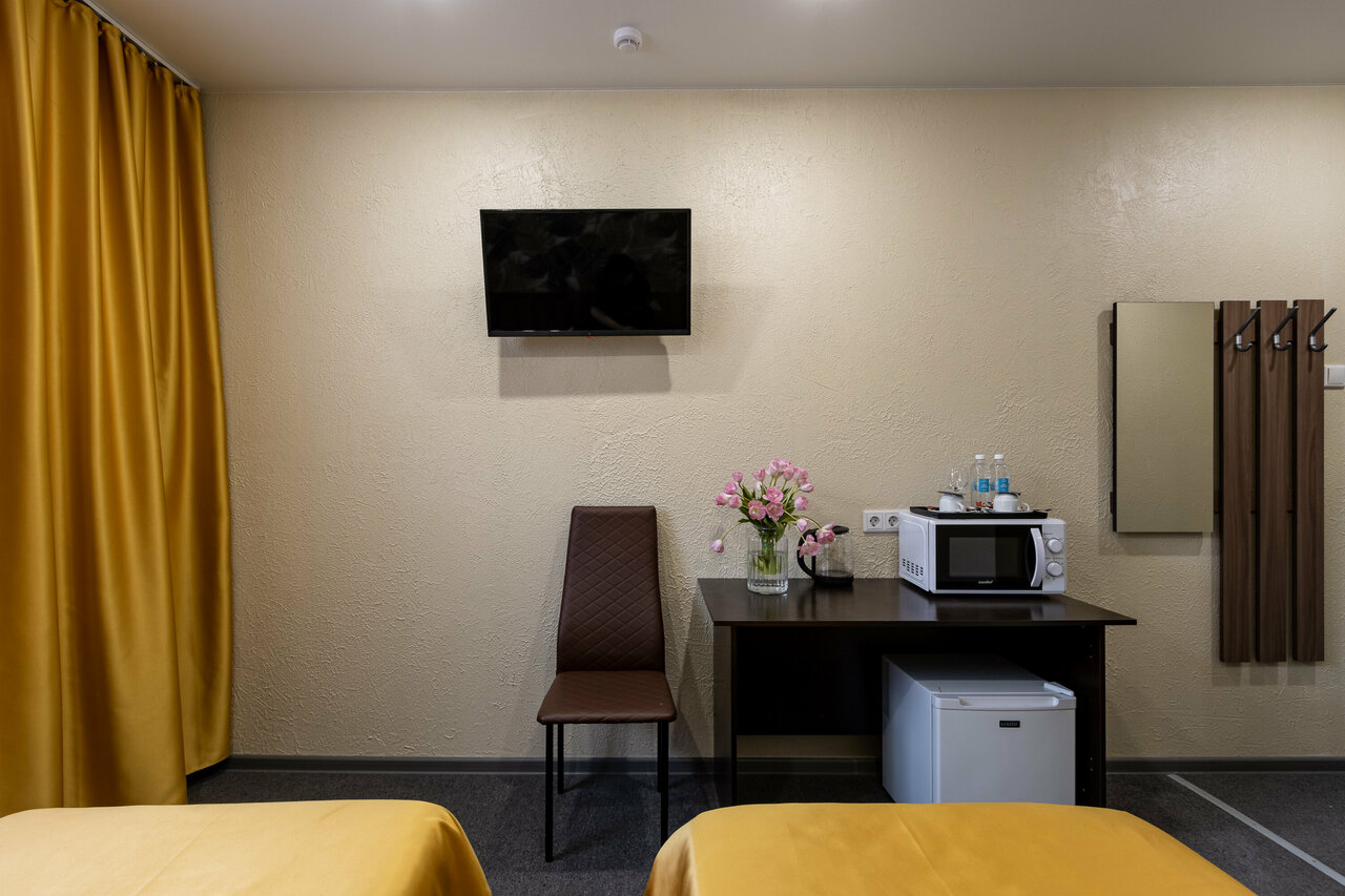 - Наличие в номере:чайник, холодильник, микроволновка, чайные принадлежности, тапочки, полотенца, гигиенические наборы, фен.