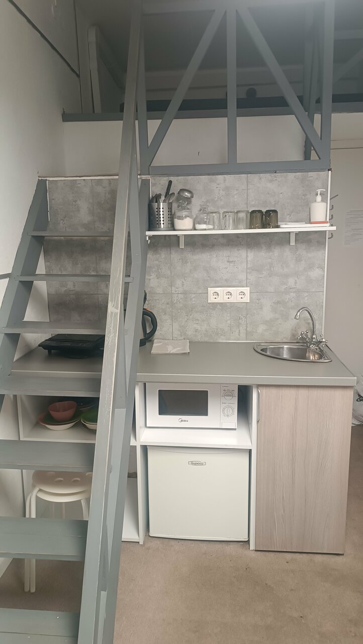 Расположен в тихом месте, до метро минут за 15 неспеша с детьми доходили. В апартаментах очень мало места в общей зоне — узкий коридор, никакой зоны для хранения вещей выезжающих и заезжающих, если поезд приходит раньше или позднее времени заселения/выселения. Лучше брать поздний выезд. В номерах достаточно уютно, в санузле чисто, но места не много. Пришлось протереть от пыли открытые полки для вещей, и докупить тряпочку стирать со стола и поверхности около мойки. В нашем номере пачкались стены, белая краска осталась на джинсах, когда шаркнулись случайно. В целом все понравилось, приехали бы еще.