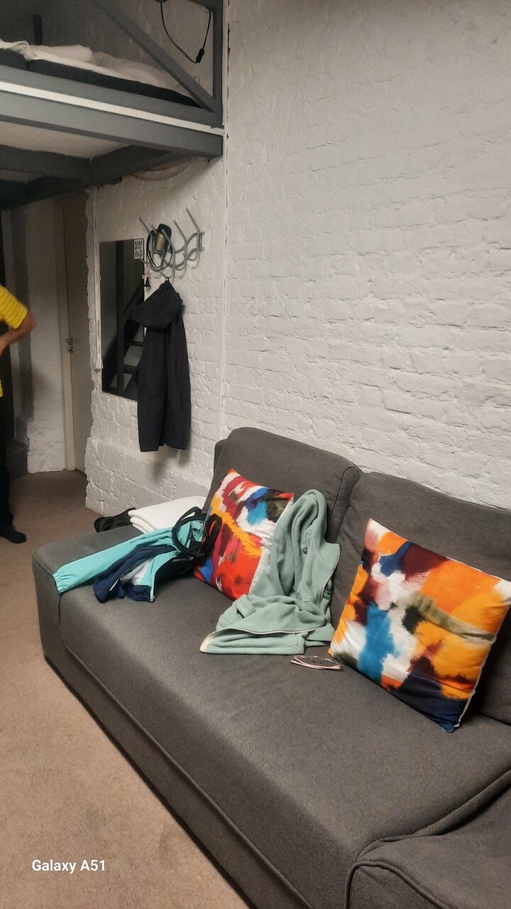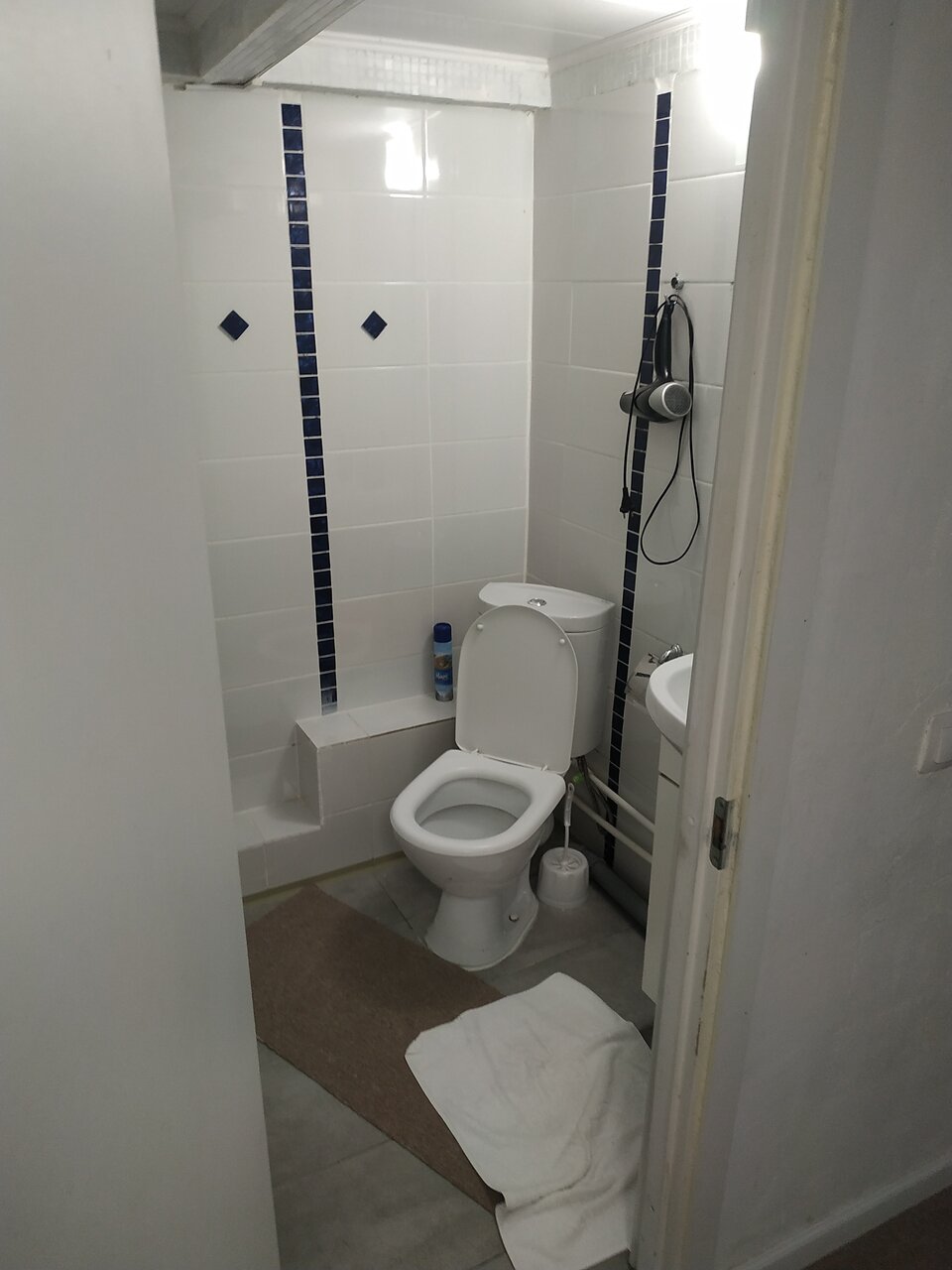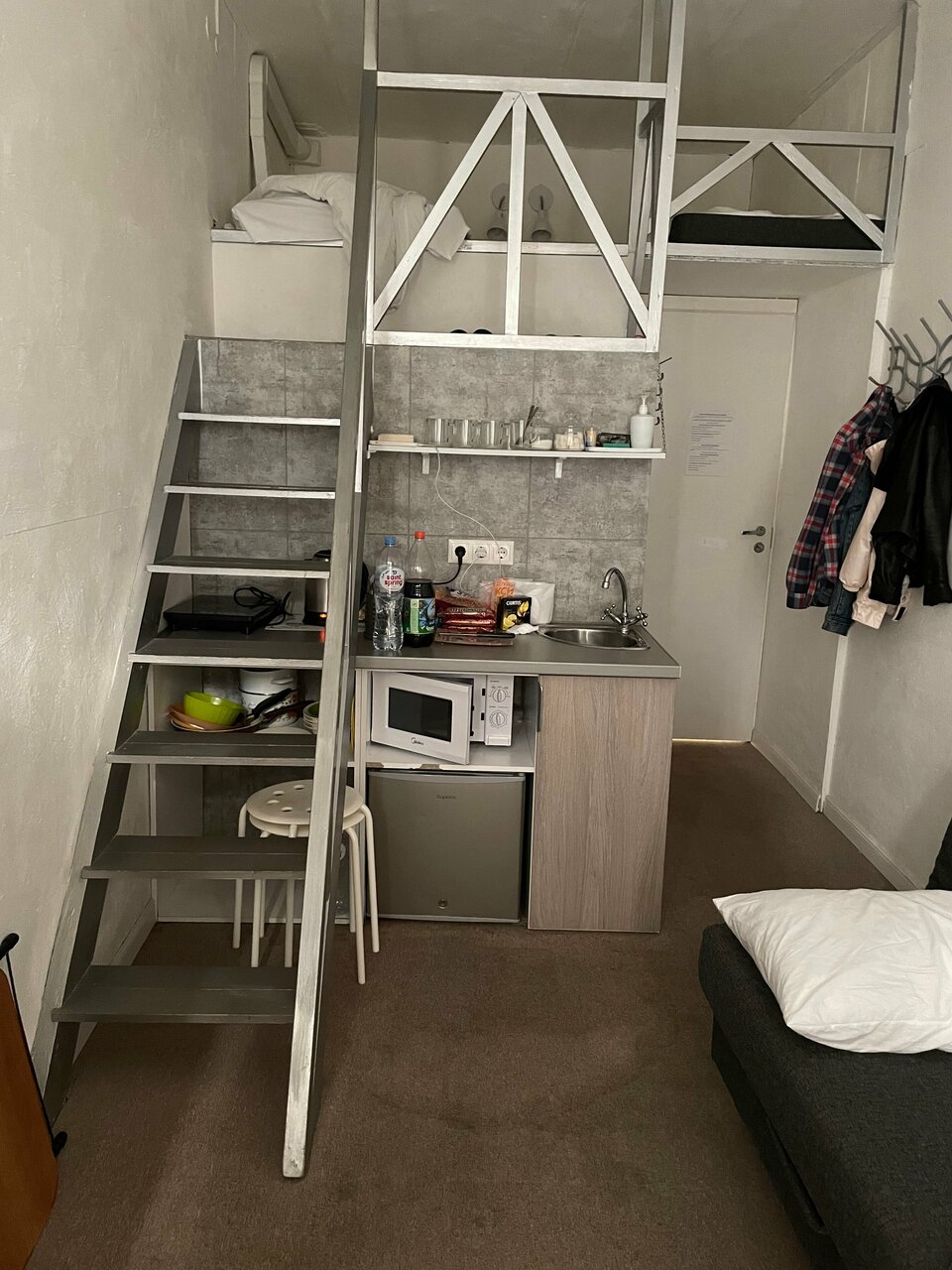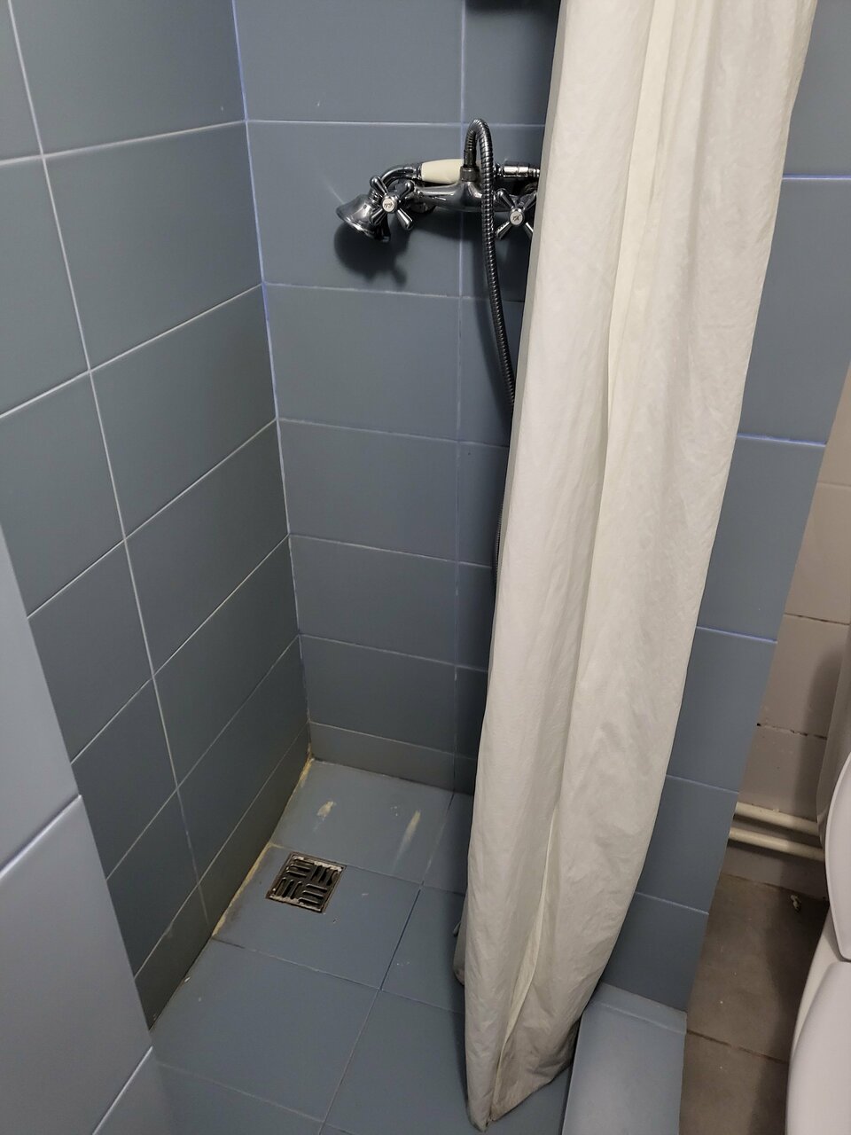 Комната 2. Душ просто дно: там сможет поместиться разве что ребенок, чтобы не задавать стены и шторку, которая находится у вас перед носом если ее закрыть. Душ меньше чем в Автодоме! При вставании с толчка вы бьетесь головой об потолок. Стены в душе усеяны волосками ( т.е. даже с душа не помыли при уборке ) В комнате воняет жиром, не удивительно, вытяжки на кухне нет — у кроватей над душем/кухней запах усиливается, матрасы пахнут картошкой фри. Складной стол в комнате протерли какой-то грязной тряпкой которая оставила разводы (только по центру), с краю стол остался грязный. Белье и полотенца еще более менее. НО ЗАПРАВЛЯТЬ КРОВАТЬ ВЫ ДОЛЖНЫ САМИ. Одеялам и подушкам уже пора на помойку, т.к. выглядят они именно так, как будто их из помойки и принесли — местами желтые, драные, с добавлением волосков. Очень грустно в общем. Не рекомендую.