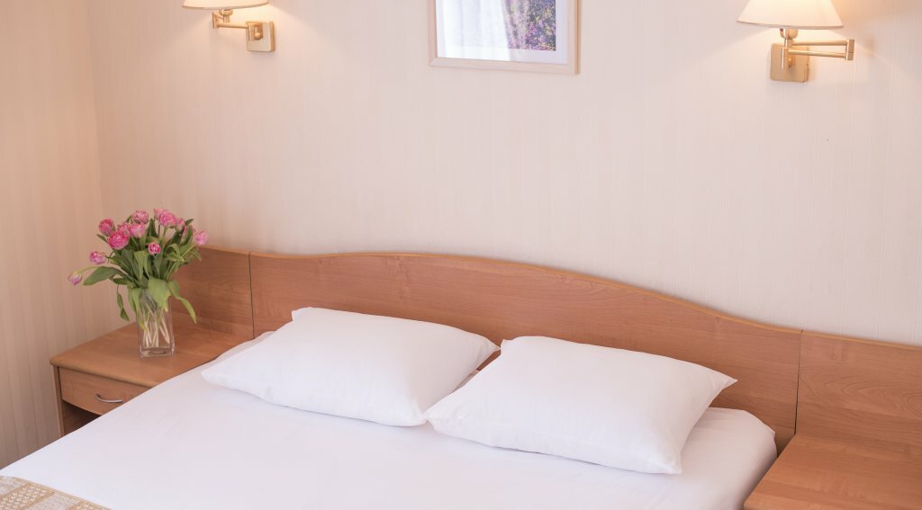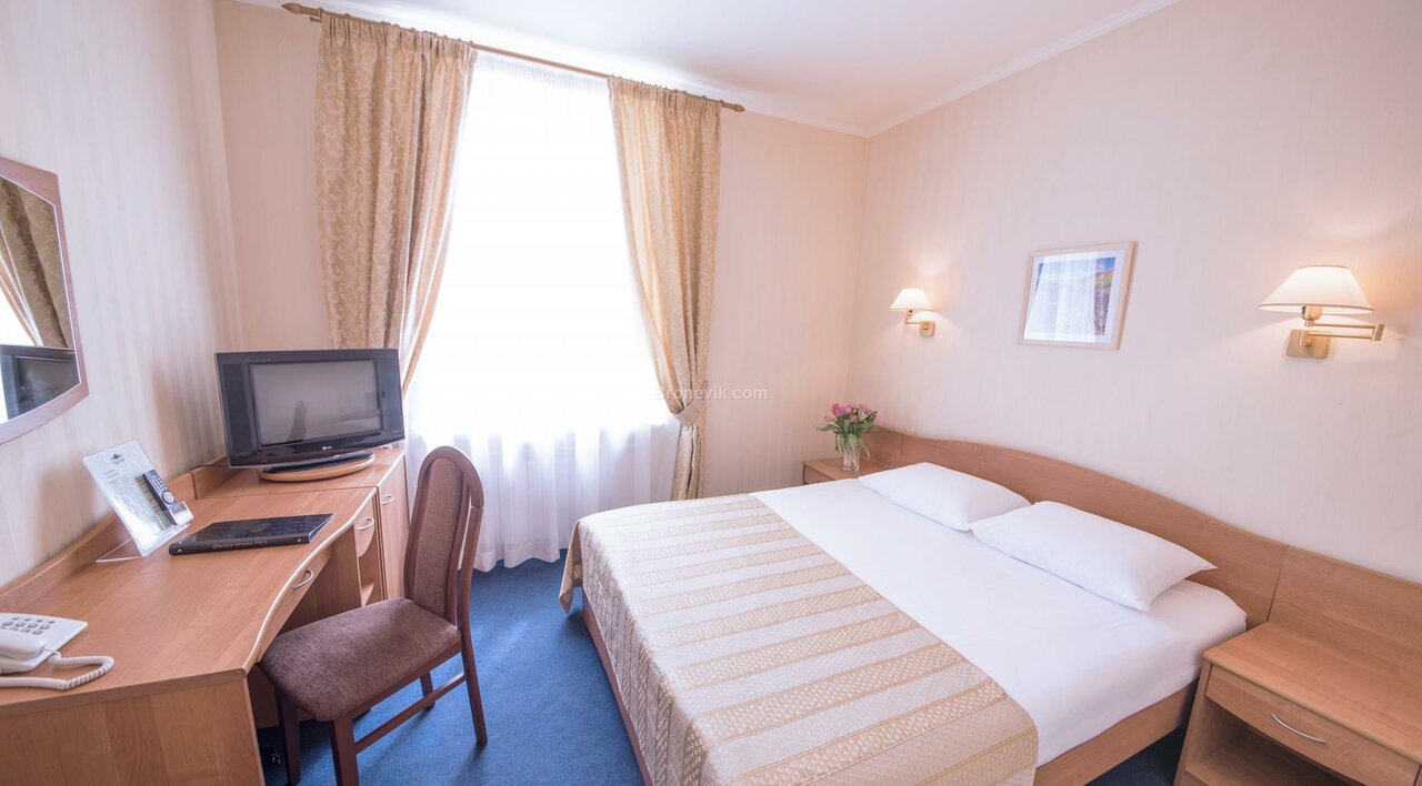 Останавливались на три ночи (три человека), в четырехместном номере. Удобства (душ, туалет, гладильная доска и утюг) на этаже. Есть кулер с горячей-холодной водой (на этаже). Завтрак (шведский стол) можно оплатить вместе с проживанием, чем мы и воспользовались, что бы с утра не разыскивать где бы поесть. В целом, отель хорошо справляется на свои две звёздочки. Постель удобная и чистая, завтрак хороший. Если уж очень придраться, то это старая мебель и негде сушить вещи (эту проблему нам помогли решить горничные). Пожалуй всё. В отеле много детей, но они нам совершенно не мешали). Для непритязательных туристов отель рекомендую.