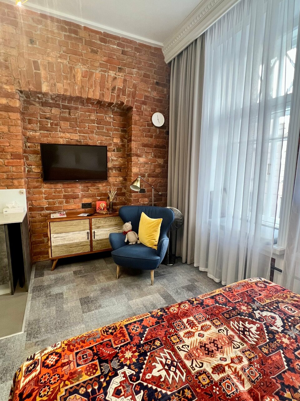 Отличный отель, мы размещались втроем, и номера подходят для этого идеально. 1)Чисто, уютно и есть все необходимое. Даже если вам чего-то не хватит, вам обязательно помогут. Интерьер очень стильный и приятный! Продумано все до мелочей. 2) Персонал удивительной вежливости. Всегда готовы помочь и подсказать! 3) Расположение максимально удобное, в шаговой доступности рестораны, магазины и туристический центр. Гостиница в знаменитом Довлатовском доме, памятник виден из окна. Кто-то писал про шум на улице, да Рубинштейна не самая спокойная ночная улица(вы же знали это и так),но если окна закрыты(а в номере есть кондиционер), то шум с улицы вас не побеспокоит ни на секунду. Безумно рады, что нашли это место и все следующие поездки будем останавливаться именно тут. Выше всяких похвал!