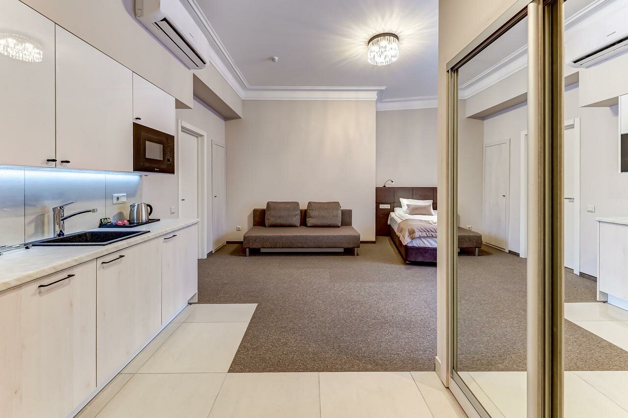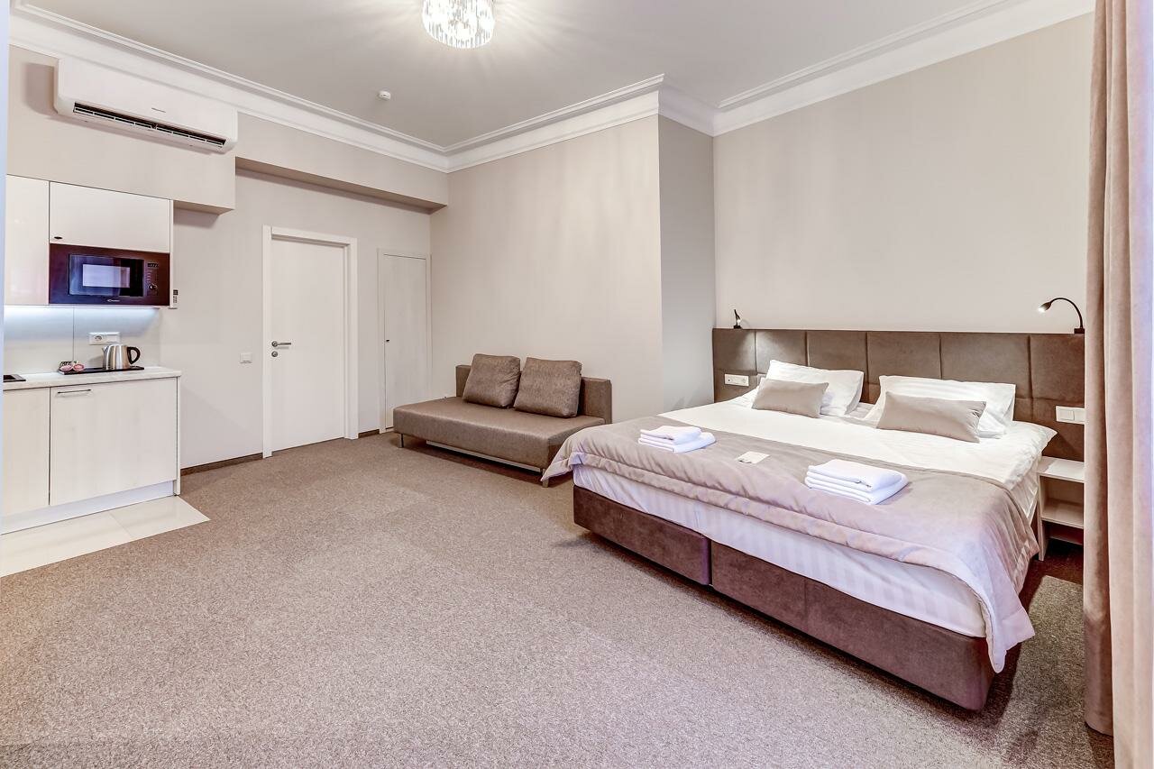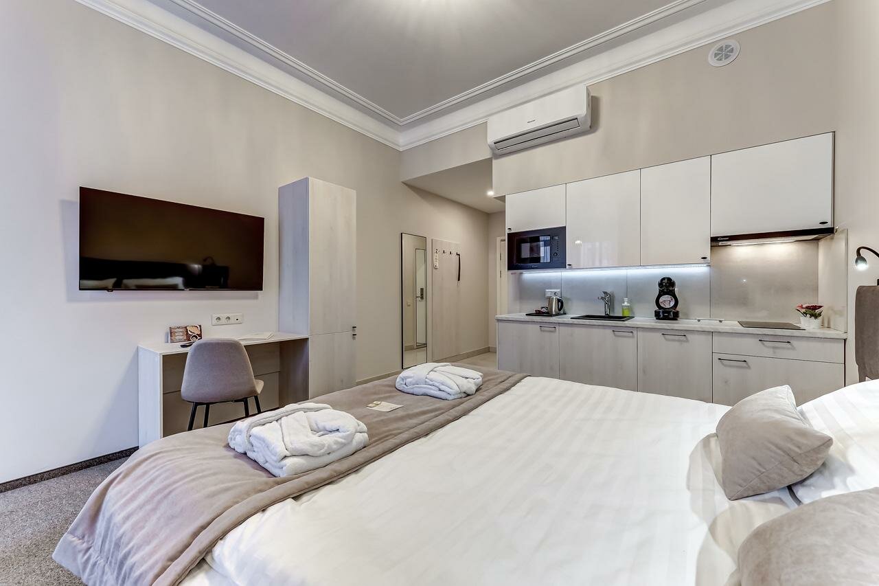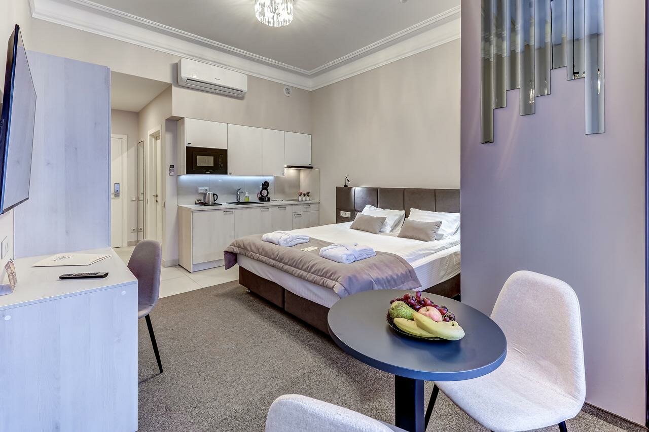 Просторные и чистые апартаменты. Находятся практически в гастрономическом центре Питербурга. Теплый пол в ванной достоин особого упоминания. Я бы добавила еще воду в номер и зубную пасту в тюбиках, а не в пакетиках. Ну и для идеальности кондиционер для волос. А так очень хорошо. Для длительного проживания есть стиральная машинка.