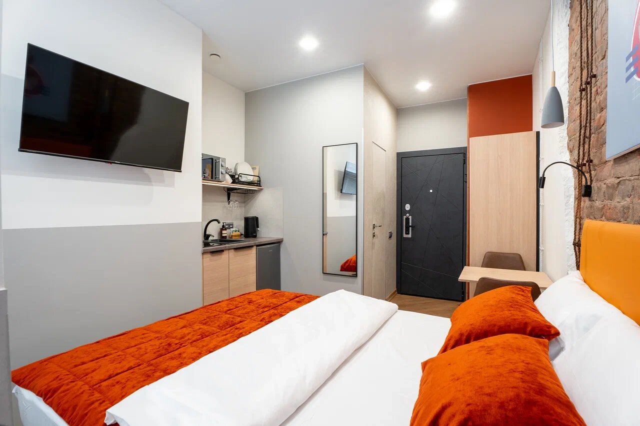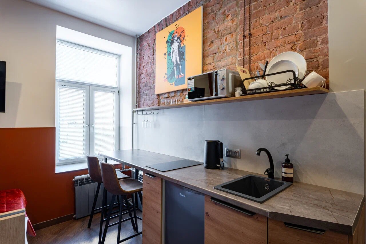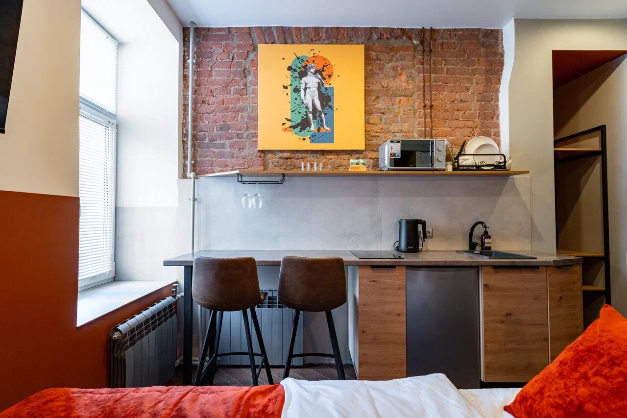 Останавливались на день в апартаментах. Уютная, небольшая комната на двоих) есть все необходимое: большая кровать с удобным матрасом, мини-кухня с раковиной, эл плитой, чайником, микроволновкой, холодильником. В душевой комнате небольшой умывальник, мыло, гель для душа и даже крем для рук) Чисто! Уютно! То, что надо для — закинуть вещи и пойти гулять по чудесному городу) Апартаменты в 10 минутах ходьбы от Московского вокзала. Нашла легко по фото, которые скинул вежливый менеджер) нам пошли навстречу и заселили пораньше спасибо Вам большое!