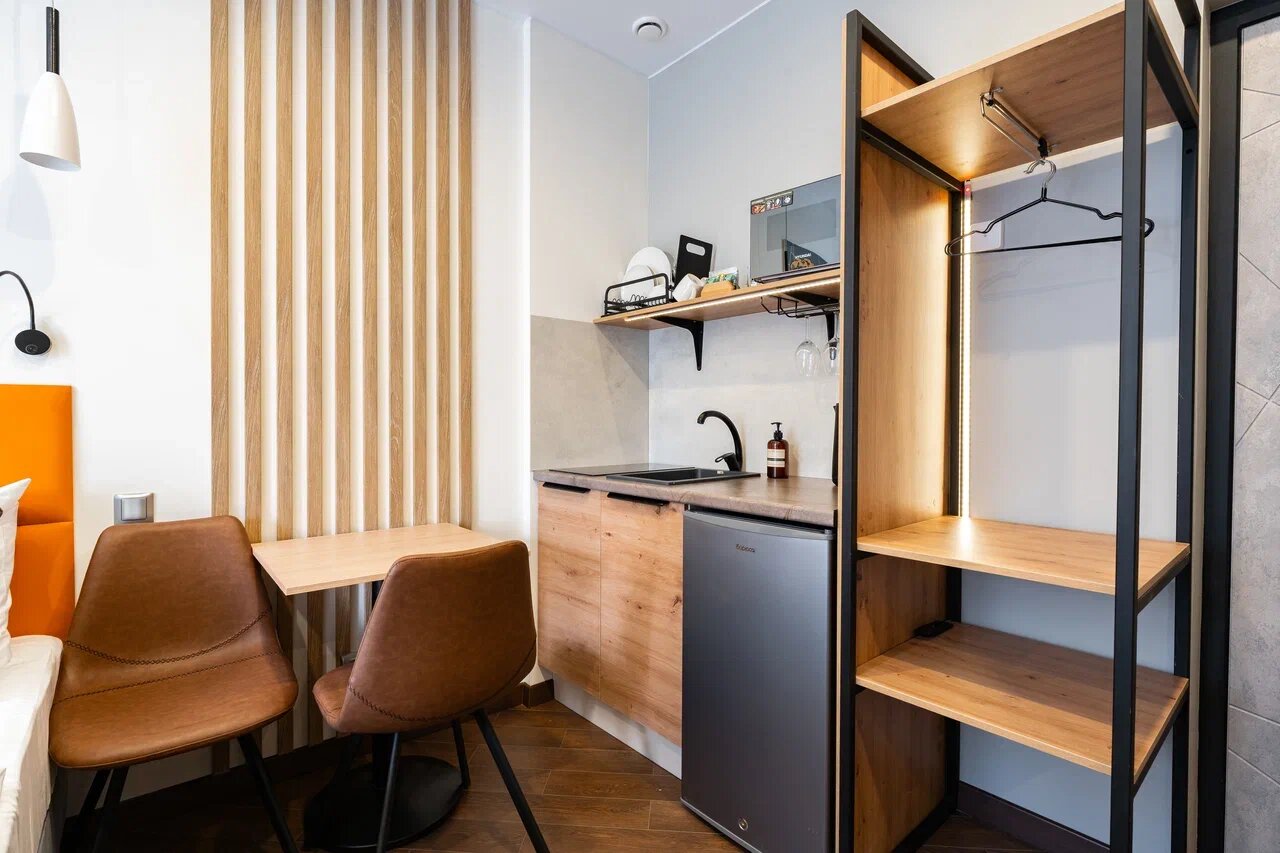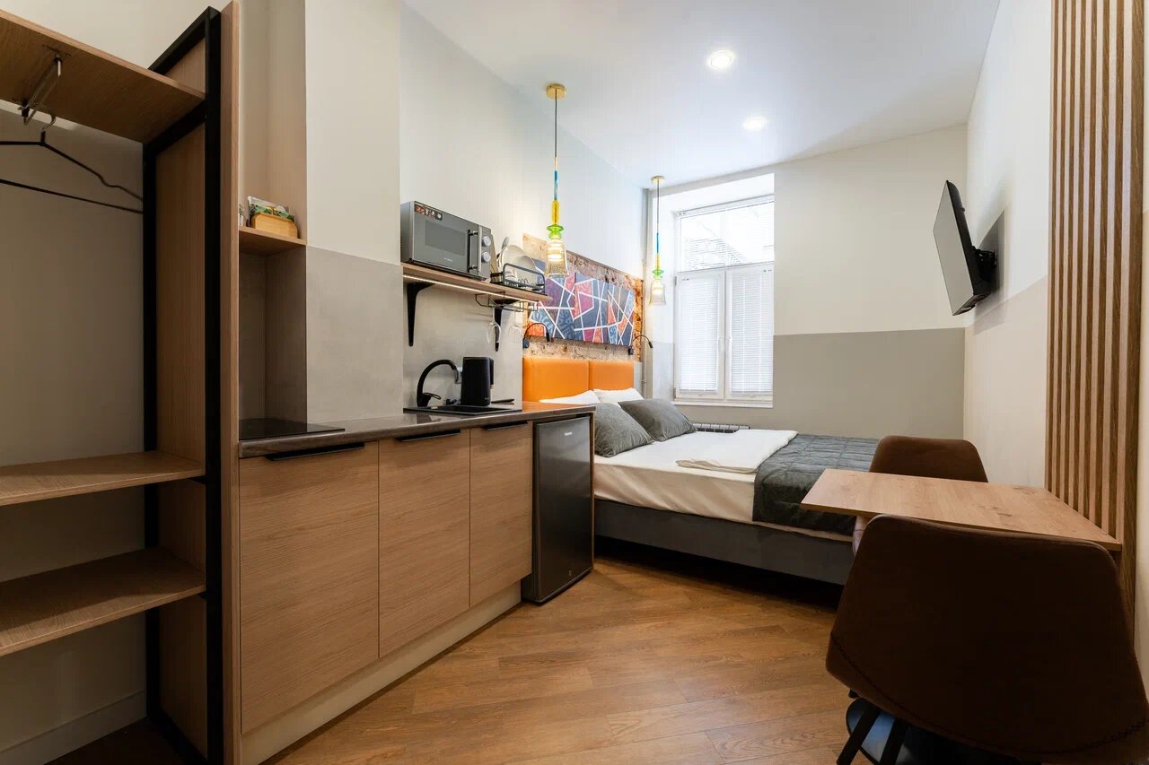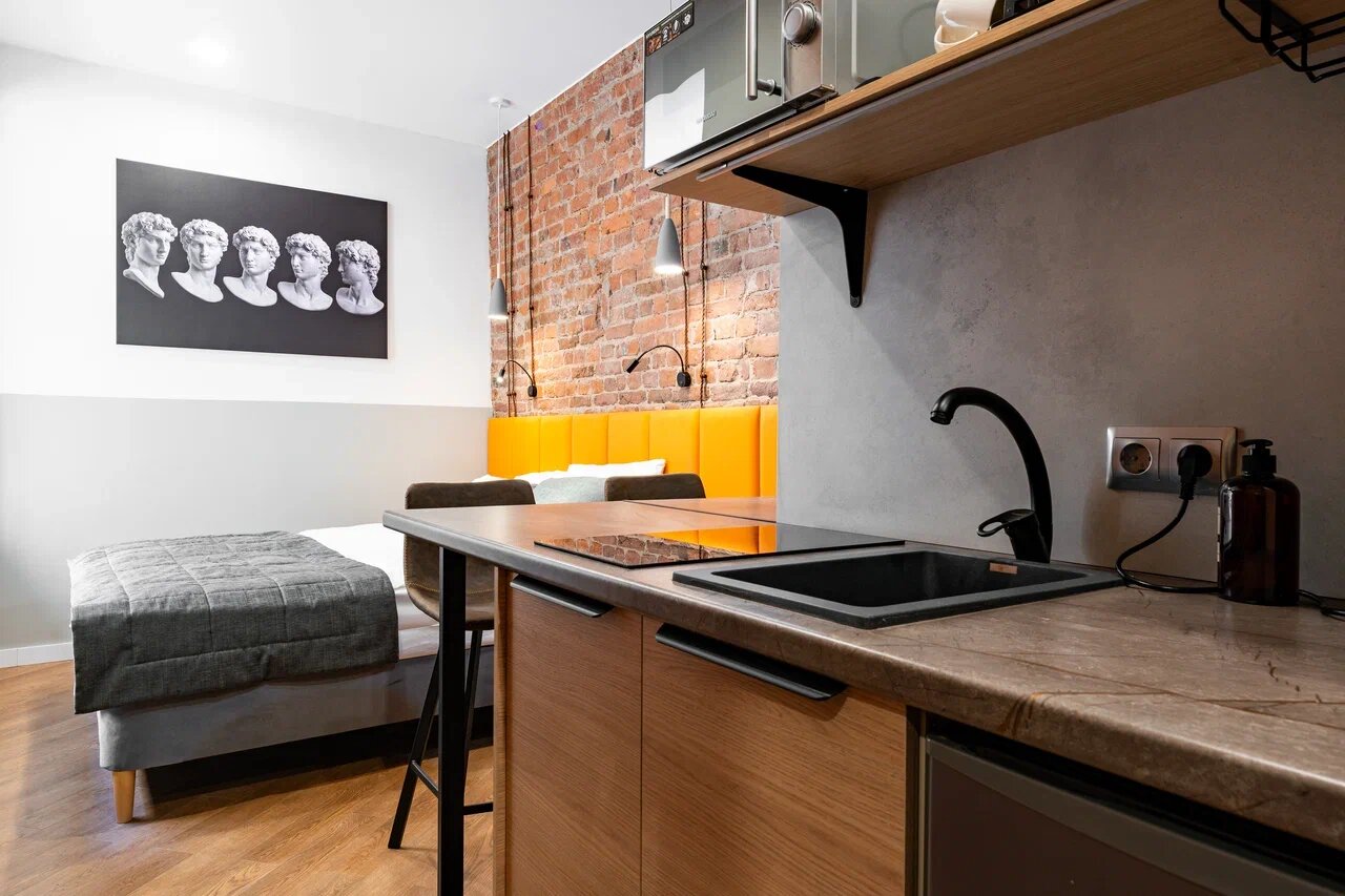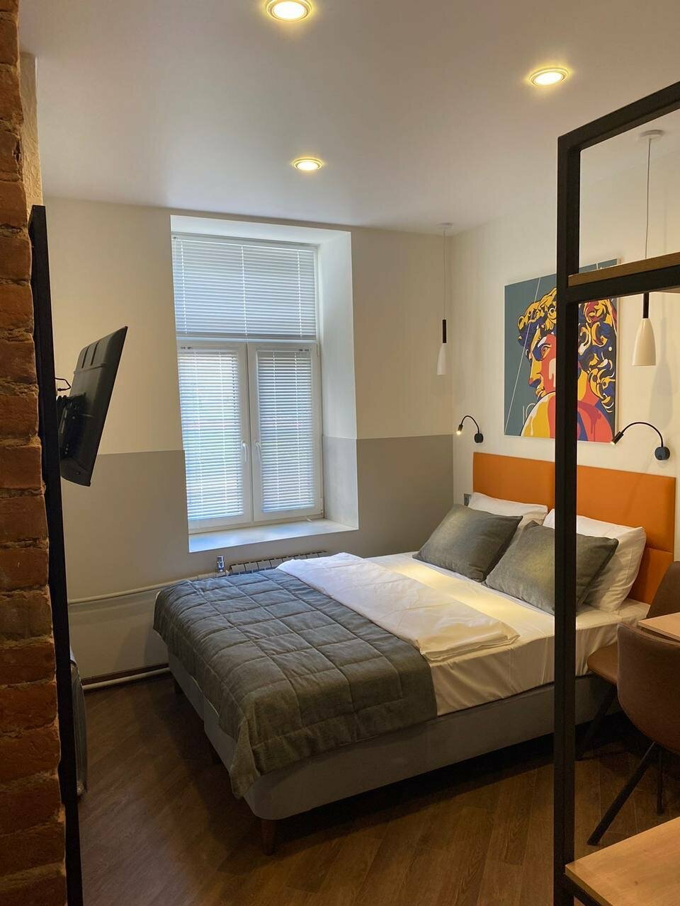 Останавливались на день в апартаментах. Уютная, небольшая комната на двоих) есть все необходимое: большая кровать с удобным матрасом, мини-кухня с раковиной, эл плитой, чайником, микроволновкой, холодильником. В душевой комнате небольшой умывальник, мыло, гель для душа и даже крем для рук) Чисто! Уютно! То, что надо для — закинуть вещи и пойти гулять по чудесному городу) Апартаменты в 10 минутах ходьбы от Московского вокзала. Нашла легко по фото, которые скинул вежливый менеджер) нам пошли навстречу и заселили пораньше спасибо Вам большое!