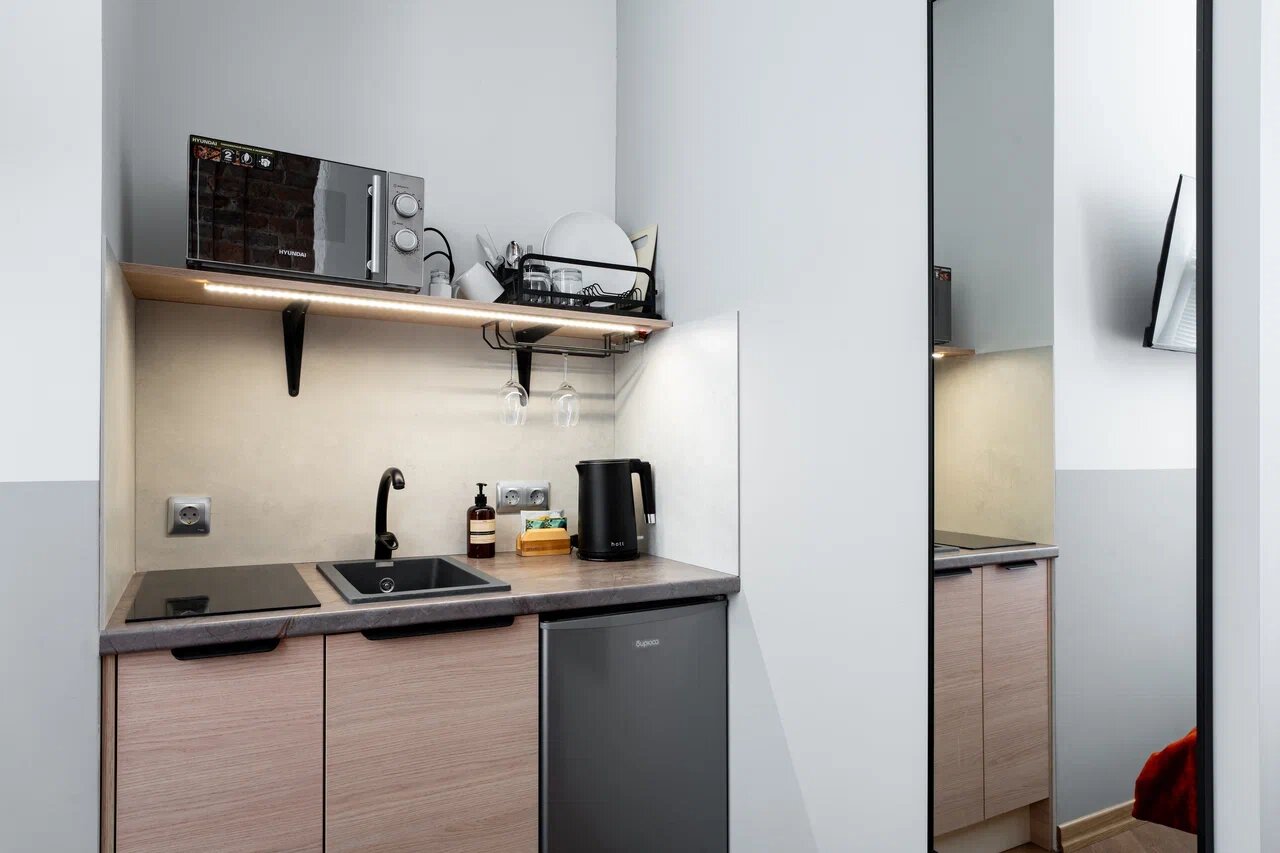 - Мини-кухня с раковиной, электроплитой, чайником, микроволновкой, холодильником.