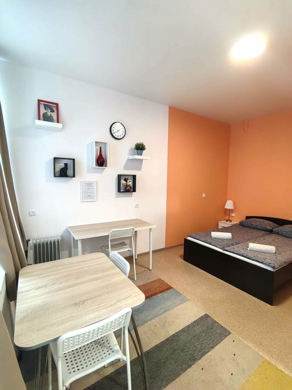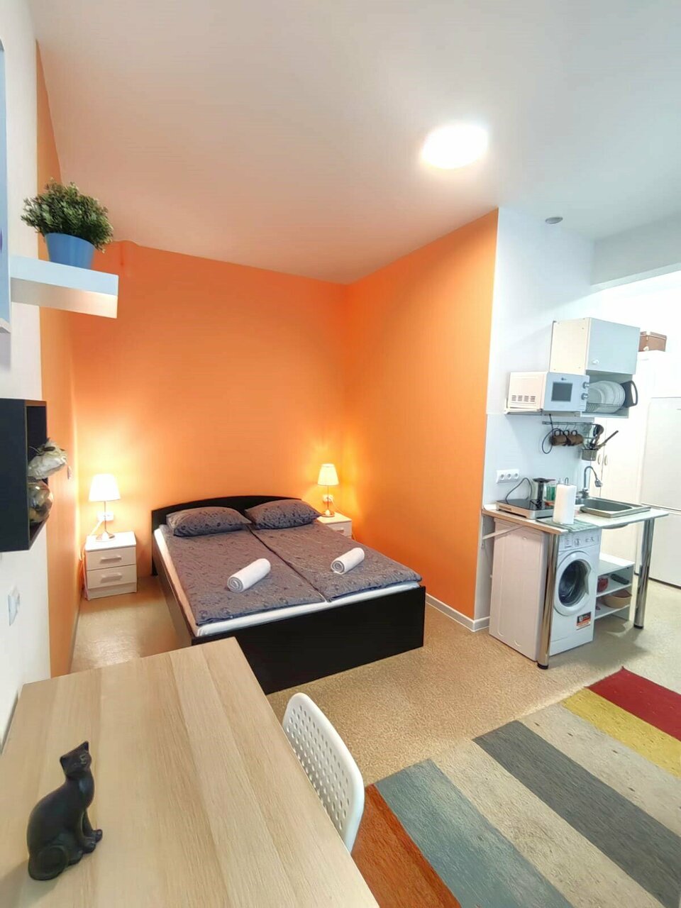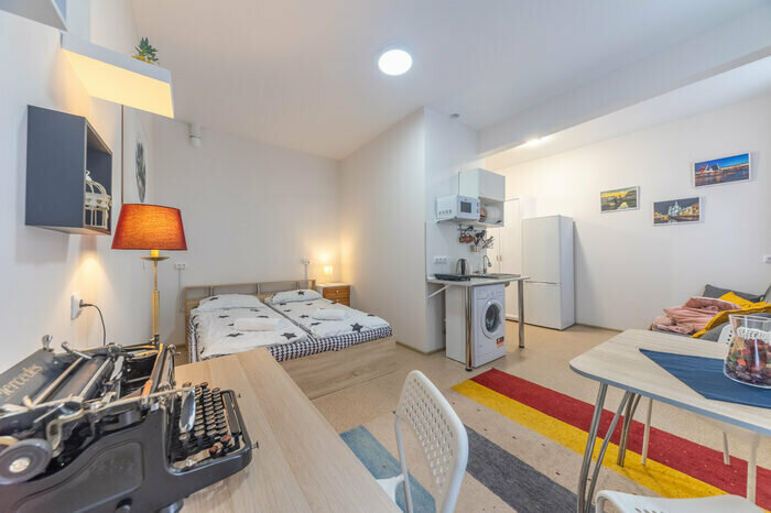 Лучшее место для семейного отдыха и не только! Весь центр в шаговой доступности, для более дальних расстояний — рядом метро. В самой студии есть всё для комфортного проживания! Можно и приготовить (есть вся необходимая для этого посуда) и вещи постирать/посушить/погладить. Рядом куча кафешек на любой вкус! Были с ребёнком, довольны очень! Соседей не слышали, хотя они точно были. В номере есть санузел — душ и туалет. Из окон вид во двор, тихий и спокойный, хотя в 3х минутах ходьбы есть ТЦ. Рядом так же круглосуточные магазины.